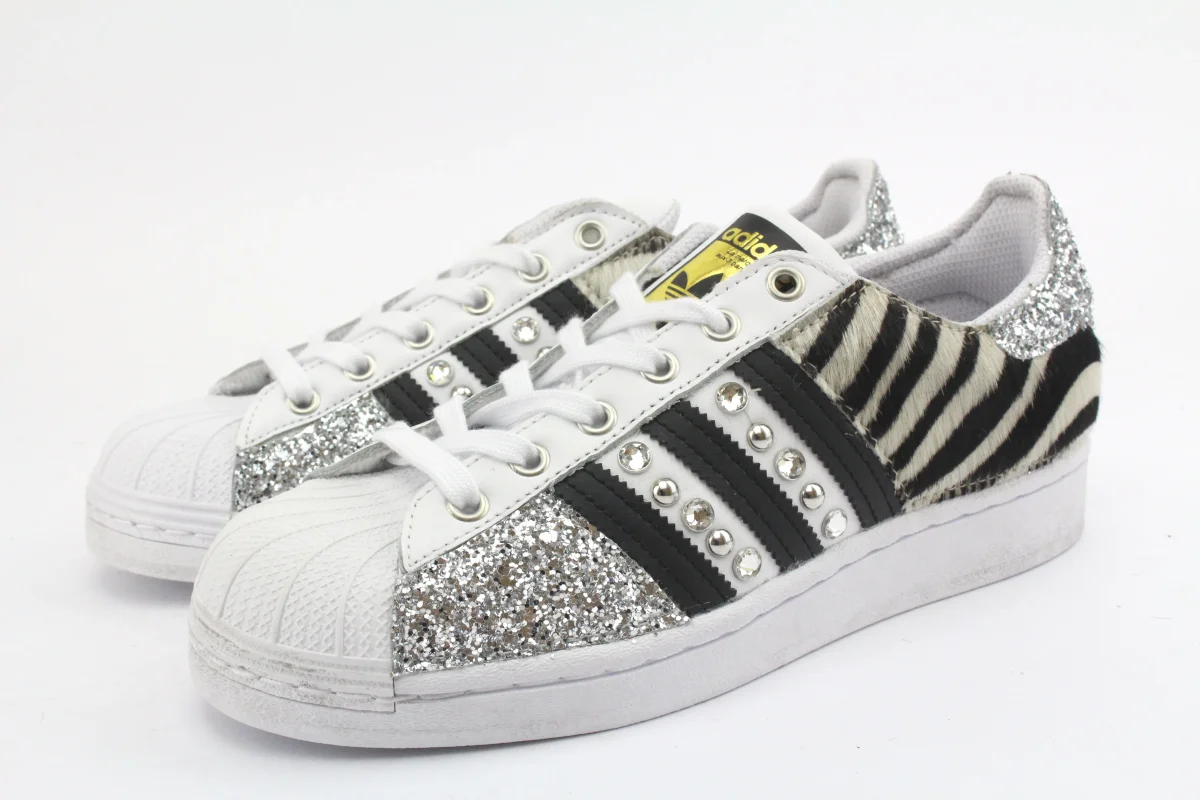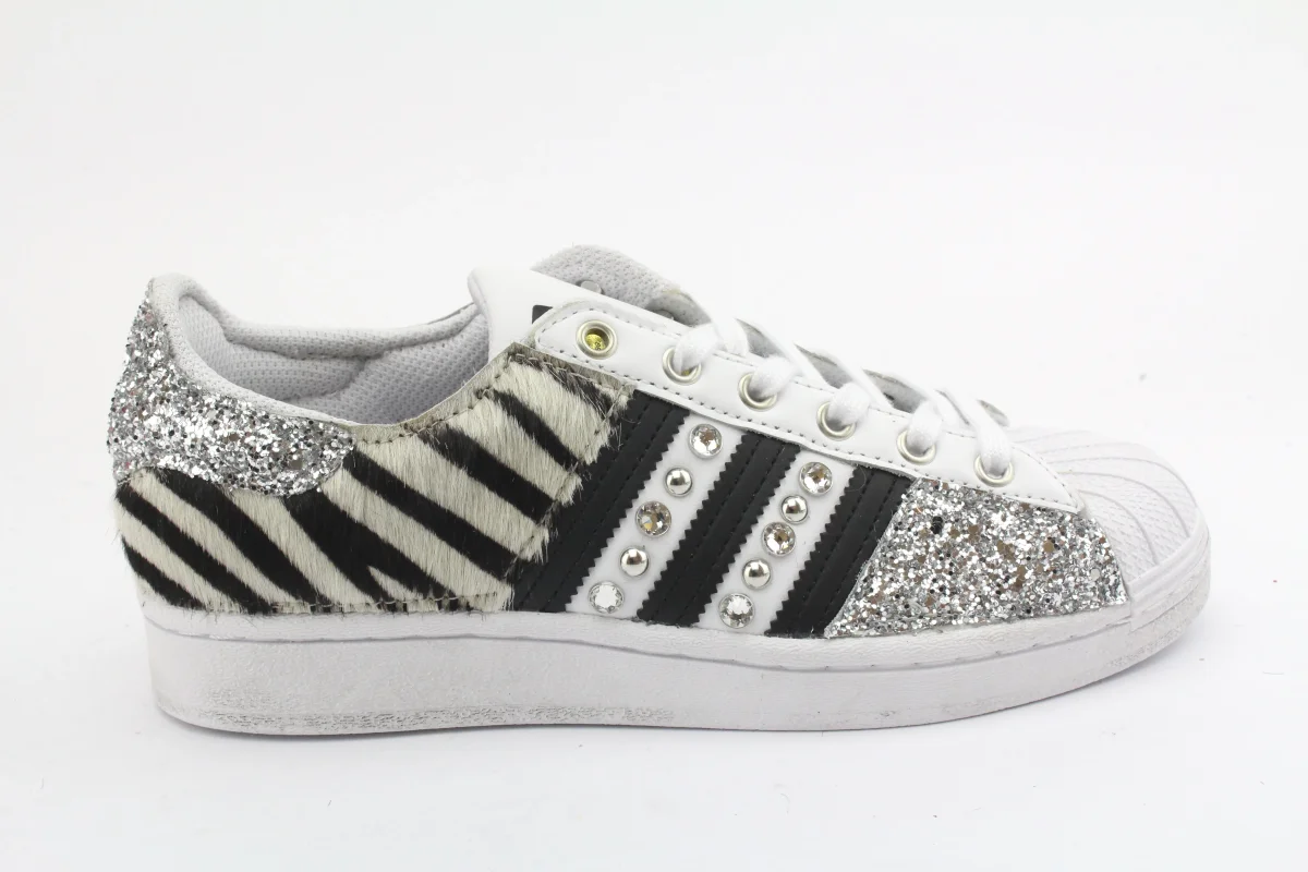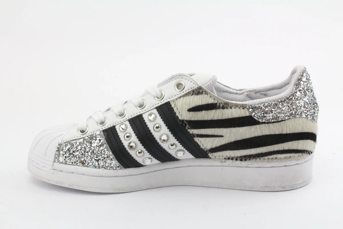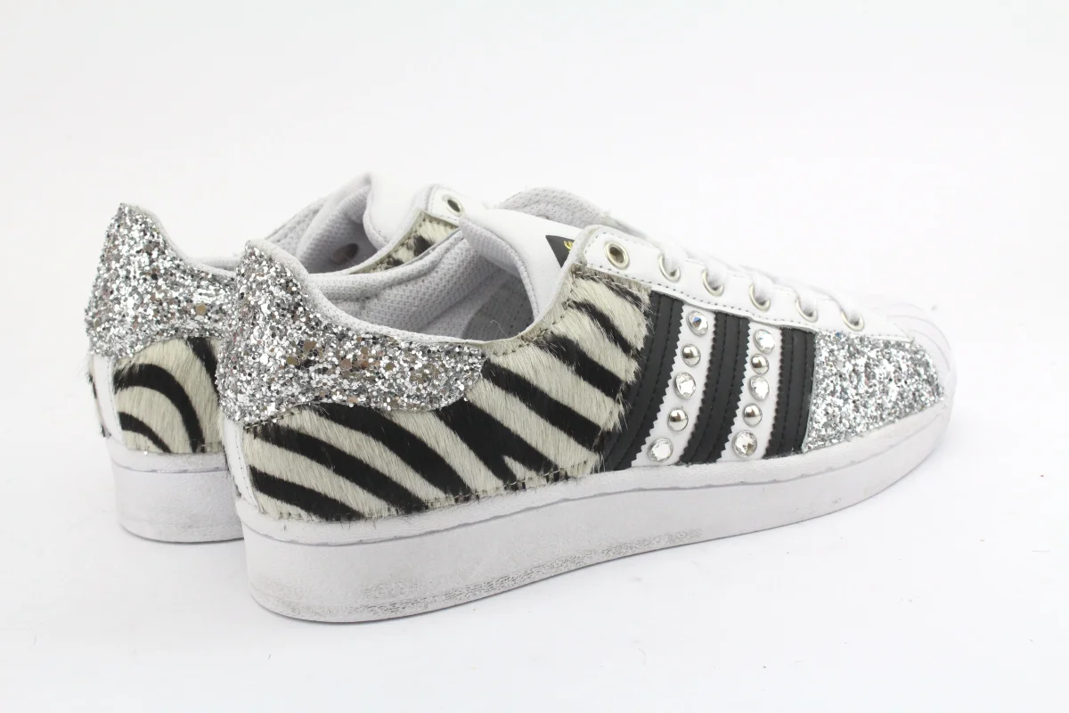 Sneakers originali Adidas Superstar personalizzate a mano con applicazione di cavallino zebrato glitter borchie e strass su pareti laterali.
