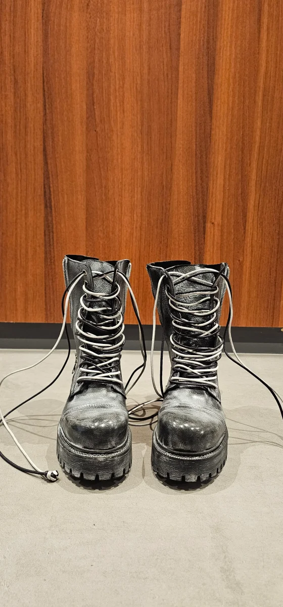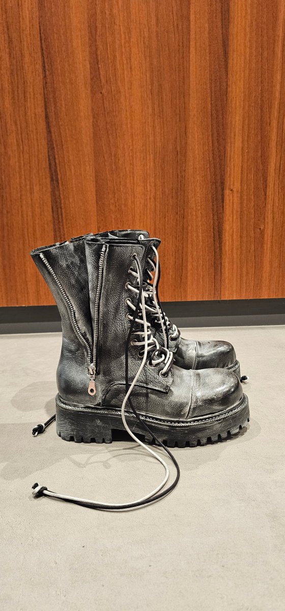 Anfibi in nabuk nero spazzolato a mano effetto vintage in bianco, doppio laccio in due colori, cerati, con doppia zip ai lati, la particolarità di questo anfibio sono le punte e la doppia apertura ai lati, puoi cambiare lo stile dell’anfibio, se tenerlo classico stretto aderente alla caviglia, o largo di tendenza, suola in gomma nera spazzolata, altezza 5. Calzano comode, punta tonda. Calzature artigianali, made in Italy.