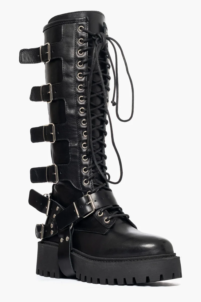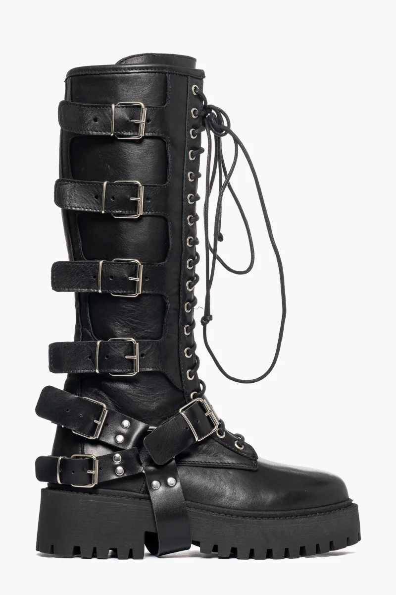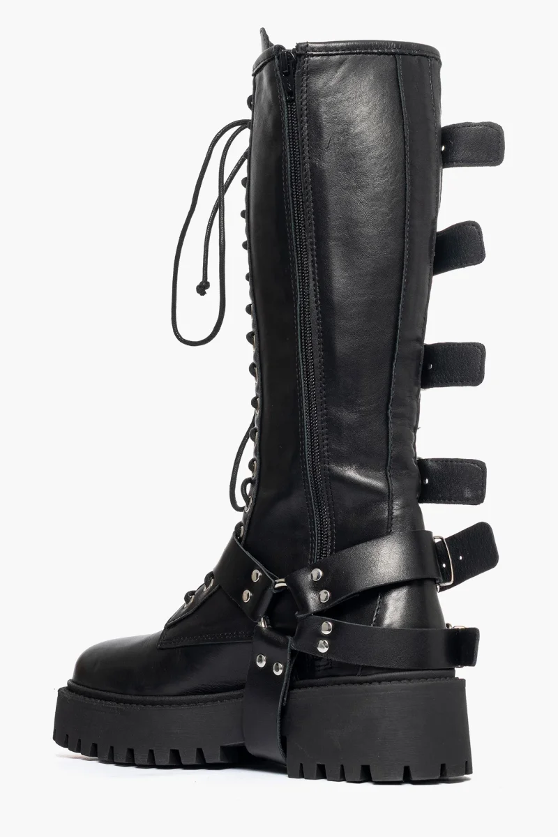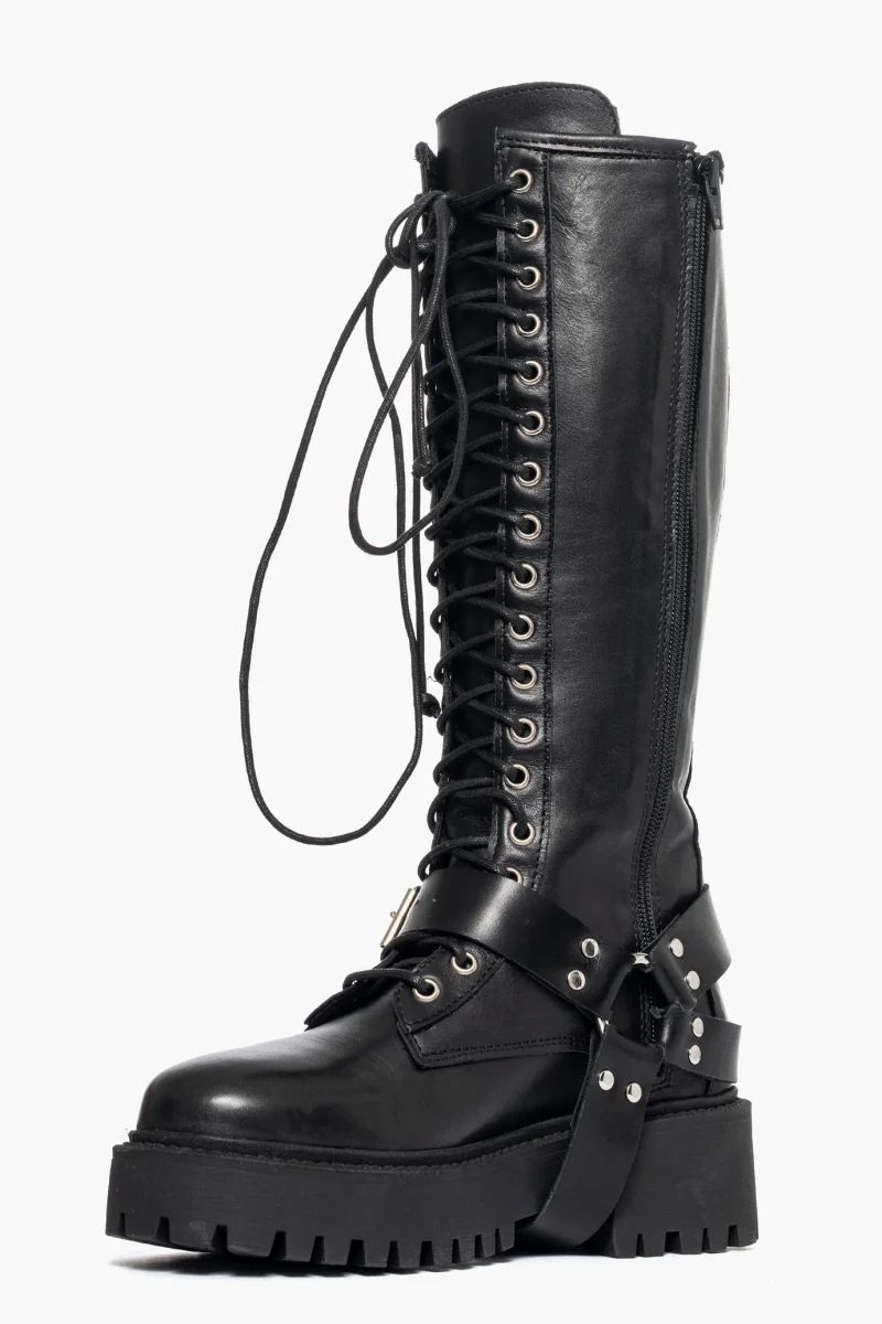 Anfibi sotto al ginocchio della nuova collezione, in pelle nero con accessori nel colore argento, cerniera interno piede per facilitare la calzata, con lacci ed occhielli neri, suola in pvc nero, 5. Calzano regolari, punta tonda, interni in similpelle, calzature artigianali, made in Italy.