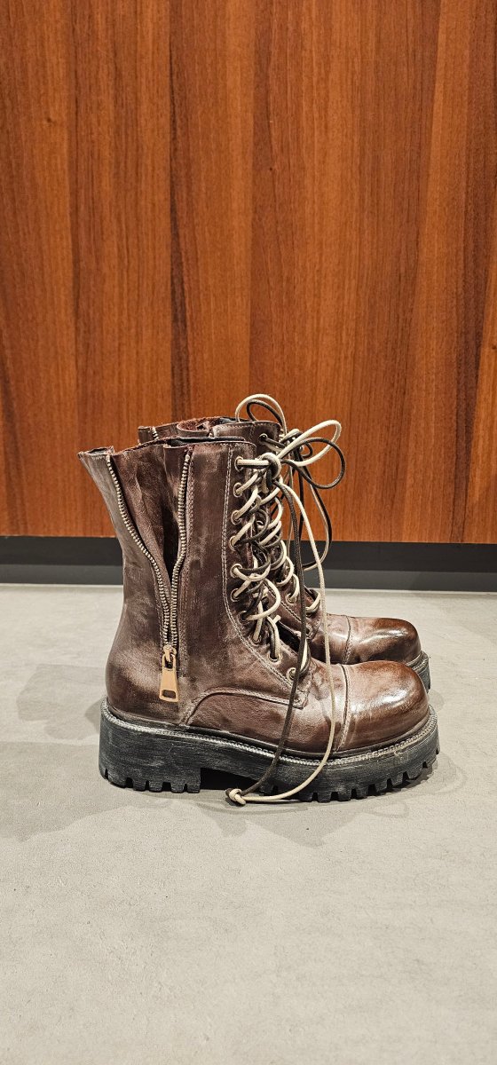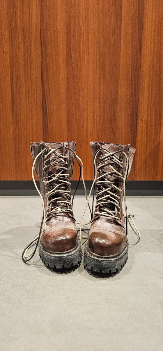 Anfibi in pelle testa di moro spazzolato a mano effetto vintage in beige, doppio laccio in due colori, cerati, con doppia zip ai lati, la particolarità di questo anfibio sono le punte e la doppia apertura ai lati, puoi cambiare lo stile dell’anfibio, se tenerlo classico stretto aderente alla caviglia, o largo di tendenza, suola in gomma nera spazzolata, altezza 5. Calzano comode, punta tonda. Calzature artigianali, made in Italy.