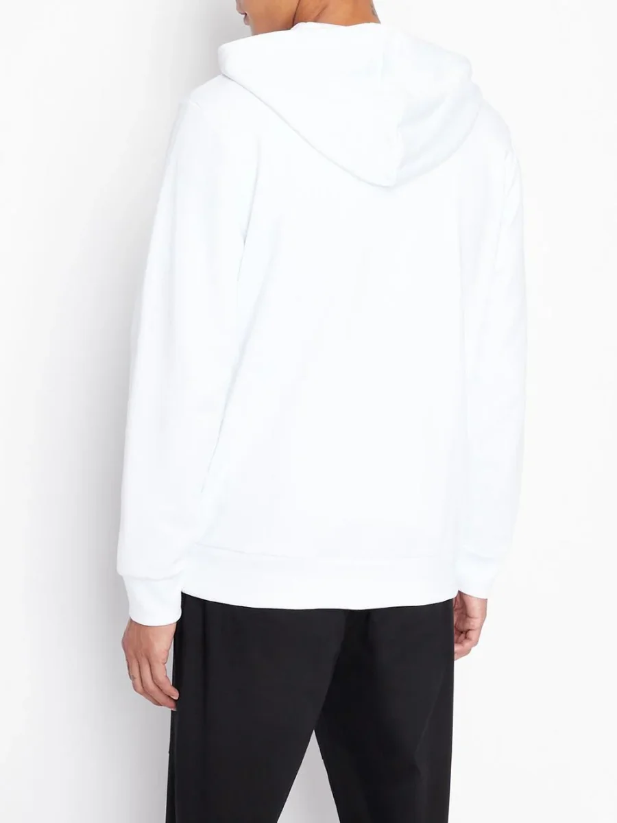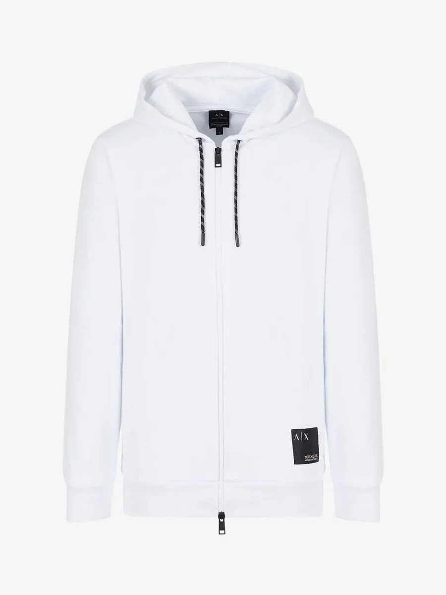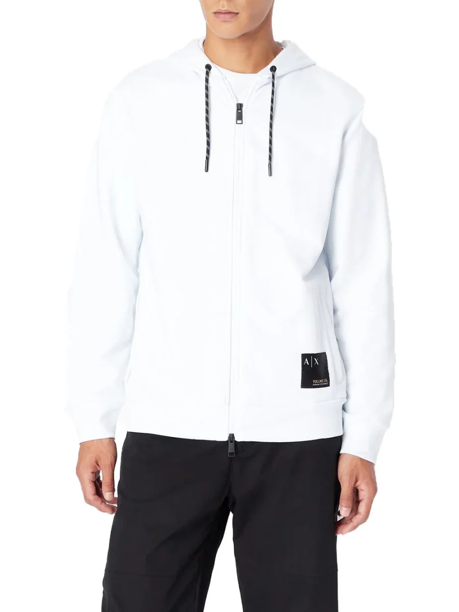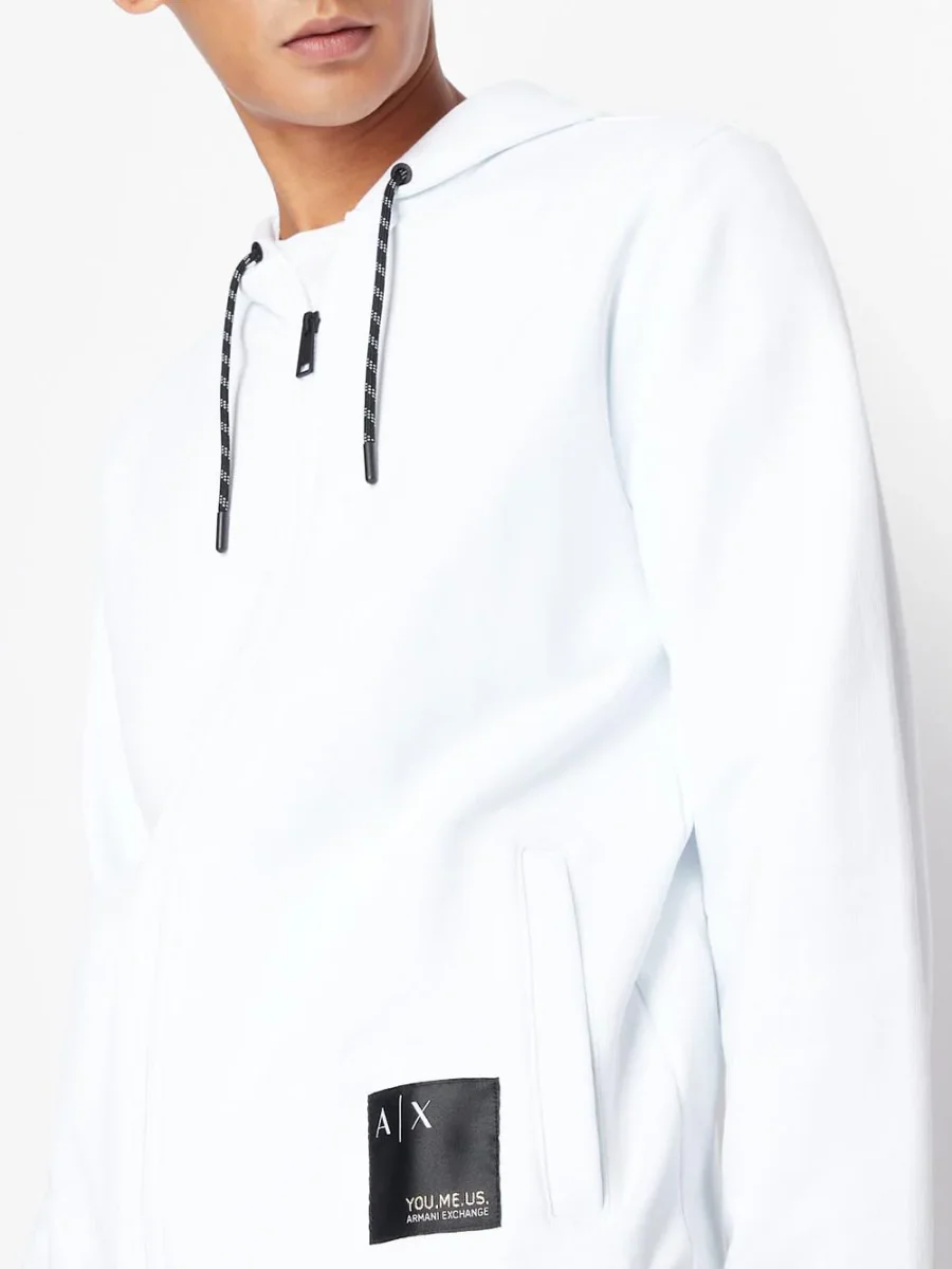 Felpa in puro cotone con cappuccio regolato da coulisse e chiusura zip a doppio cursore. Tasche a filo sui fianchi e patch porta logo in contrasto a lato sul fondo. ARMANI EXCHANGE 6LZMAW ZJFAZ1100