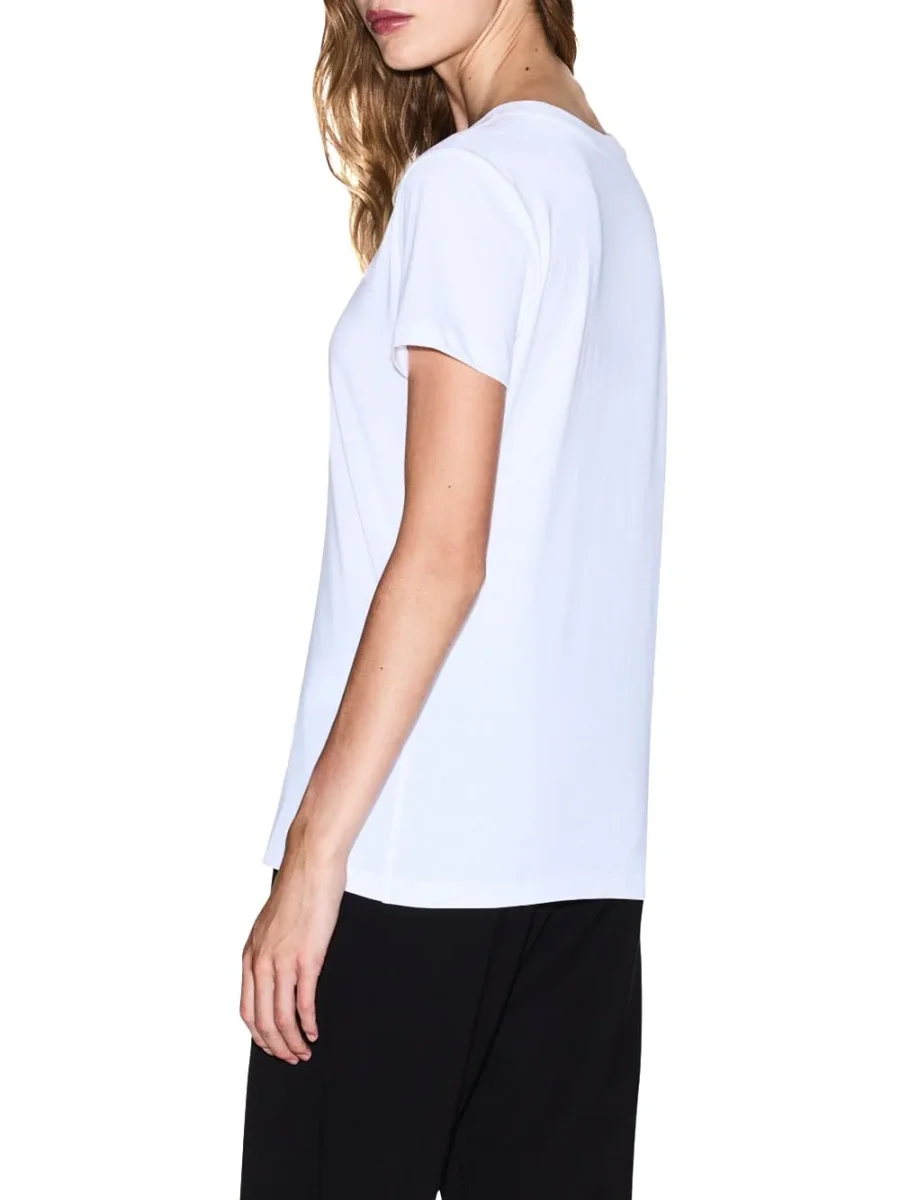 Questa T-shirt è ideale per creare look versatili e alla moda. Puoi abbinarla con un paio di jeans per un outfit casual, oppure con una gonna a tubino e un blazer per un effetto più elegante. Se desideri un look sportivo, indossala con pantaloni jogger e sneakers. La sua semplicità e il colore bianco fanno di questo modello un vero e proprio jolly nel tuo guardaroba, capace di adattarsi a diversi stili e occasioni.