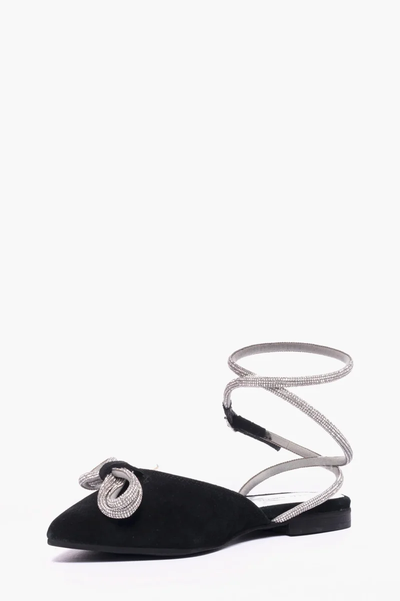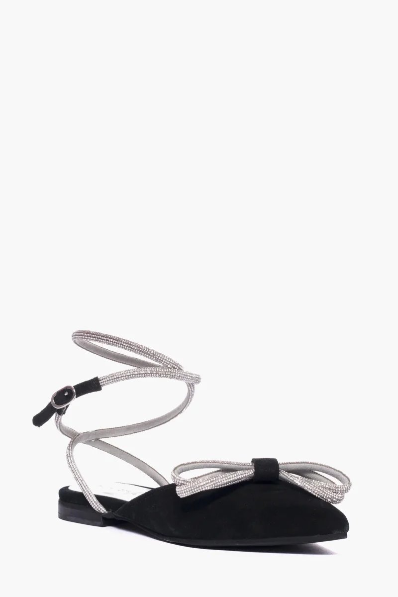 Bambolina aperta Francesca con doppio fiocco in strass e cinturino alla caviglia con fibbietta nel colore argento, in camoscio nero, interni in similpelle, sottopiede in camoscio nero, suola in thunit nel colore nero, altezza 2 cm. Calzata giusta, punta leggermente stretta in avanti. Calzature realizzate artigianalmente, rigorosamente made in Italy.