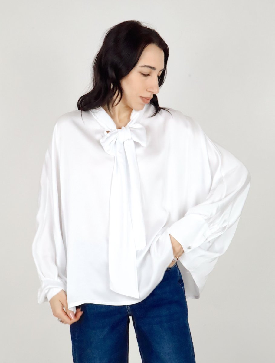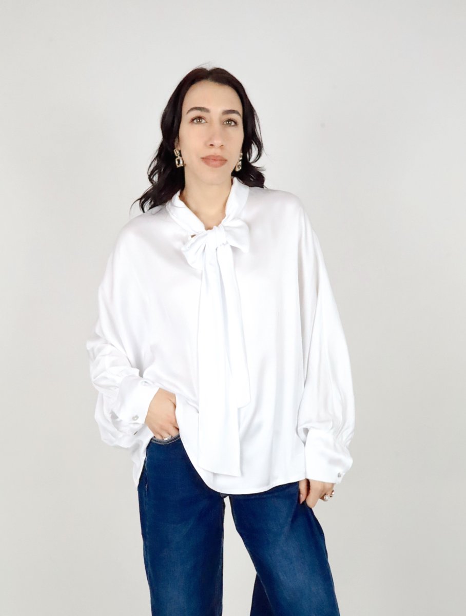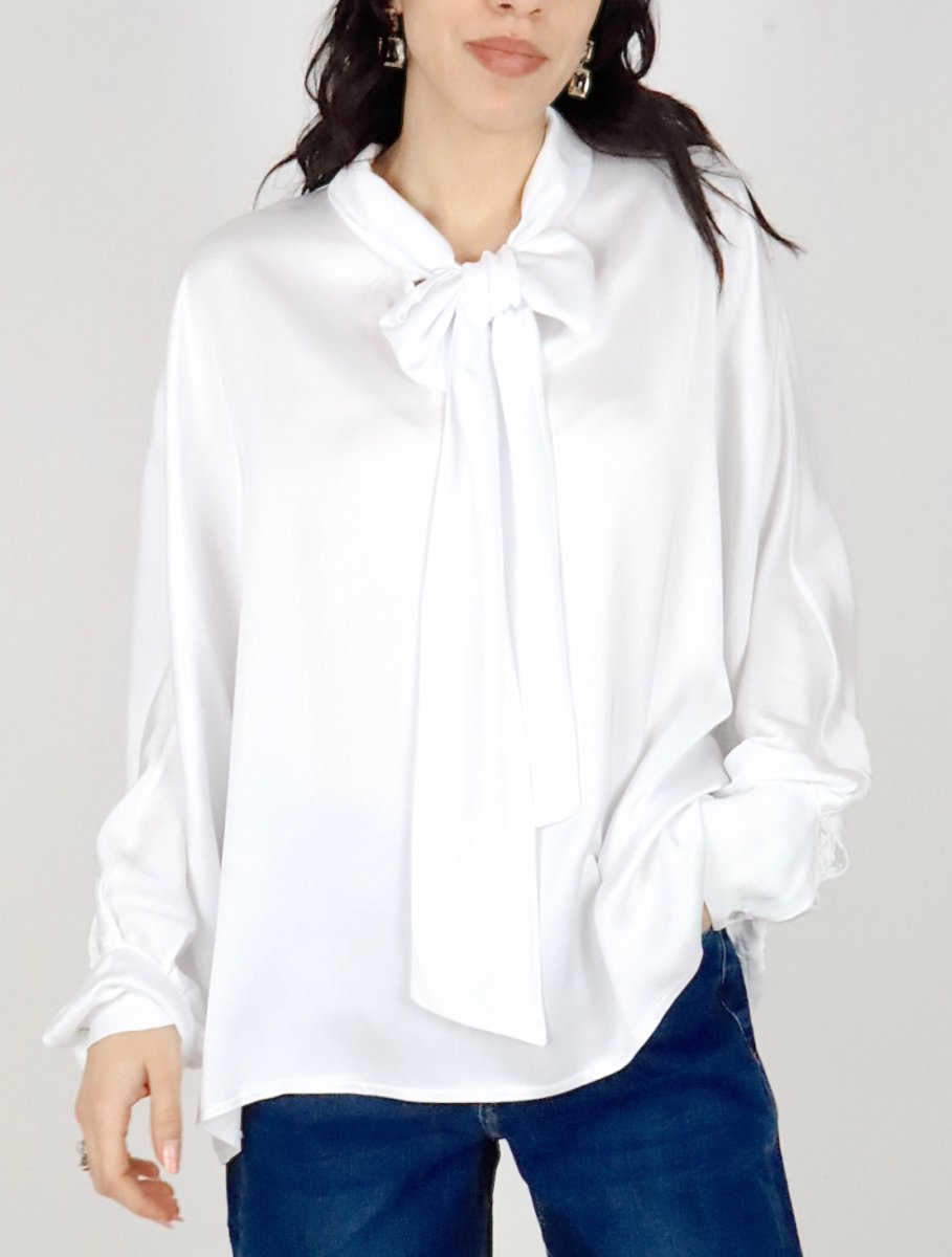 Blusa in raso di viscosa elegante e raffinata, caratterizzata da una linea morbida e fluida che cade delicatamente sulla figura. Il protagonista è il fiocco al collo, che dona un tocco romantico e sofisticato al capo.