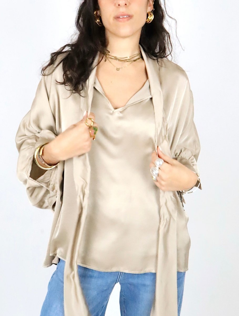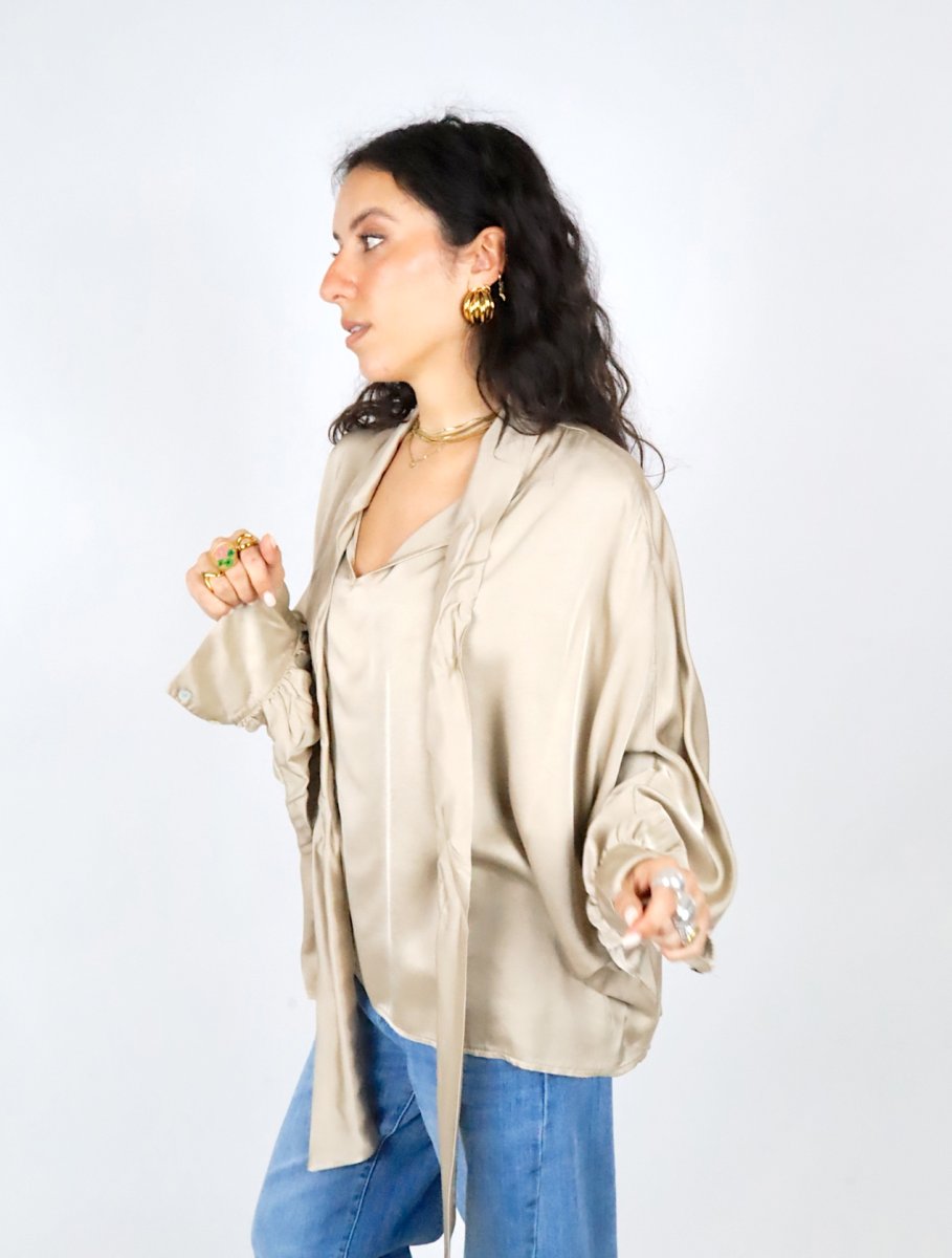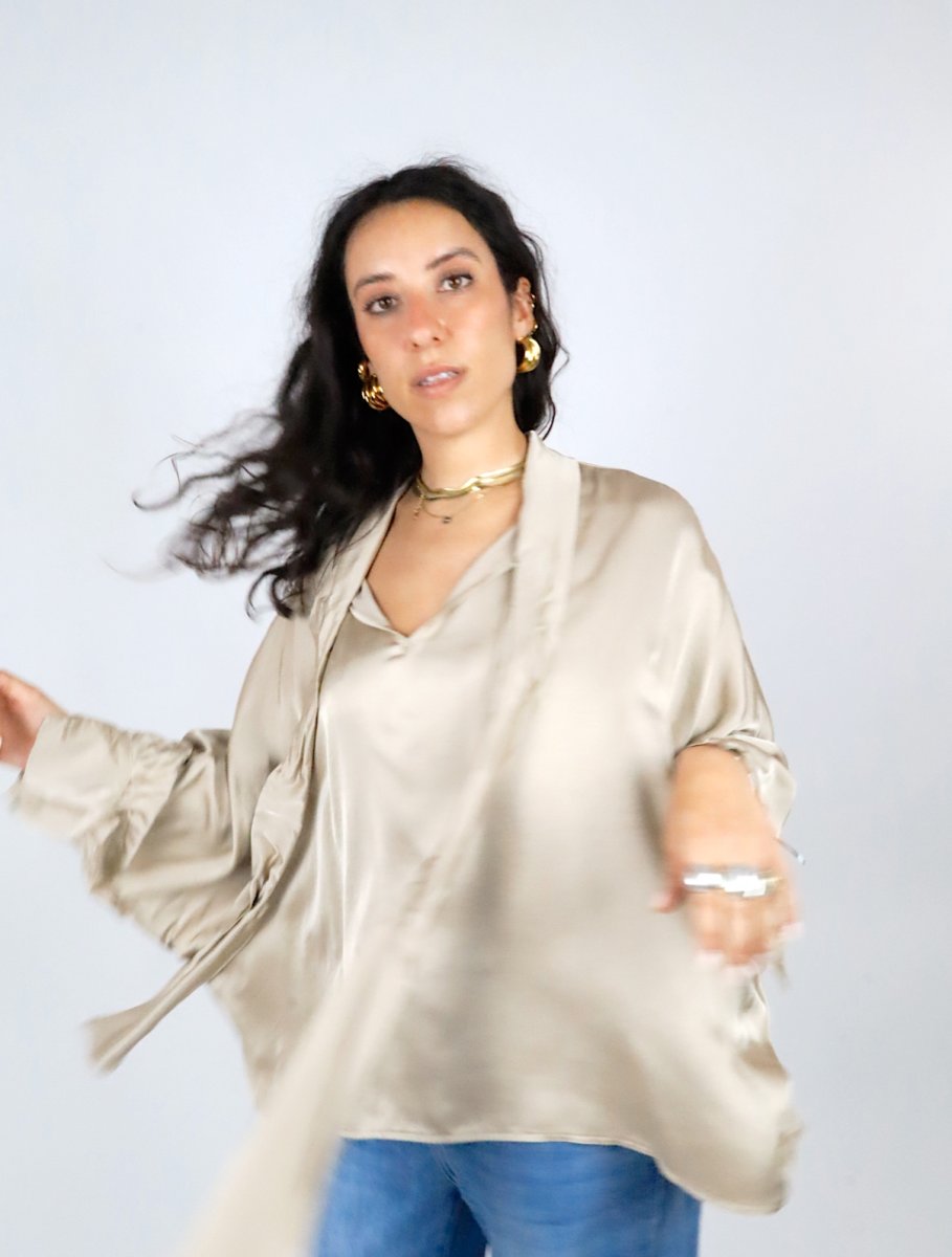 Blusa in raso di viscosa elegante e raffinata, caratterizzata da una linea morbida e fluida che cade delicatamente sulla figura. Il protagonista è il fiocco al collo, che dona un tocco romantico e sofisticato al capo.