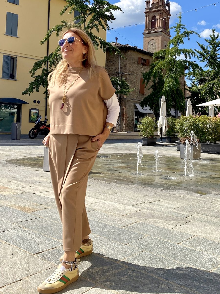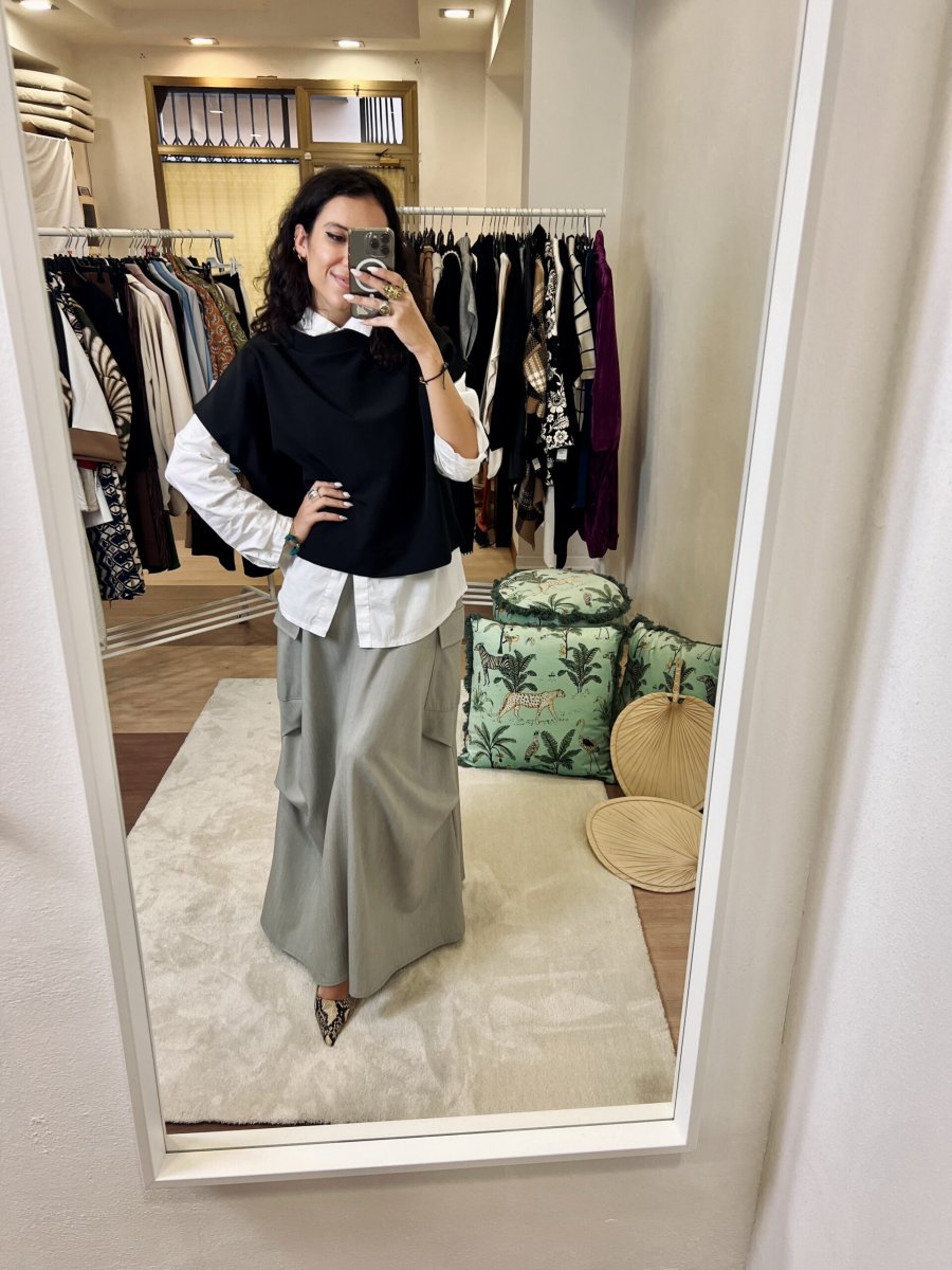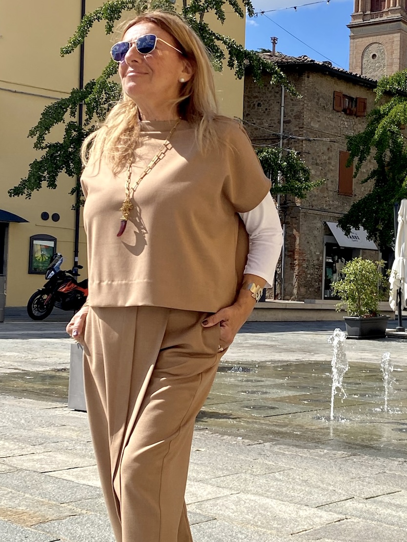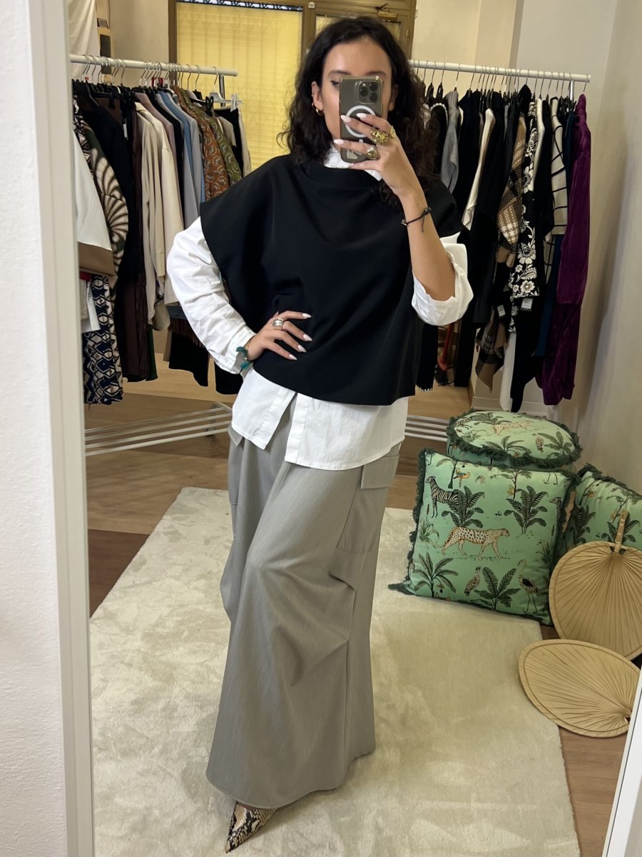 Blusa con manica ad aletta e collo a bicchiere in cady di viscosa. È un nostro modello originale e interamente realizzato a mano dal nostro laboratorio. Veste fino ad un 115 cm di seno.
