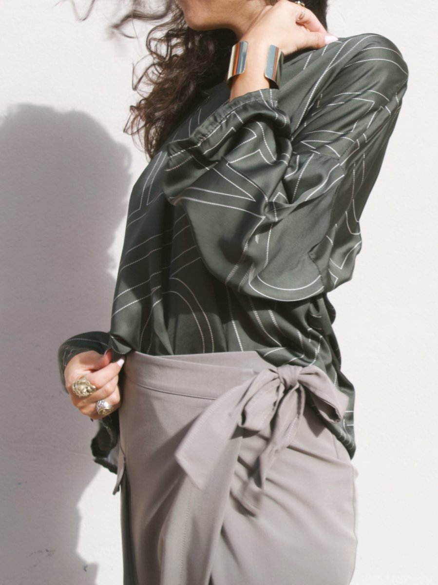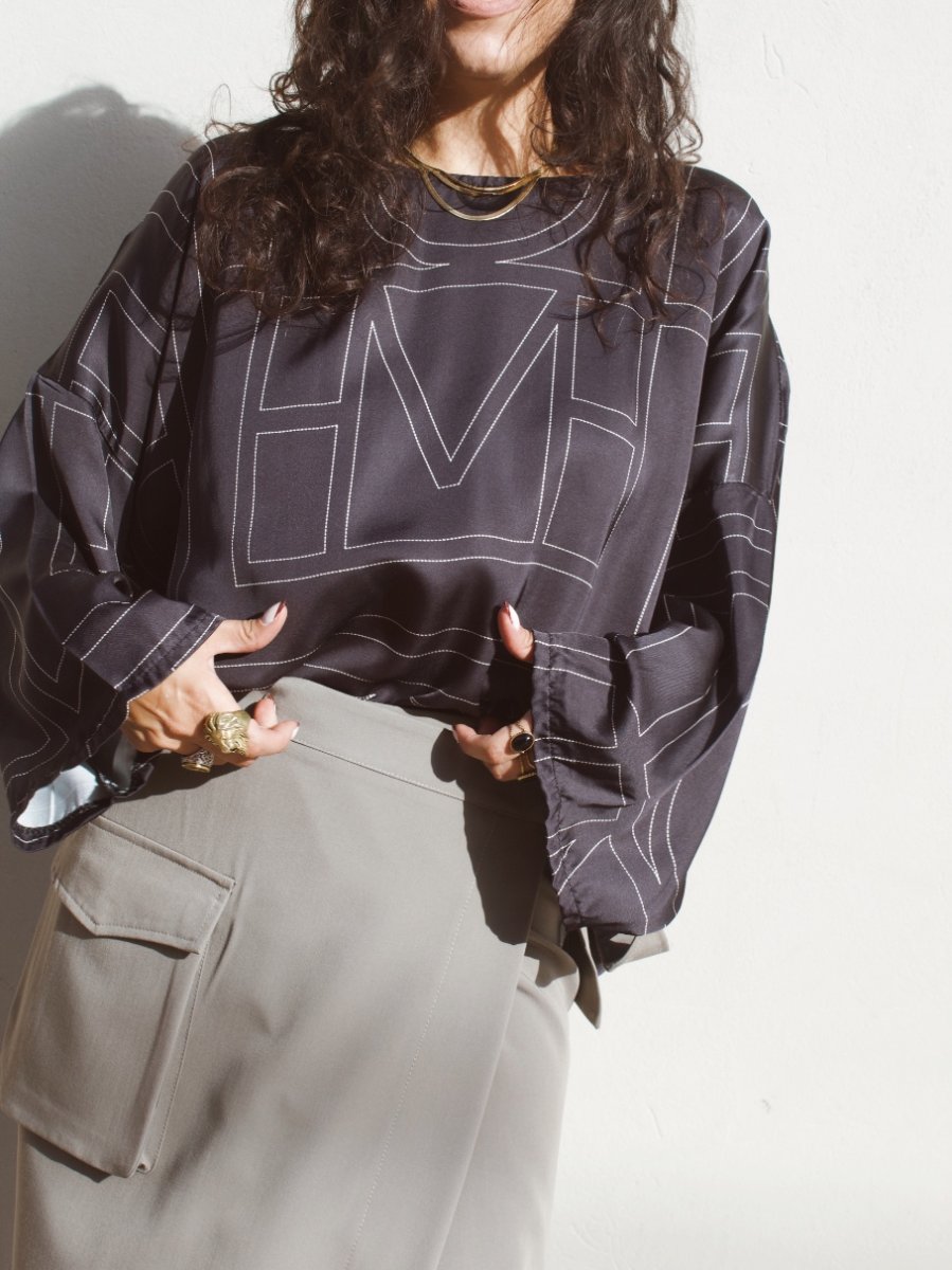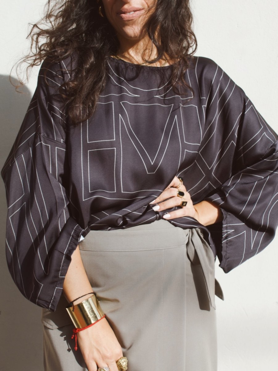 Blusa oversize in rayon e viscosa . È taglia unica e veste fino ad una 50/52. La colorazione Nera tende leggermente al blu.