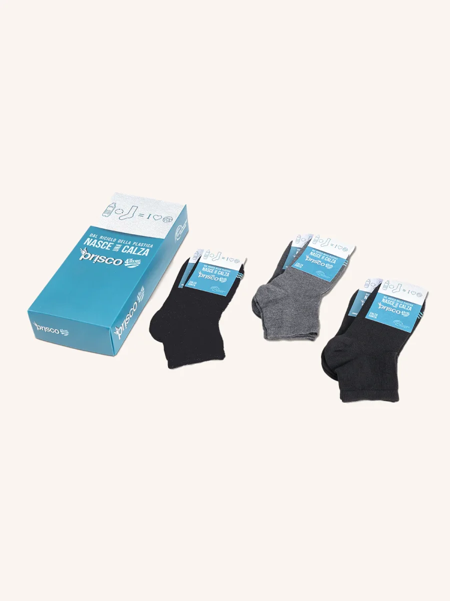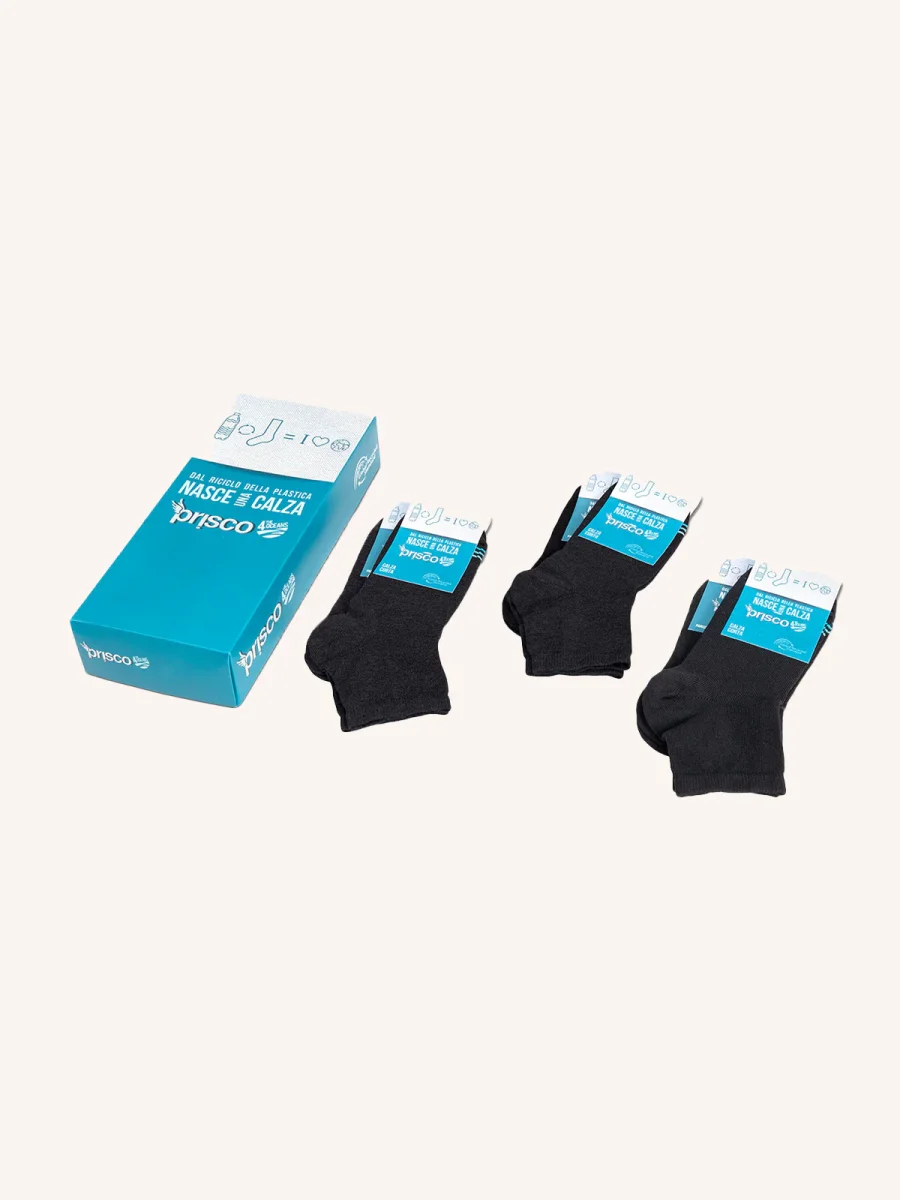 Calza corta per donna realizzata in maglia rasata da fibre riciclate. Prodotto conforme alla certificazione GRS e dotata di Close Toe Technology per la rimagliatura punto per punto.