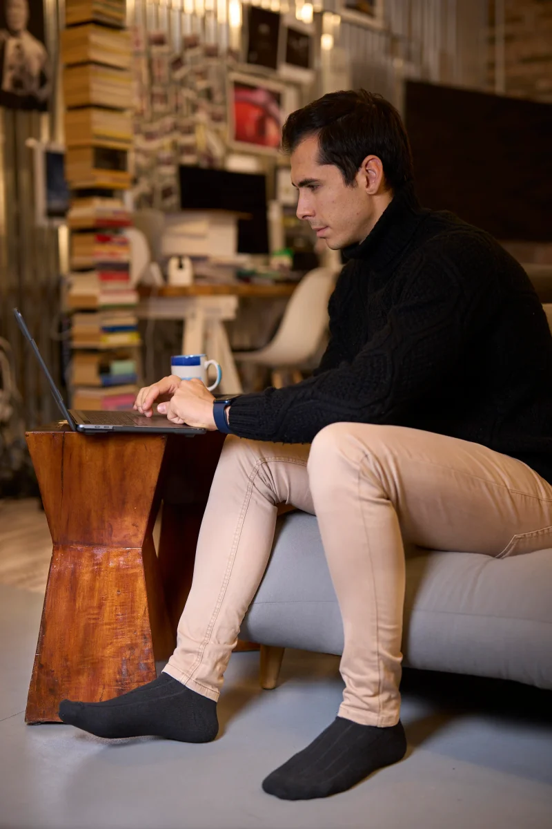Calza lunga da uomo tinta unita in vera costa. Particolarmente adatta per chi soffre il freddo e ama tenere i piedi al caldo avvolti da una morbidissima fibra. Una mano consistente e piena la rende ideale per le stagione invernale. Fabbricata con una mischia che contiene due filati che creano una combinazione sublime: angora e cotone.