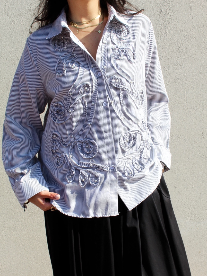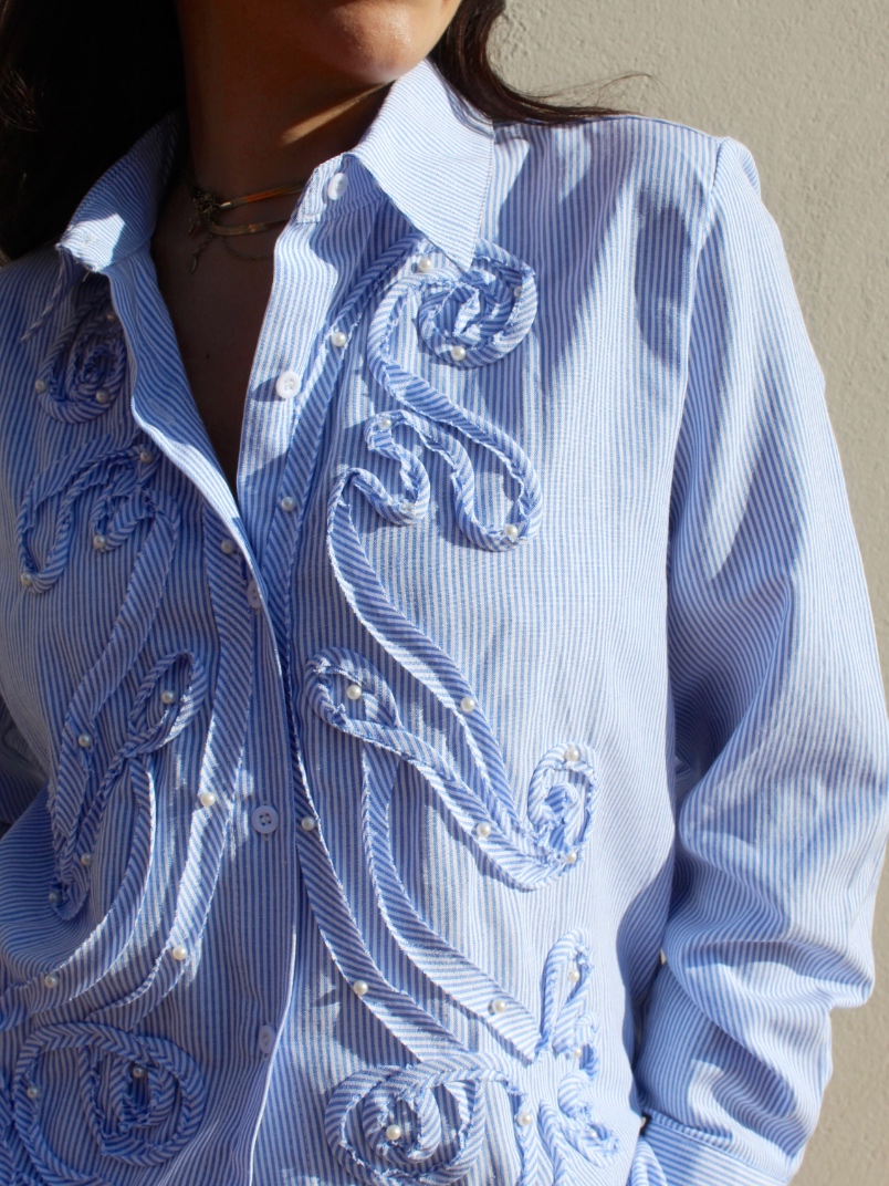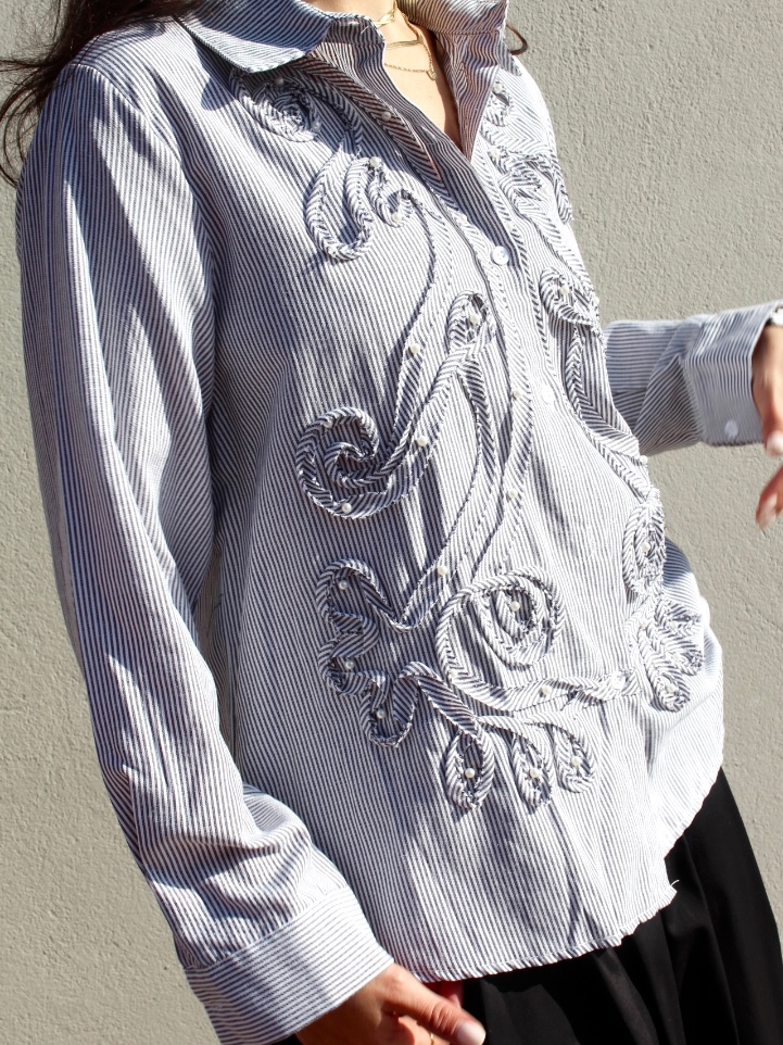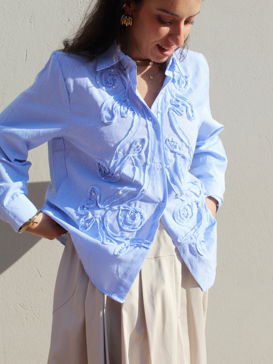 Camicia in cotone a righe sottili bianche, dal gusto romantico e ricercato. Un capo che unisce la classicità della camicia sartoriale a ricami decorativi in rilievo, creando movimento e un effetto tridimensionale elegante.