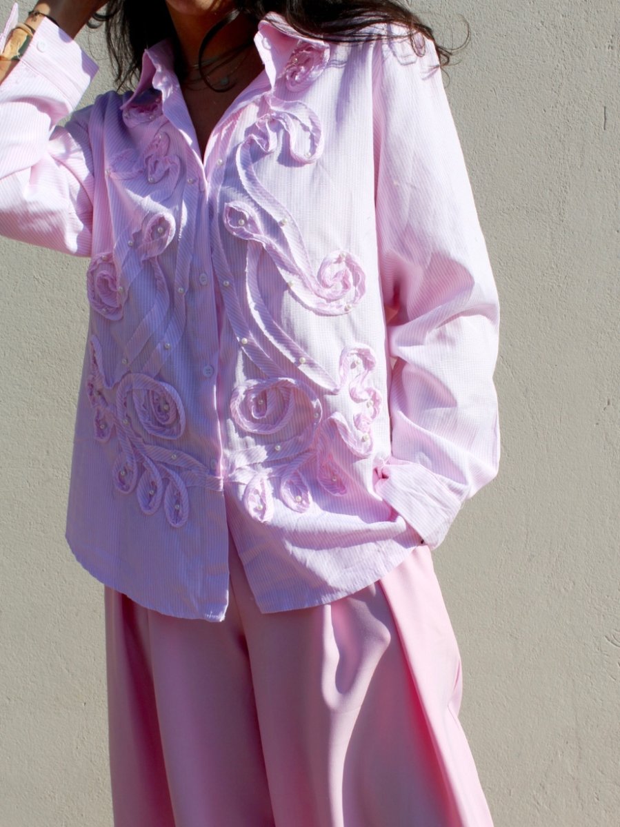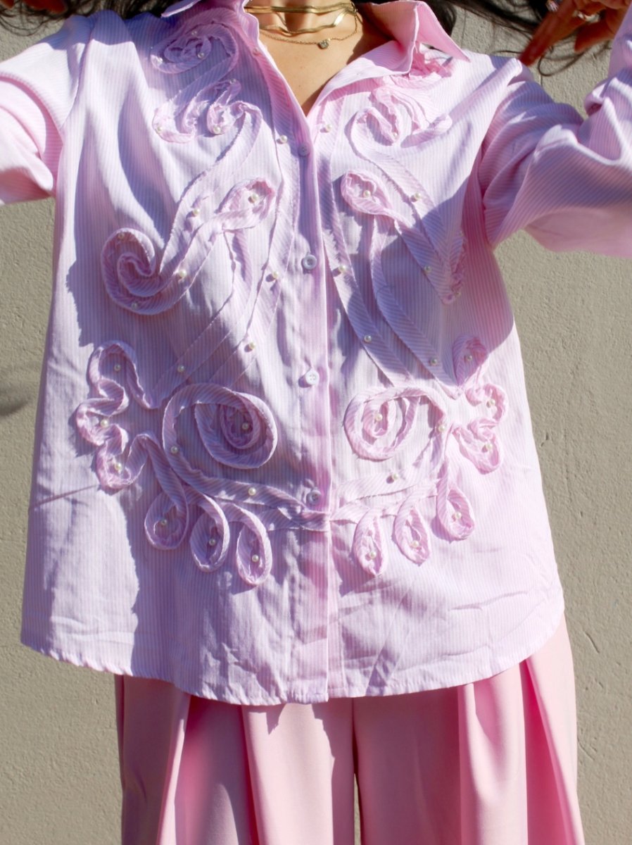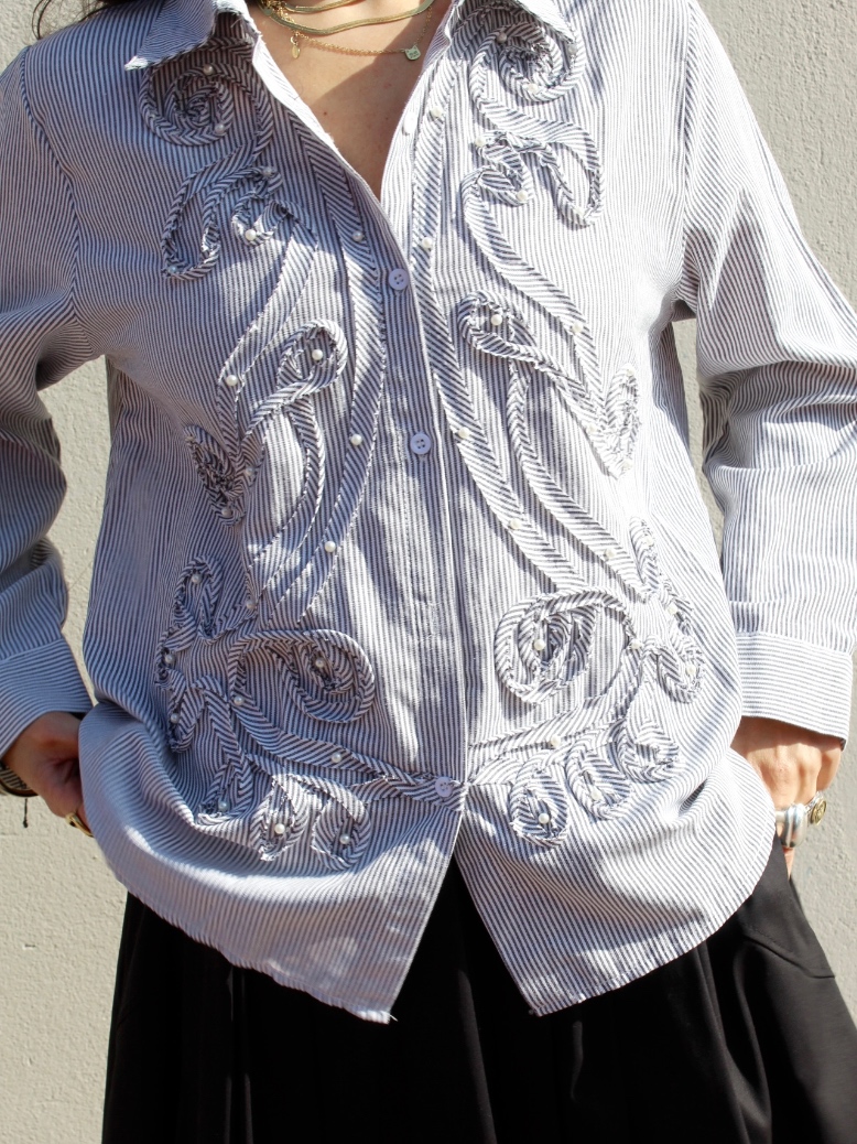 Camicia in cotone a righe sottili bianche, dal gusto romantico e ricercato. Un capo che unisce la classicità della camicia sartoriale a ricami decorativi in rilievo, creando movimento e un effetto tridimensionale elegante.