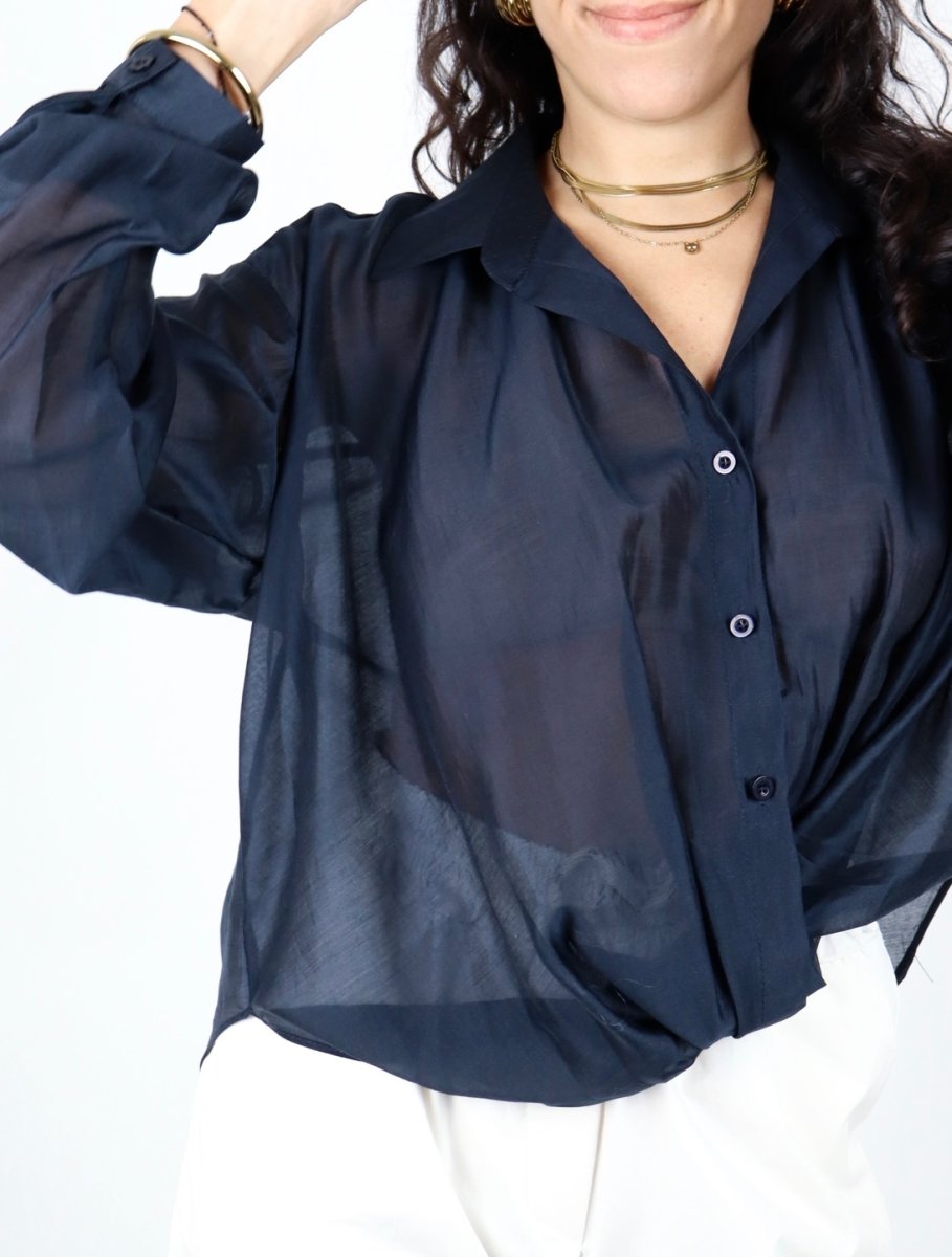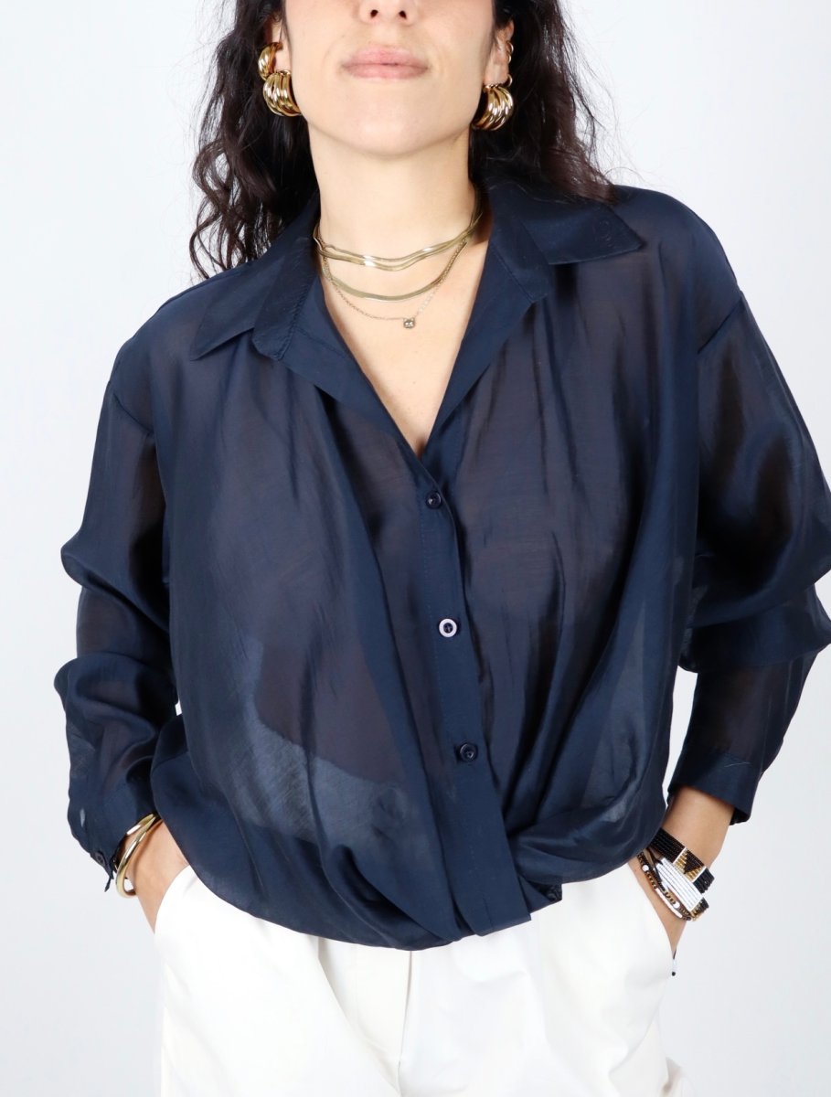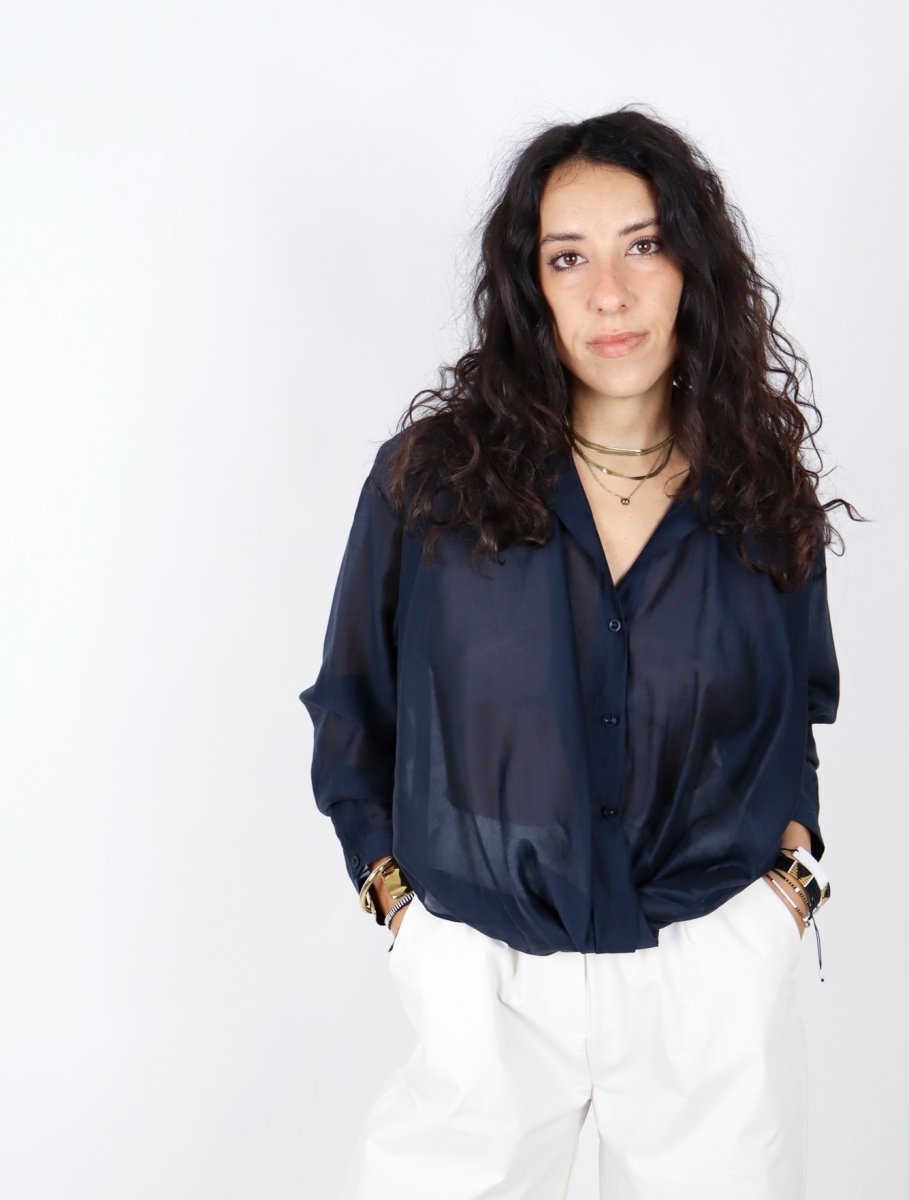 Camicia in morbido tencel leggermente trasparente, dalla linea fluida e femminile. Il tessuto leggero e luminoso dona movimento al capo, creando un effetto delicato e raffinato sulla silhouette.