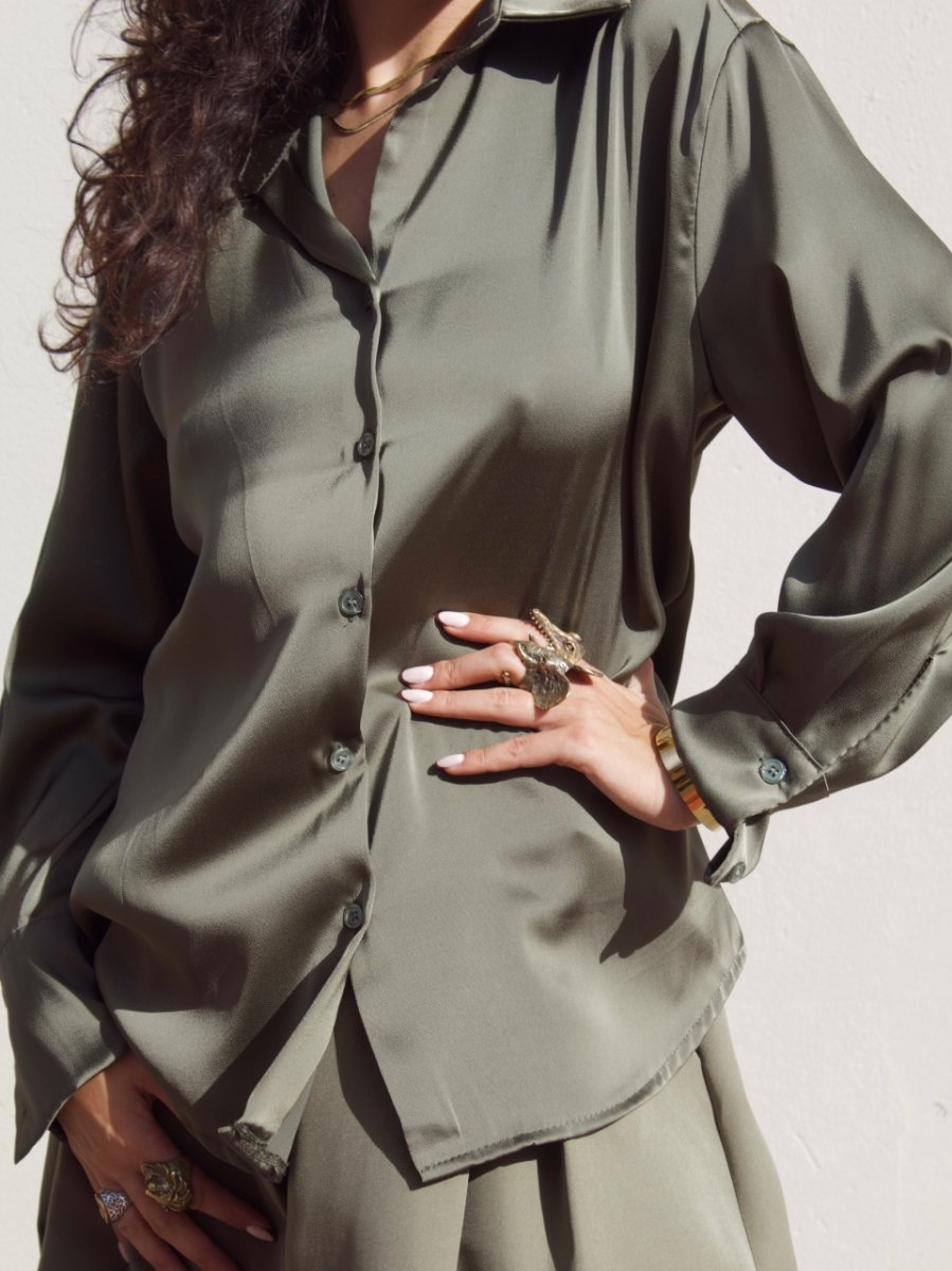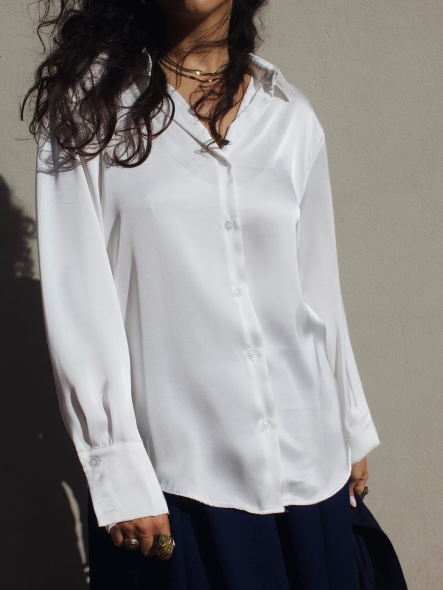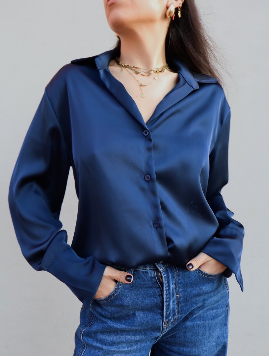 Camicia in satin dalla finitura luminosa e setosa. Il tessuto morbido e fluido scivola delicatamente sulla silhouette, creando un effetto elegante e femminile.