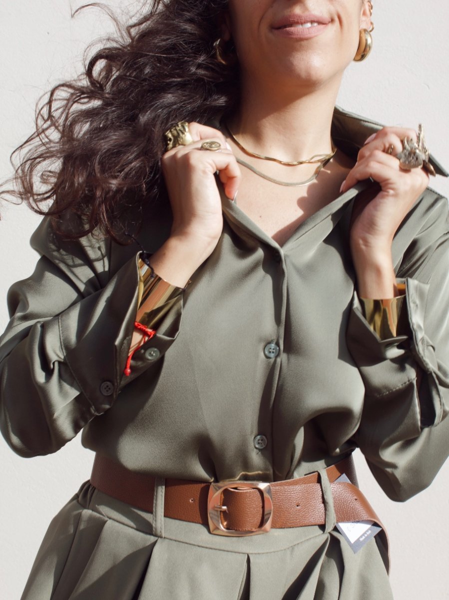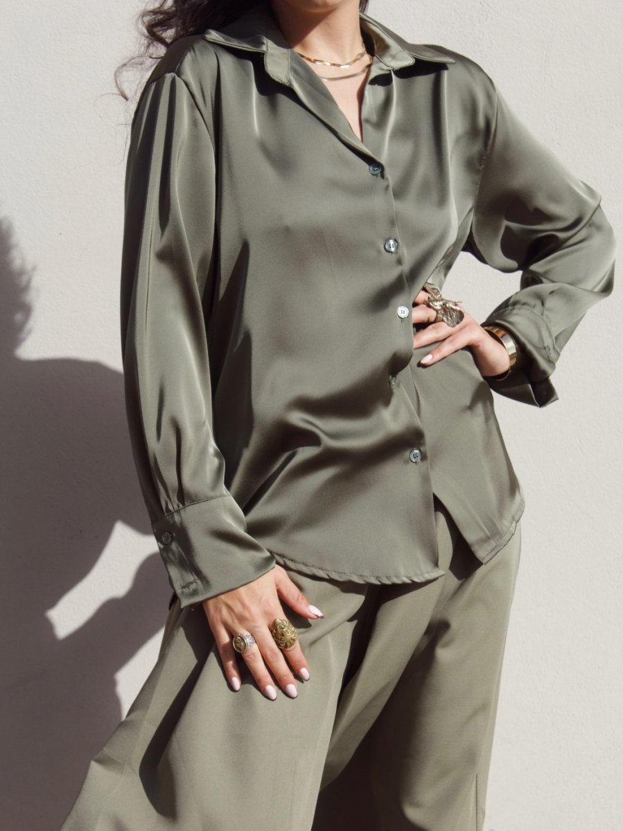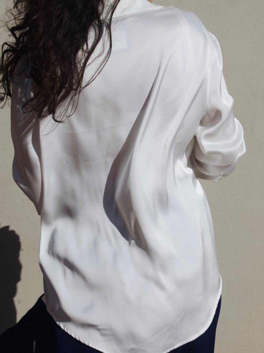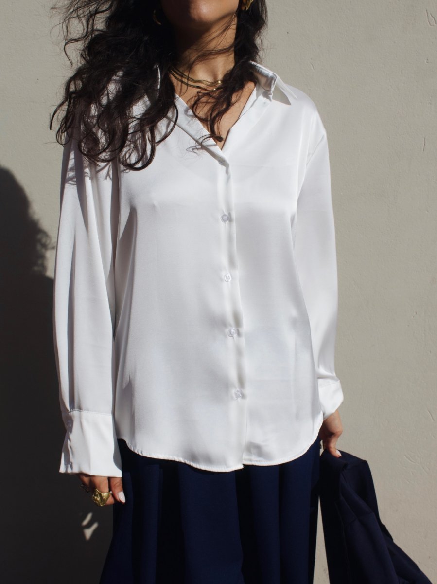 Camicia in satin dalla finitura luminosa e setosa. Il tessuto morbido e fluido scivola delicatamente sulla silhouette, creando un effetto elegante e femminile.