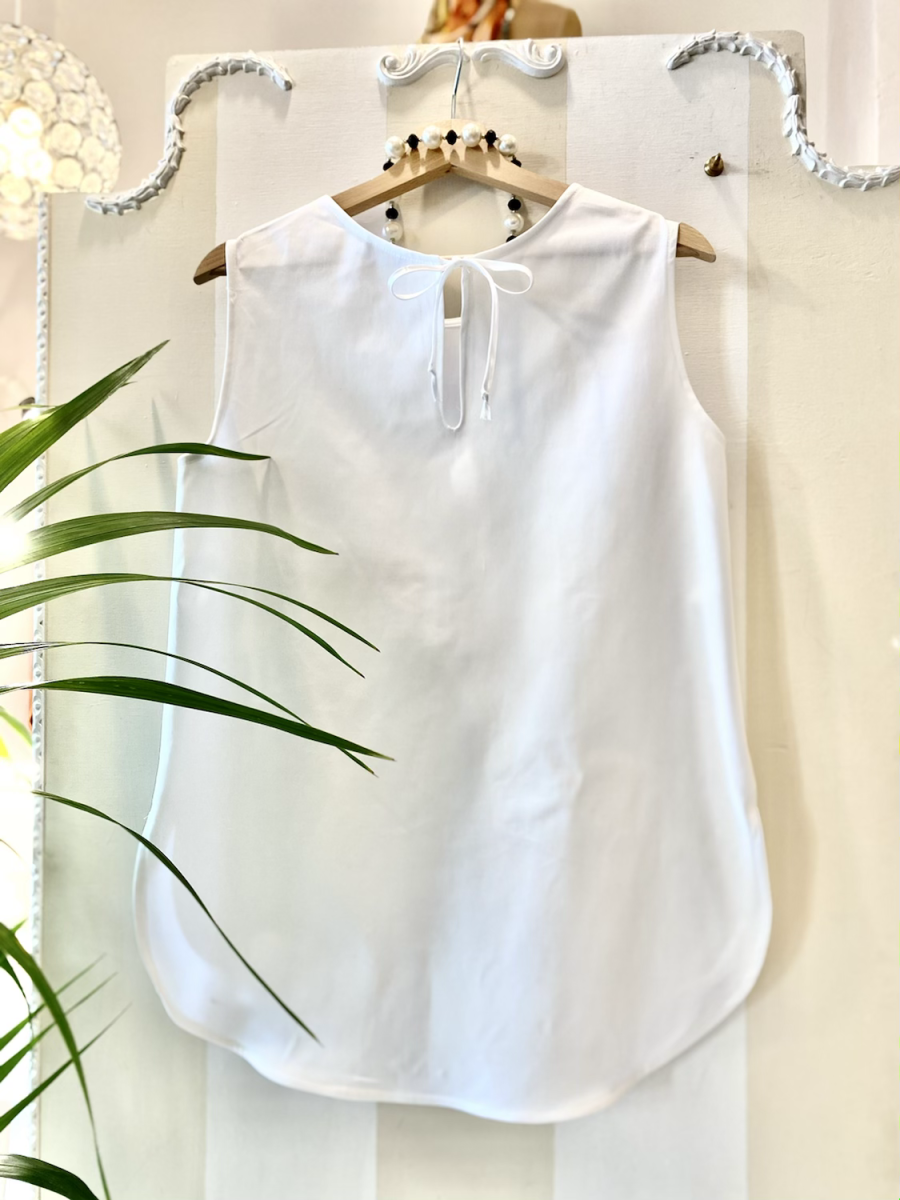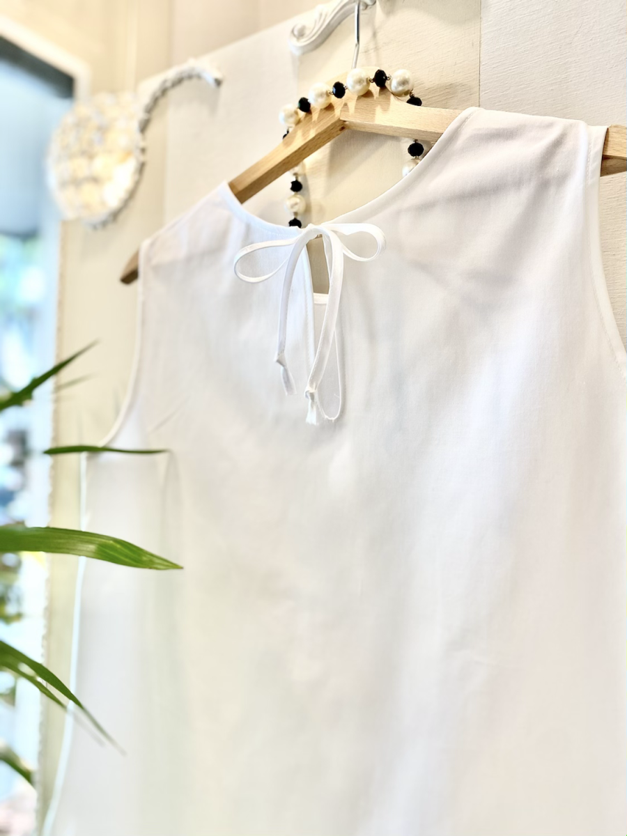 Blusa smanicata in cotone makò e allacciatura a fiocco sulla schiena.