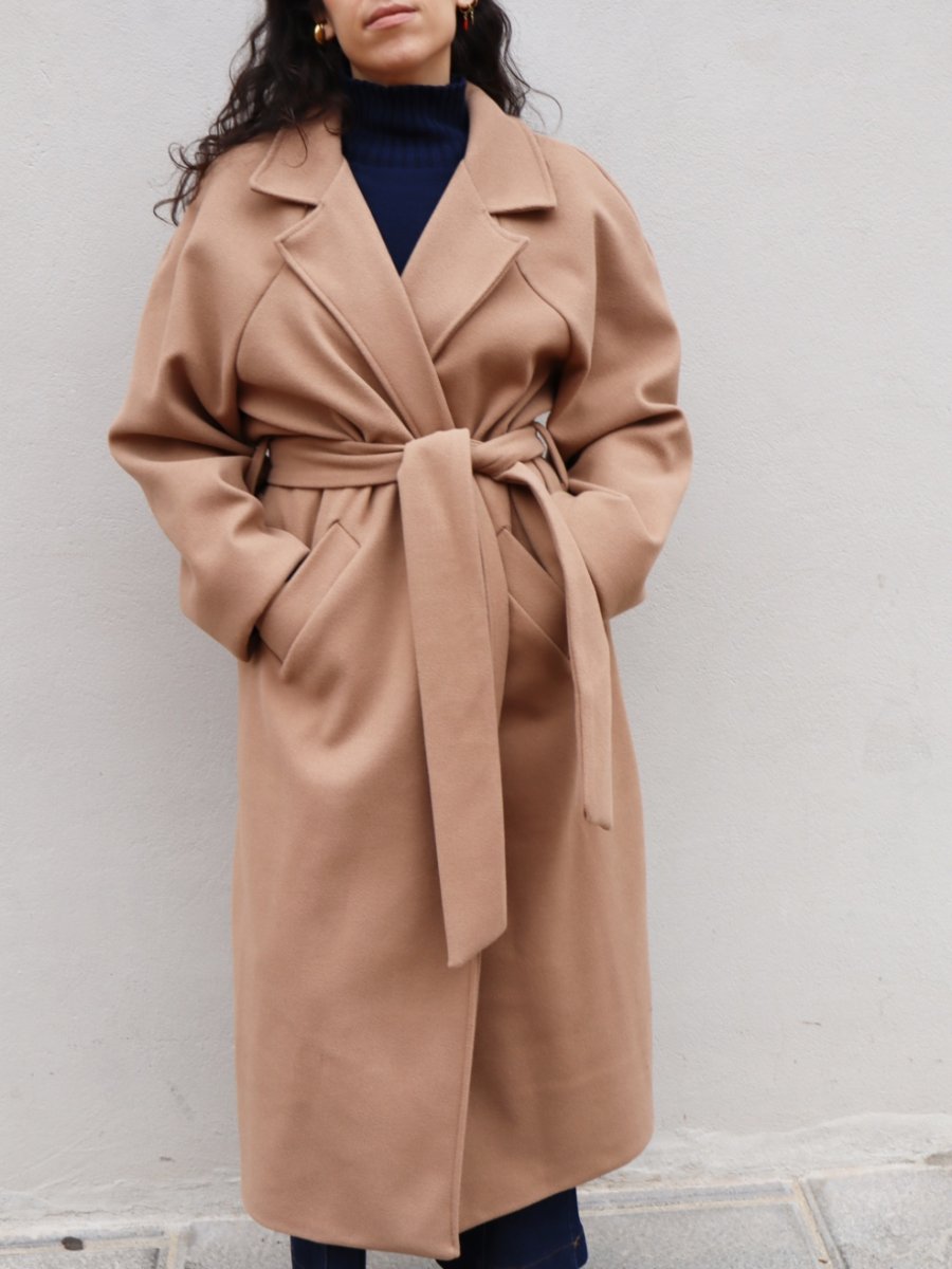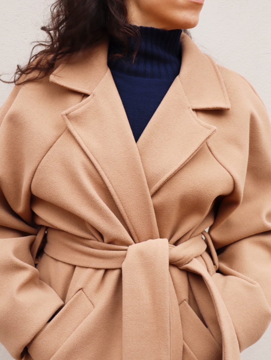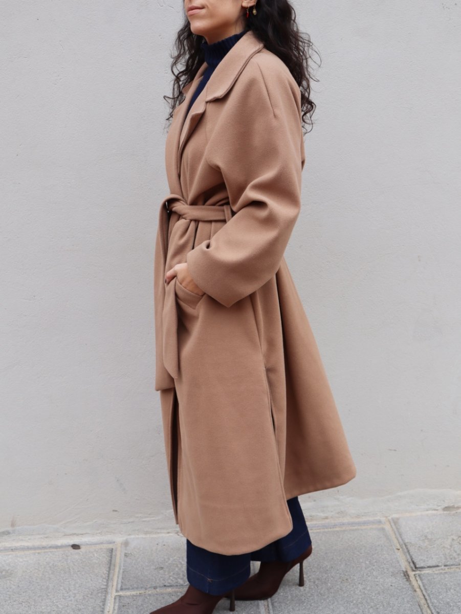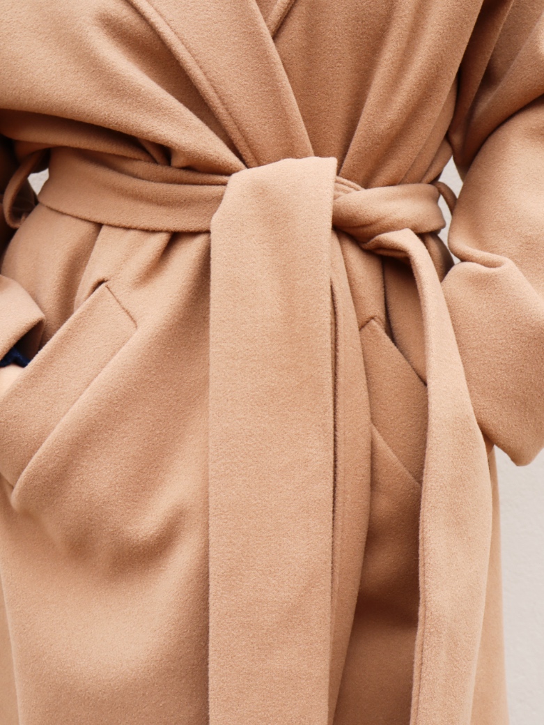 Cappotto a vestaglia senza allacciature. È corredato da cintura. Presenta due spacchi laterali. È taglia unica e veste fino ad una 48.