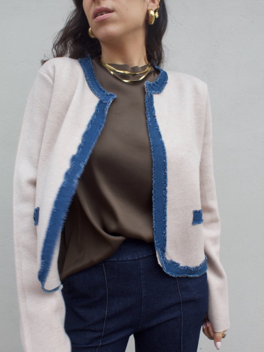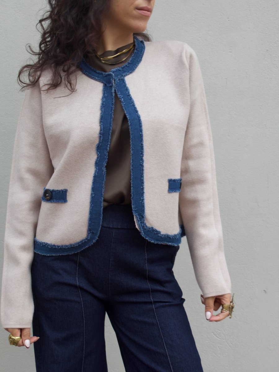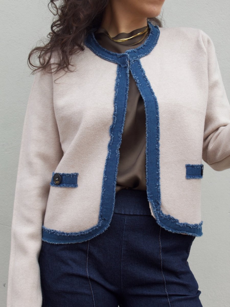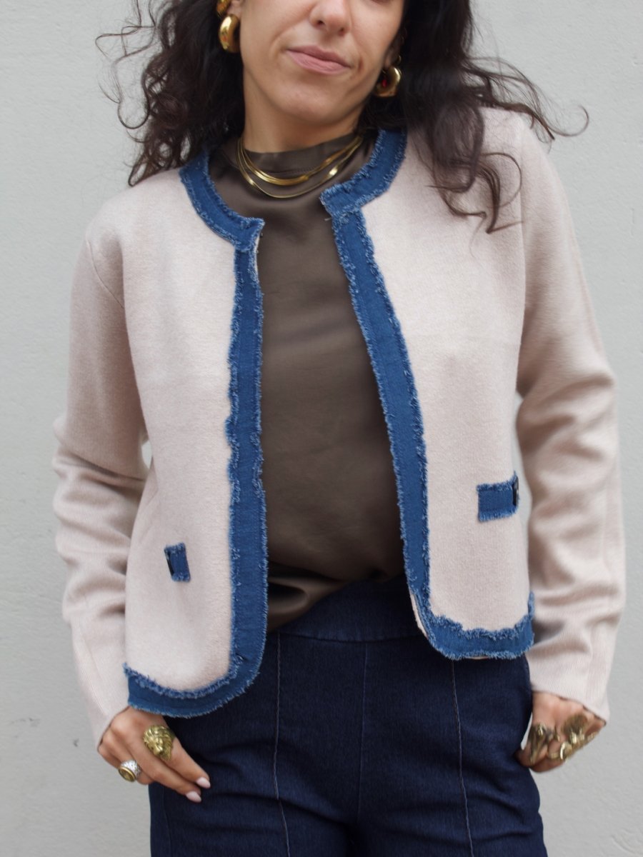 Cardigan con profili in jeans e finte tasche frontali. Si chiude tramite due gangettini sul collo. È taglia unica e veste fino ad una 44/46.