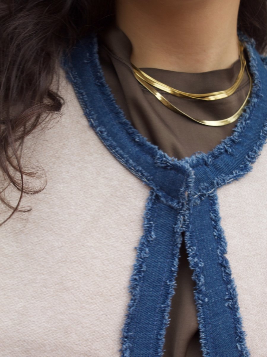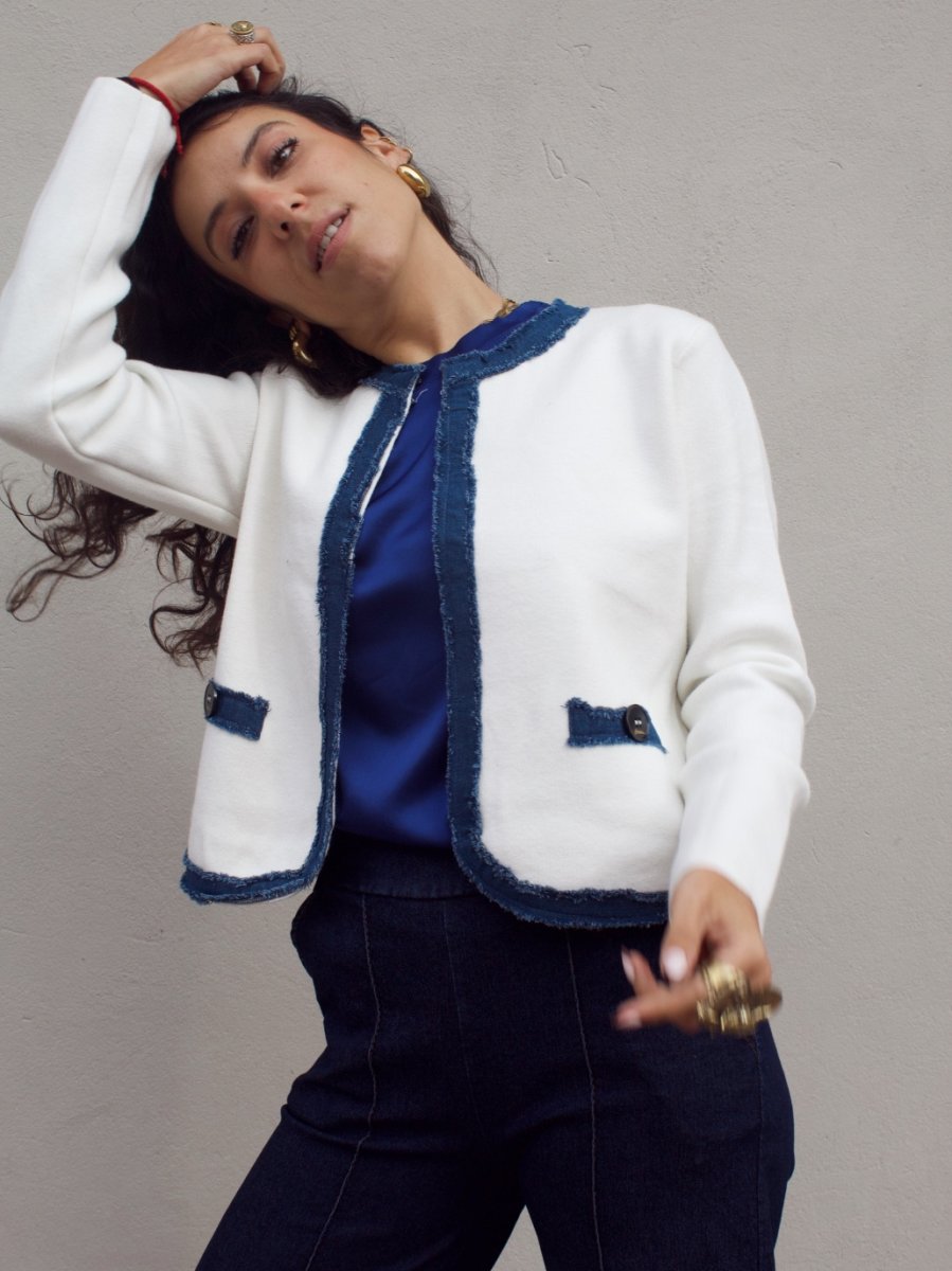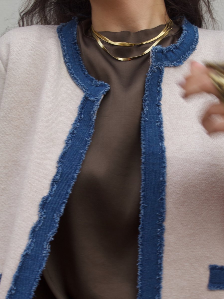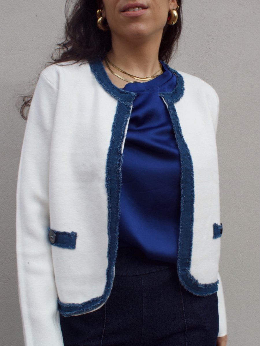 Cardigan con profili in jeans e finte tasche frontali. Si chiude tramite due gangettini sul collo. È taglia unica e veste fino ad una 44/46.