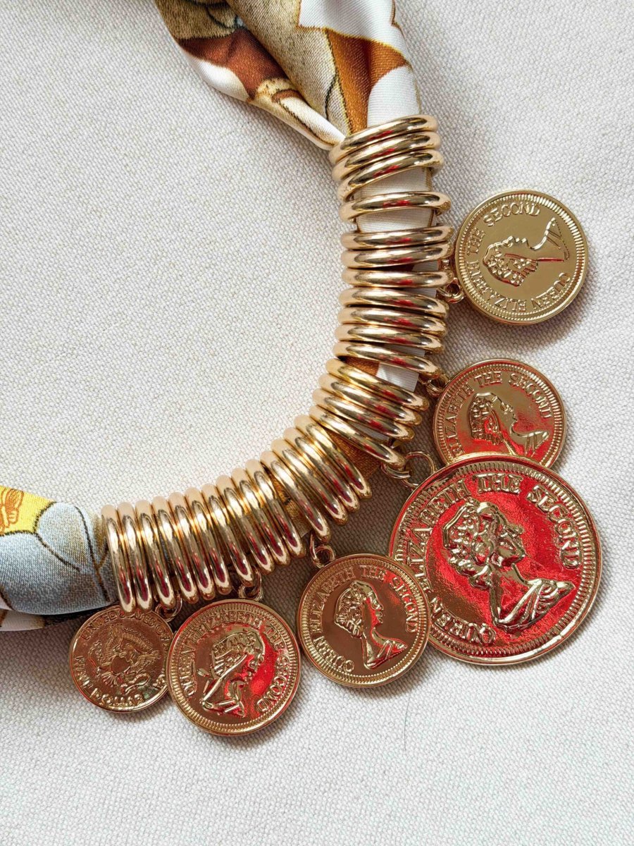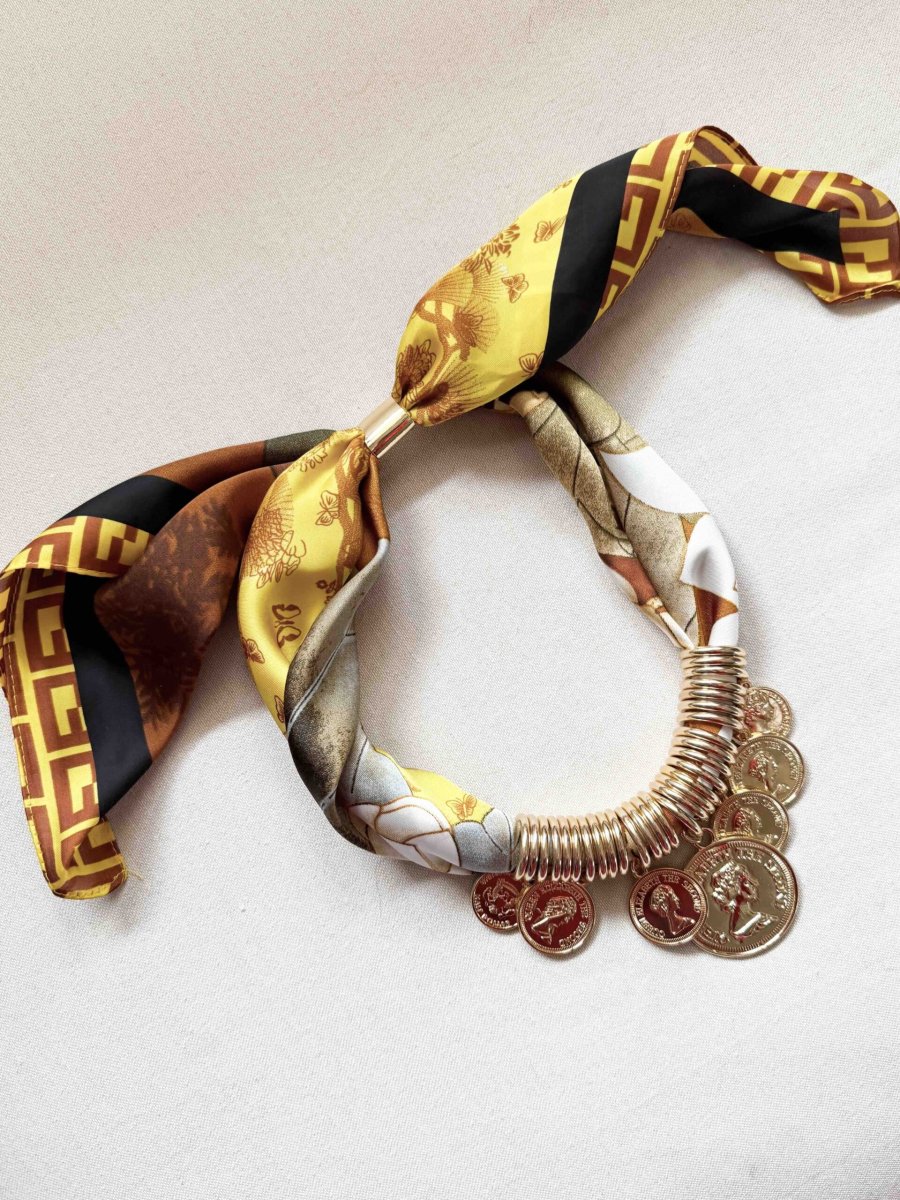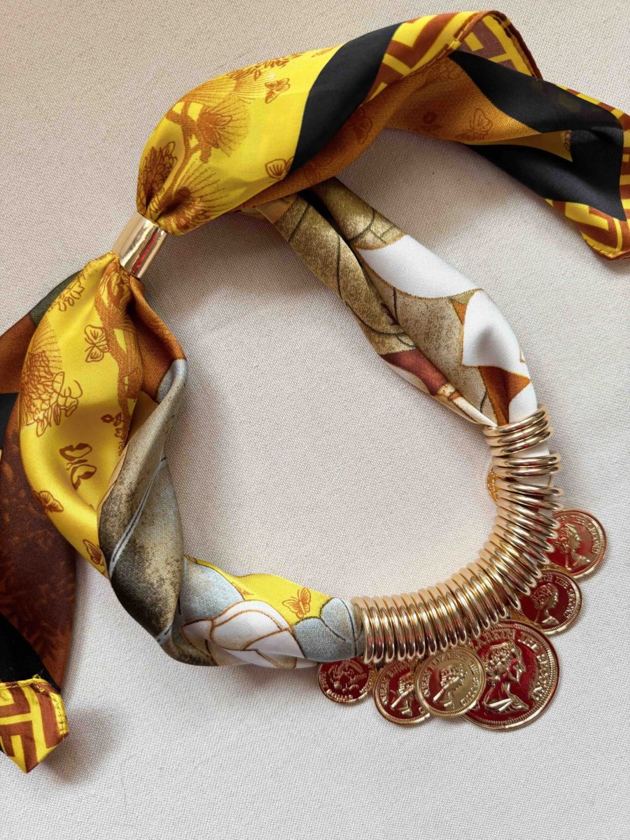 Collana realizzata con foulard in tessuto satinato, decorato da motivo a contrasto. Il design morbido e avvolgente è impreziosito da anelli metallici dorati e da una cascata di pendenti ispirati a monete antiche.