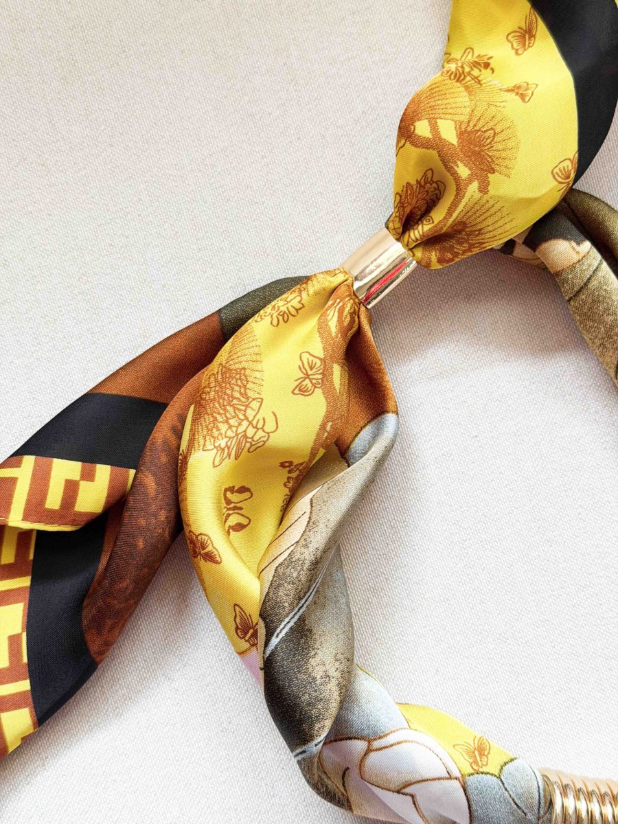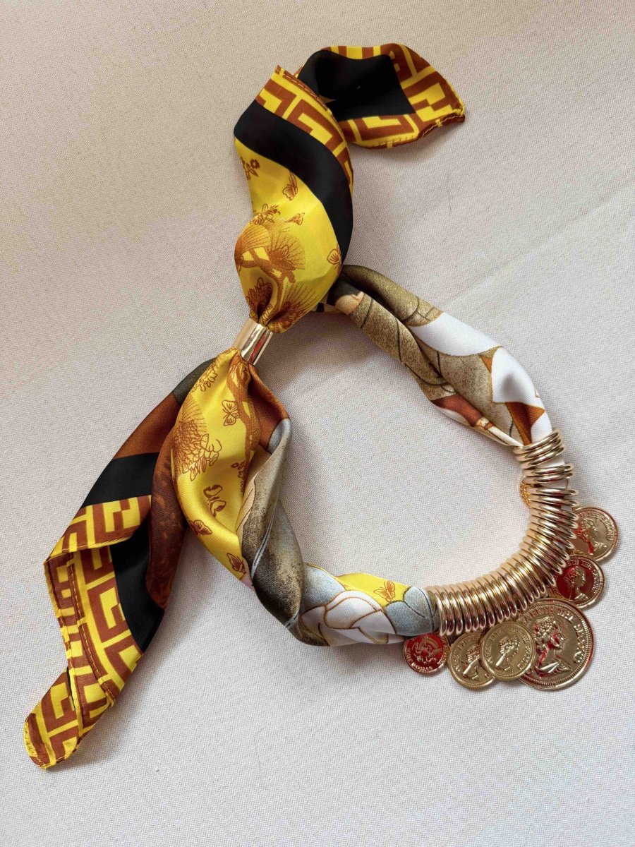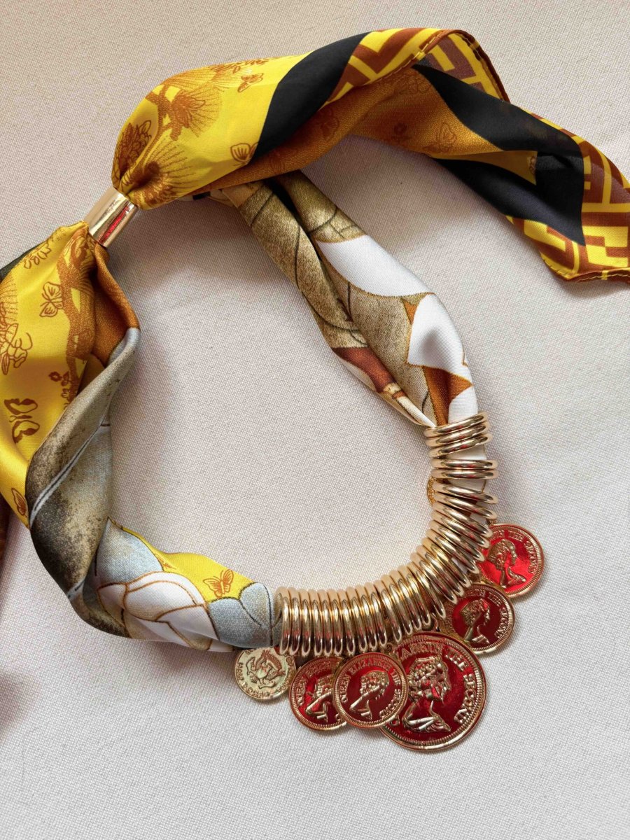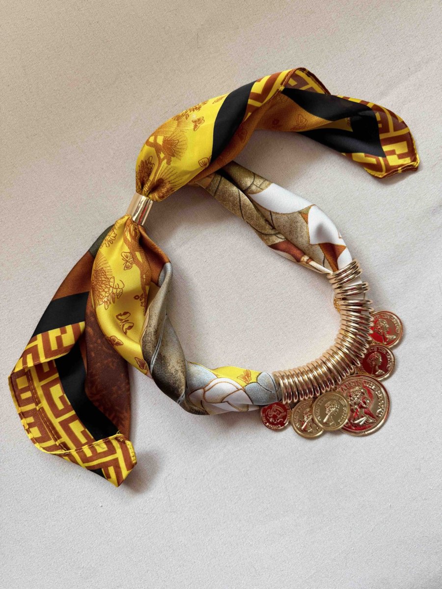 Collana realizzata con foulard in tessuto satinato, decorato da motivo a contrasto. Il design morbido e avvolgente è impreziosito da anelli metallici dorati e da una cascata di pendenti ispirati a monete antiche.