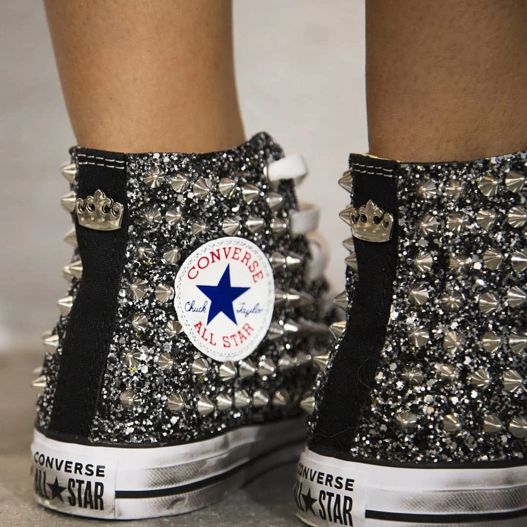 Scarpe originali Converse All Star Chuck Taylor personalizzate a mano con applicazione di glitter black silver e borchie sulle pareti laterali. Corona personalizzata Ballo Da Sola sul tallone. Effetto sporcato. Ogni imperfezione è frutto del lavoro svolto artigianalmente.