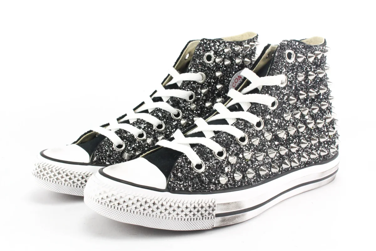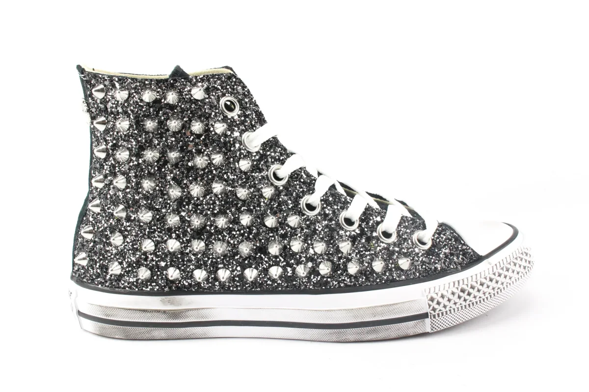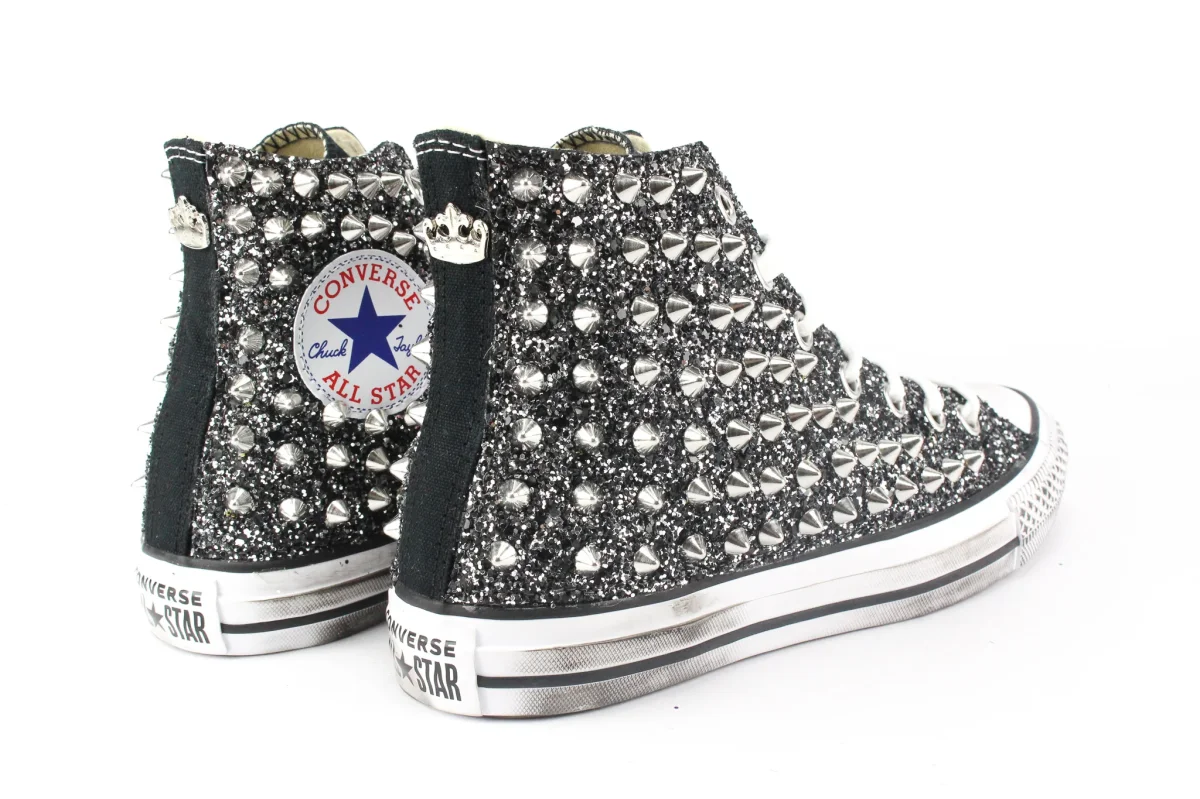 Scarpe originali Converse All Star Chuck Taylor personalizzate a mano con applicazione di glitter black silver e borchie sulle pareti laterali. Corona personalizzata Ballo Da Sola sul tallone. Effetto sporcato.