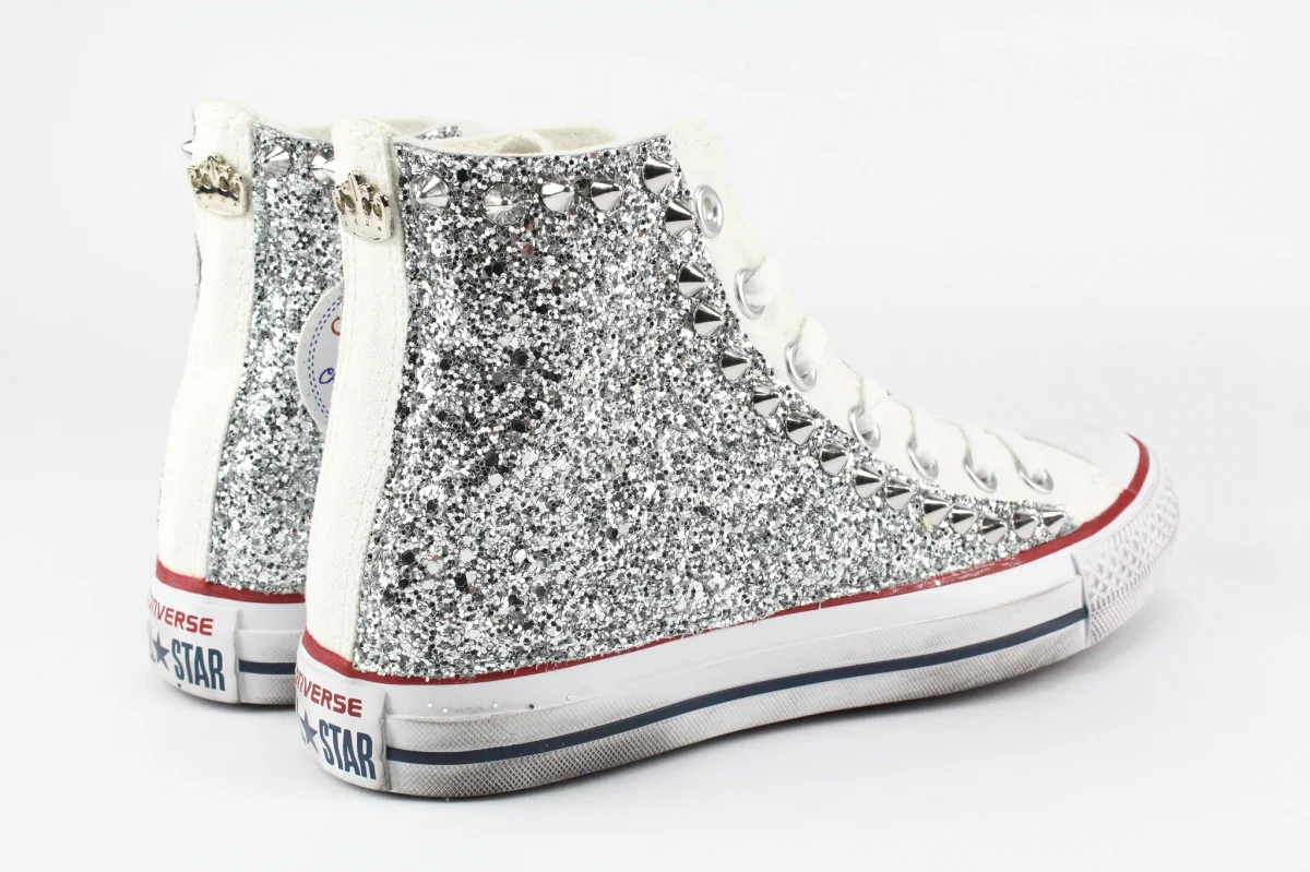 Scarpe originali Converse All Star Chuck Taylor bianche personalizzate a mano con applicazioni di glitter argento su parete esterna ed interna e borchie lungo cucitura e giro caviglia. Corona personalizzata Ballo Da Sola sul tallone ed effetto sporcato.