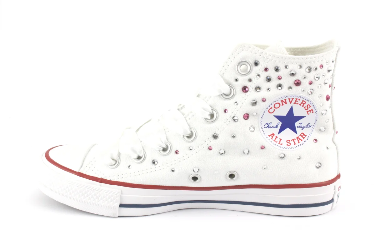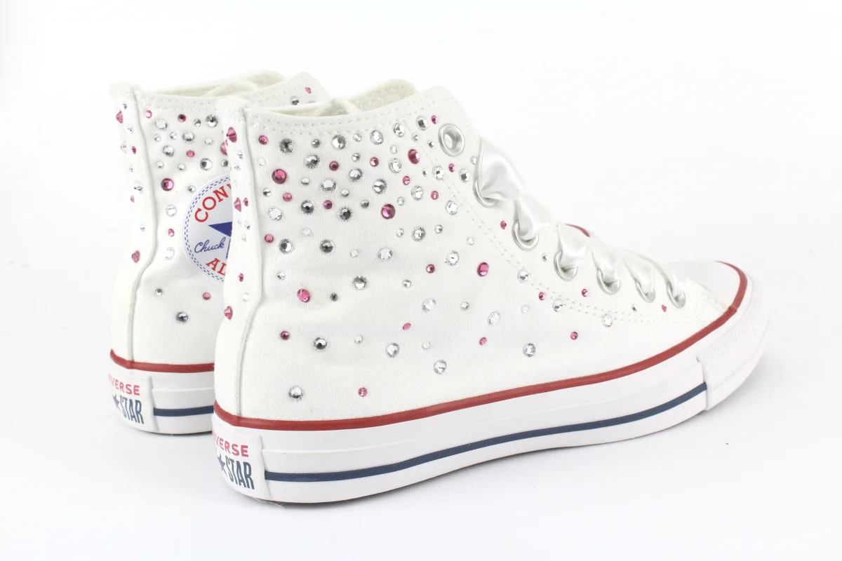 Sneakers originali Converse All Star Chuck Taylor bianche personalizzate a mano con applicazioni sulle pareti di Strass Swarovski Termosaldati nei colori Cristal e Rosa.