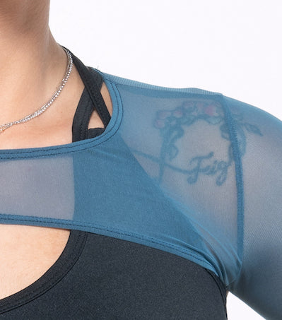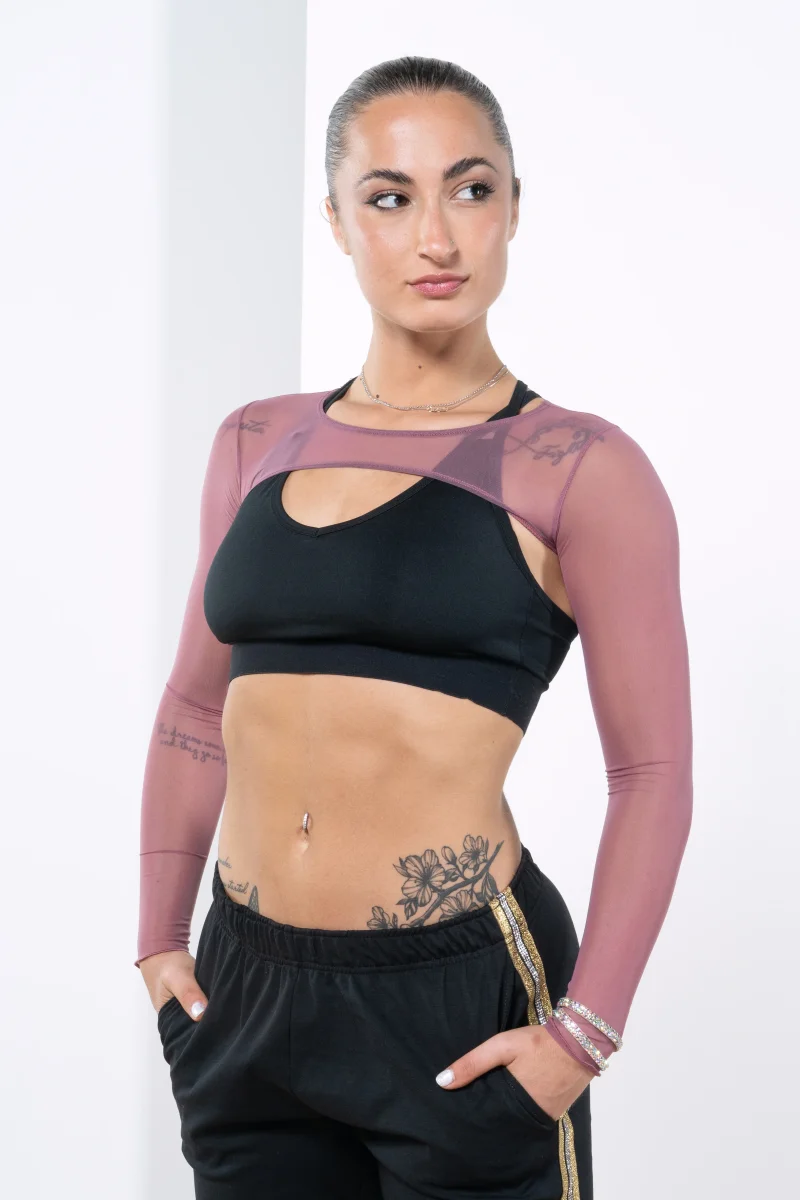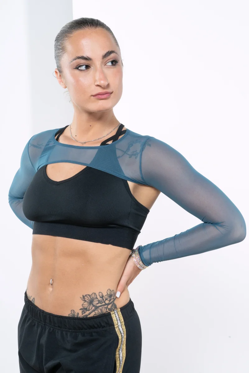 Coprispalla in tessuto Mesh (tulle) bielastico. Elegante complemento dell’outfit da training. Bordatura elasticizzata per garantire perfetta aderenza durante i movimenti. Manica lunga con applicazione di logo in strass o in glitter.