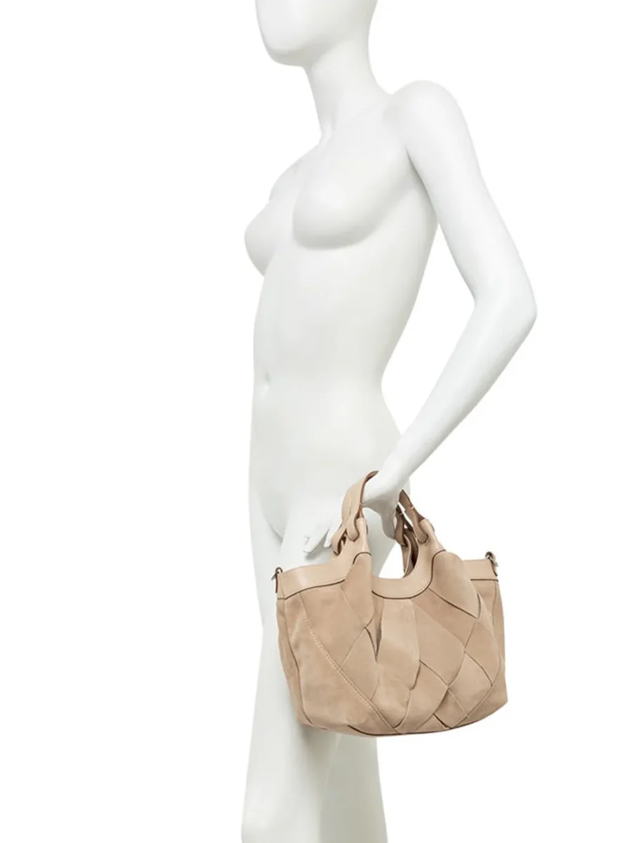 – Realizzata in pelle di camoscio con trama geometrica.