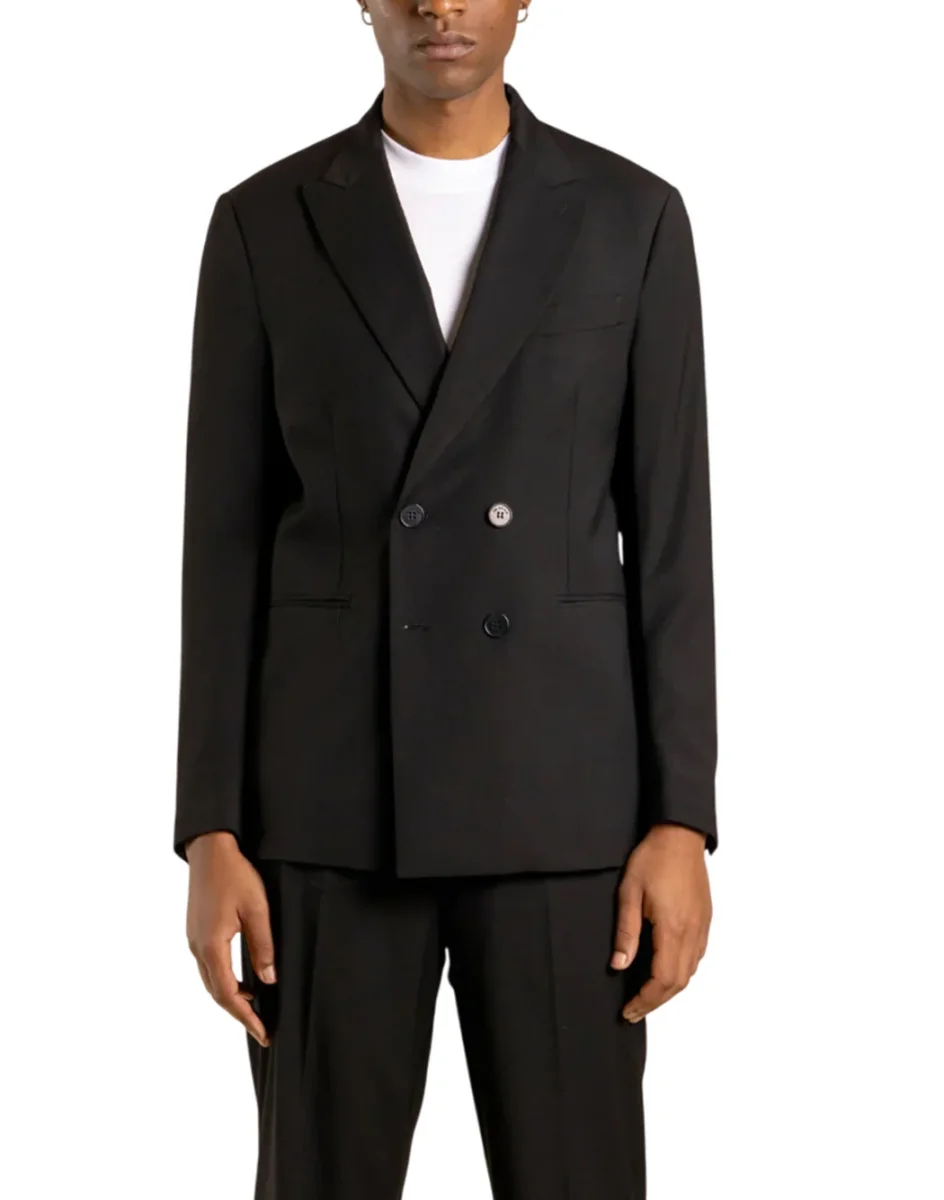 Giacca doppiopetto con abbottonatura nascosta e revers sciallato, dal design essenziale e raffinato. Linee pulite e taglio moderno per uno stile elegante e versatile.