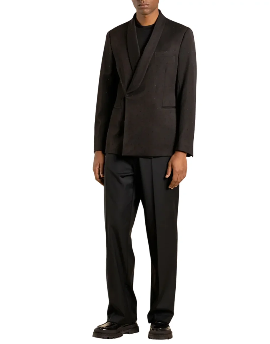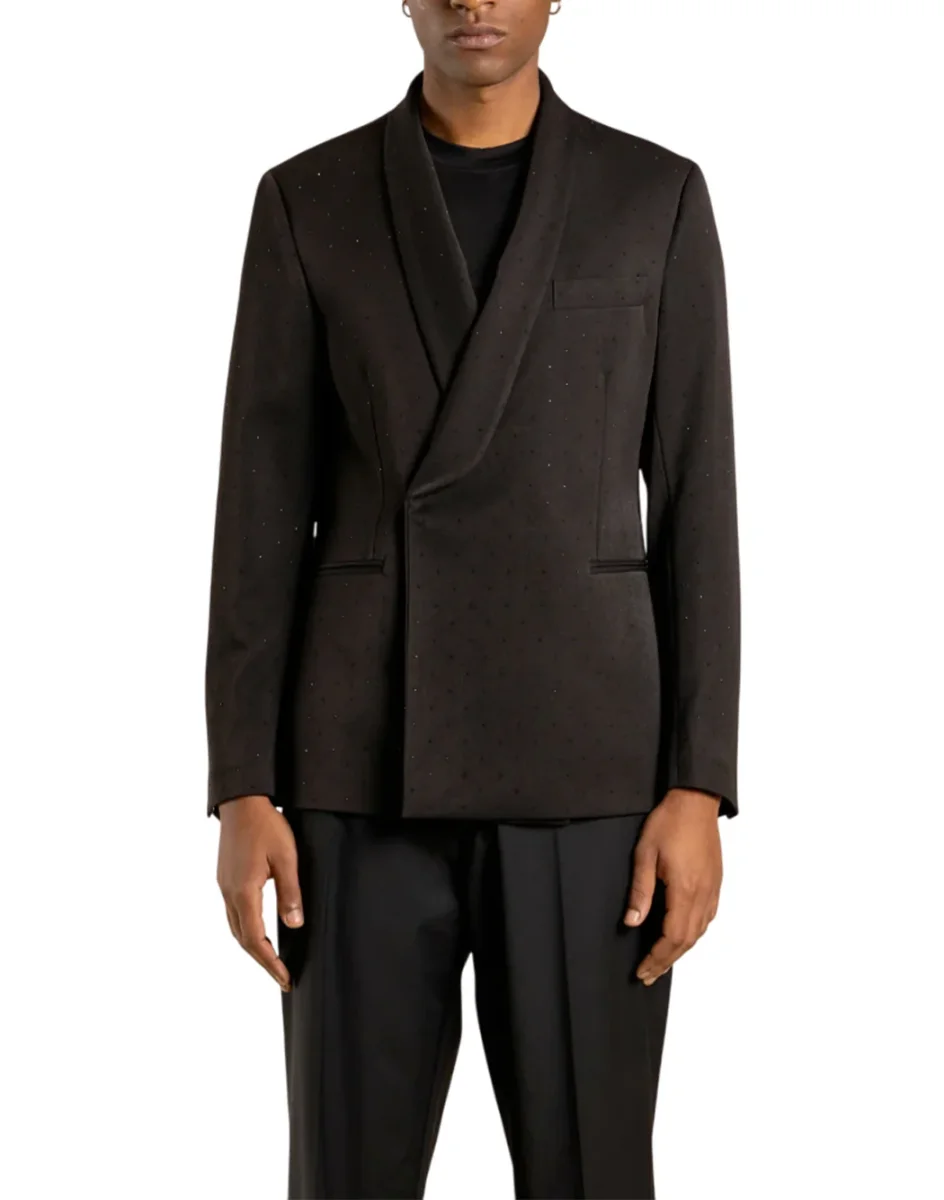 Giacca doppiopetto con abbottonatura nascosta e revers sciallato, dal design essenziale e raffinato. Linee pulite e taglio moderno per uno stile elegante e versatile.