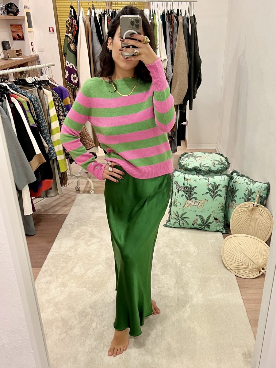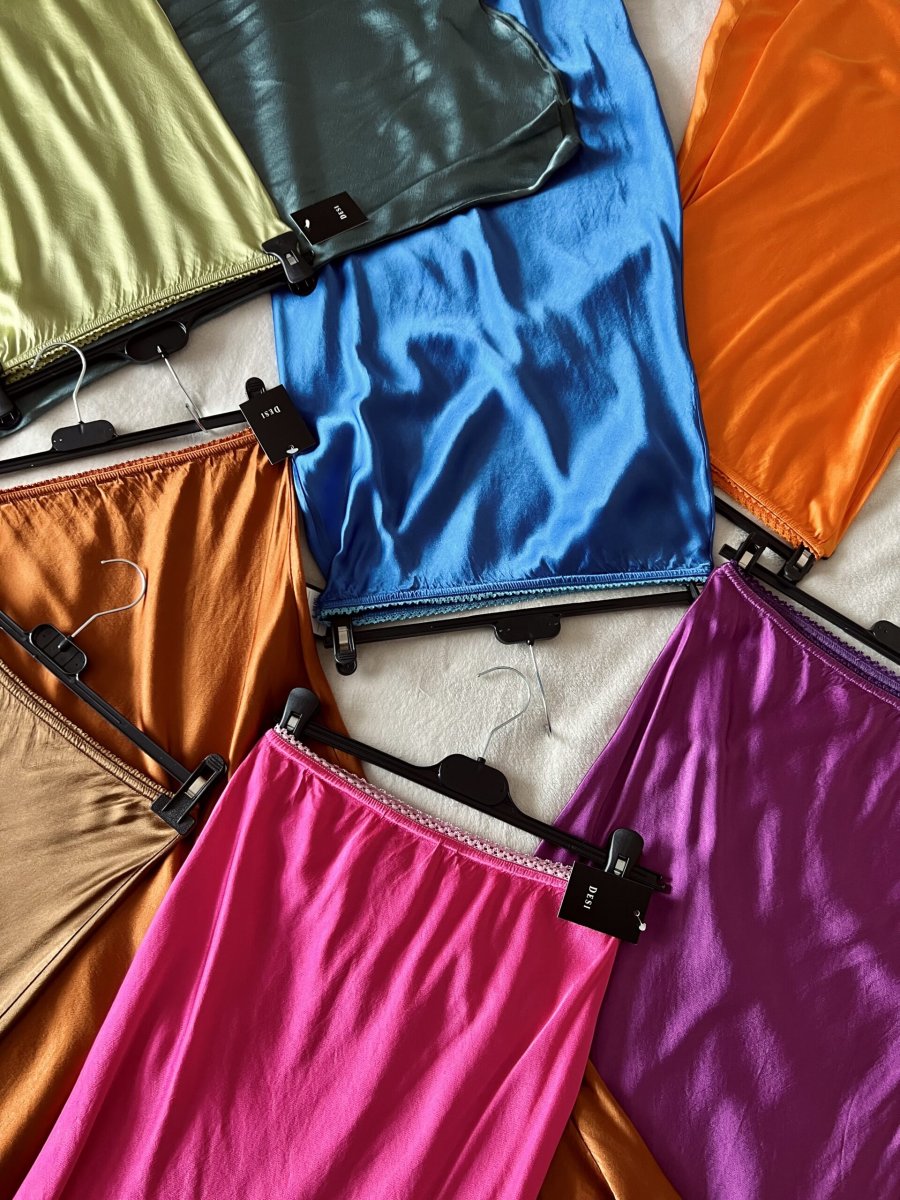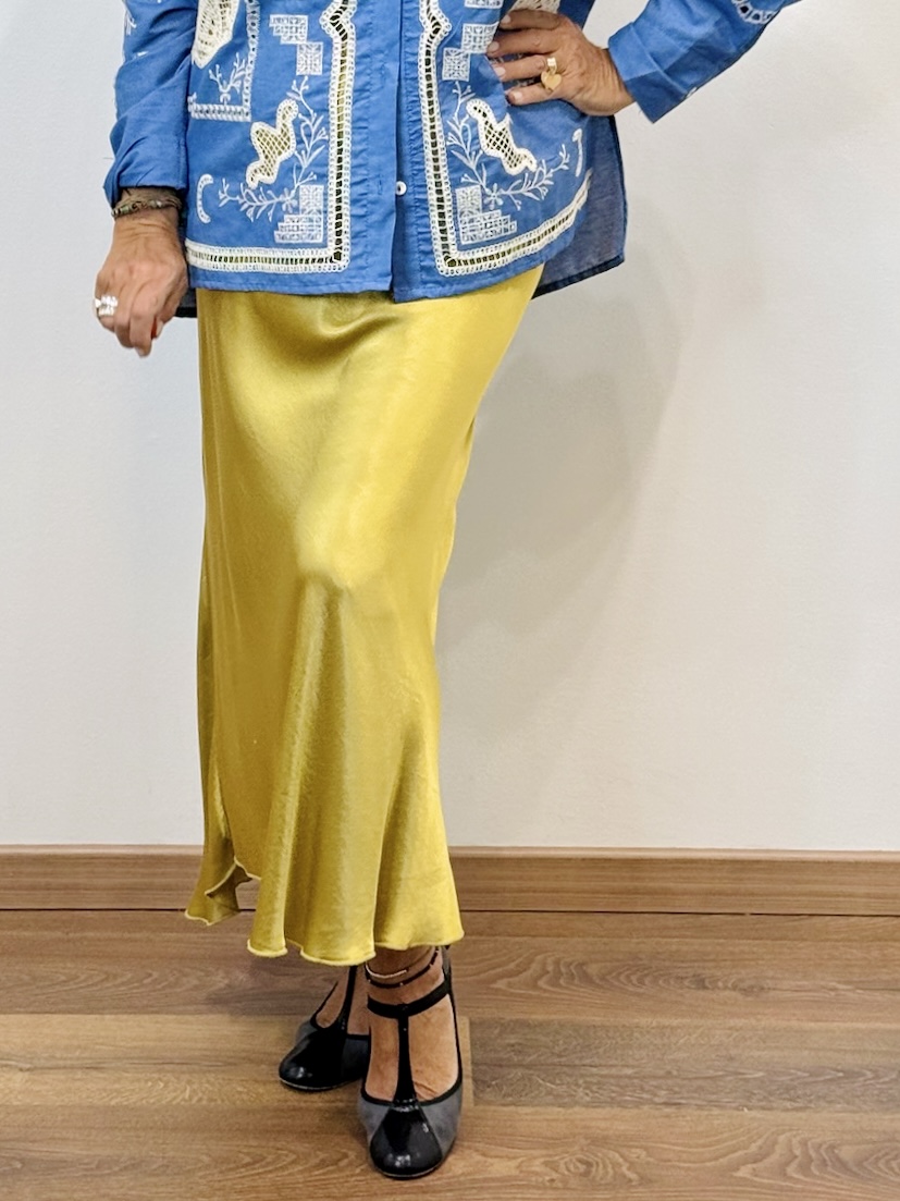 Gonna a sirena in raso di viscosa con elastico in vita . È taglia unica e veste fino ad una 48/50.