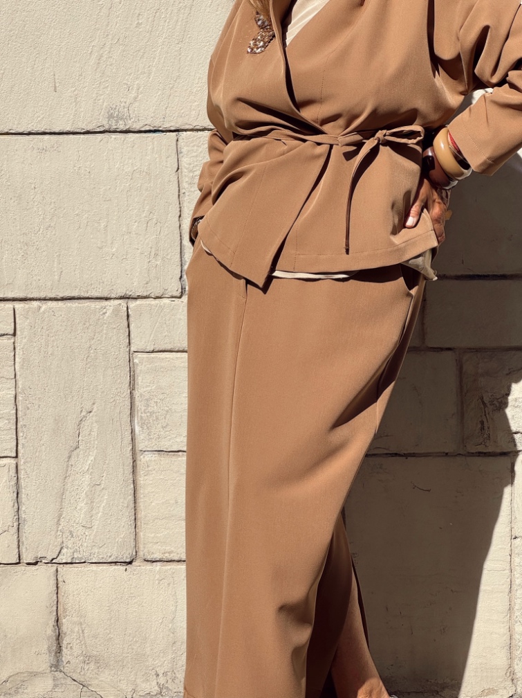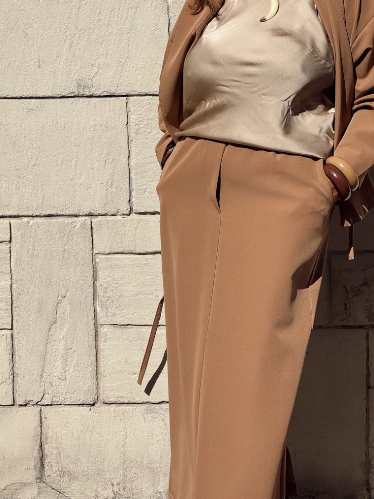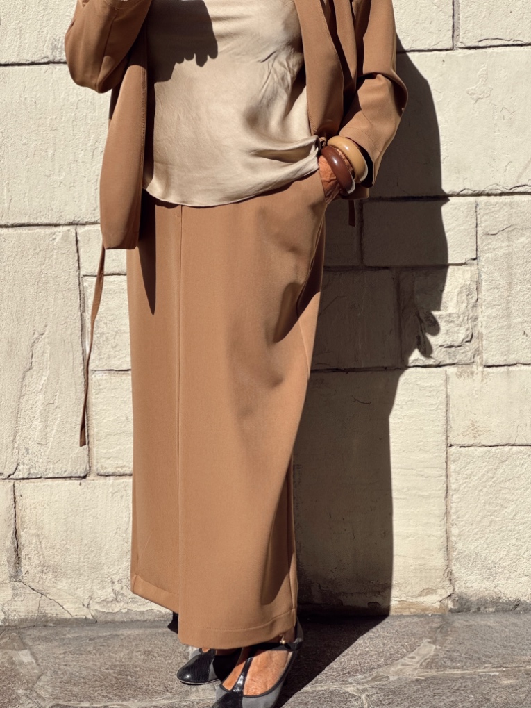 Gonna in cady di viscosa con tasche e passanti per cinturina, elastico in vita e spacco posteriore. È  un nostro modello originale realizzato interamente a mano dal nostro laboratorio . È realizzabile fino a 130 cm di fianco.