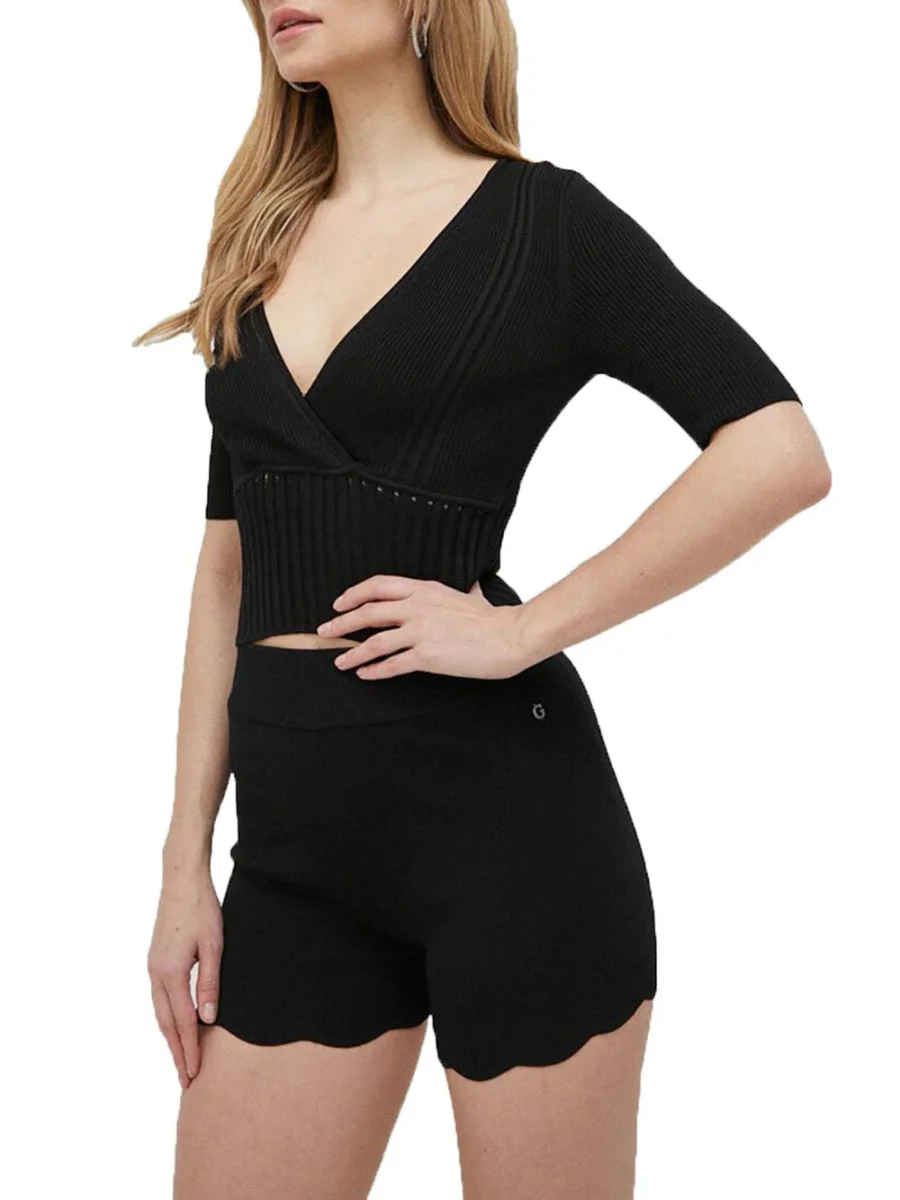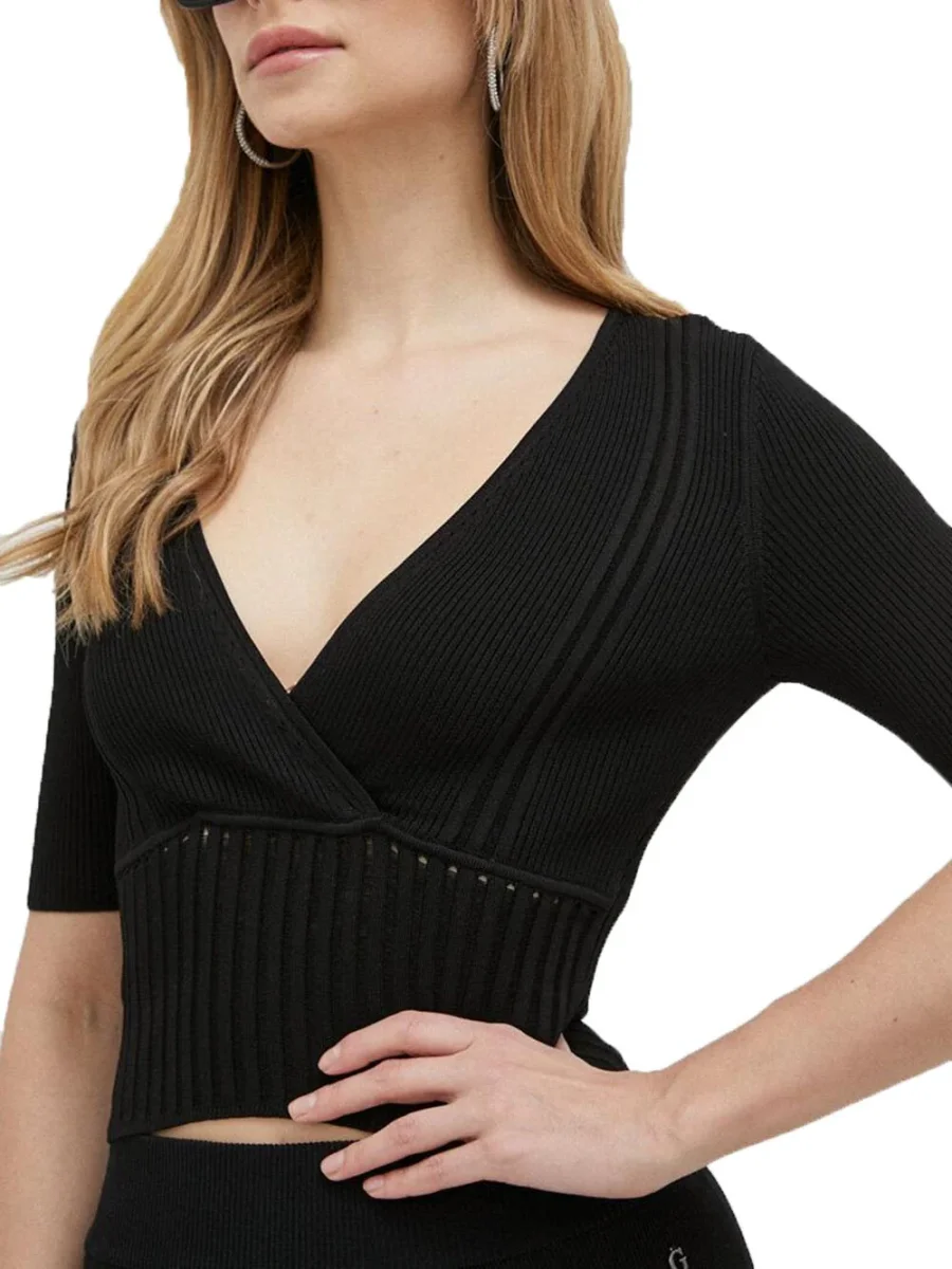 Maglia Top Guess Rib V Neck da donna in filato di misto viscosa e poliammide lavorato a costine, a manica corta, con profondo scollo a V incrociato sul seno, dettaglio traforo a bordo fascia a coste sotto seno e micro monogramma in metallo applicato sul retro collo
