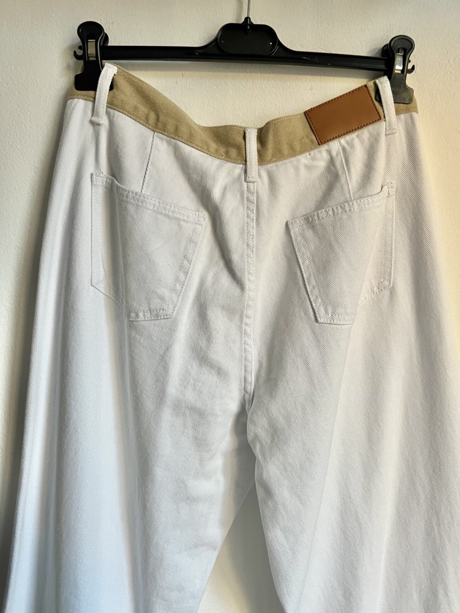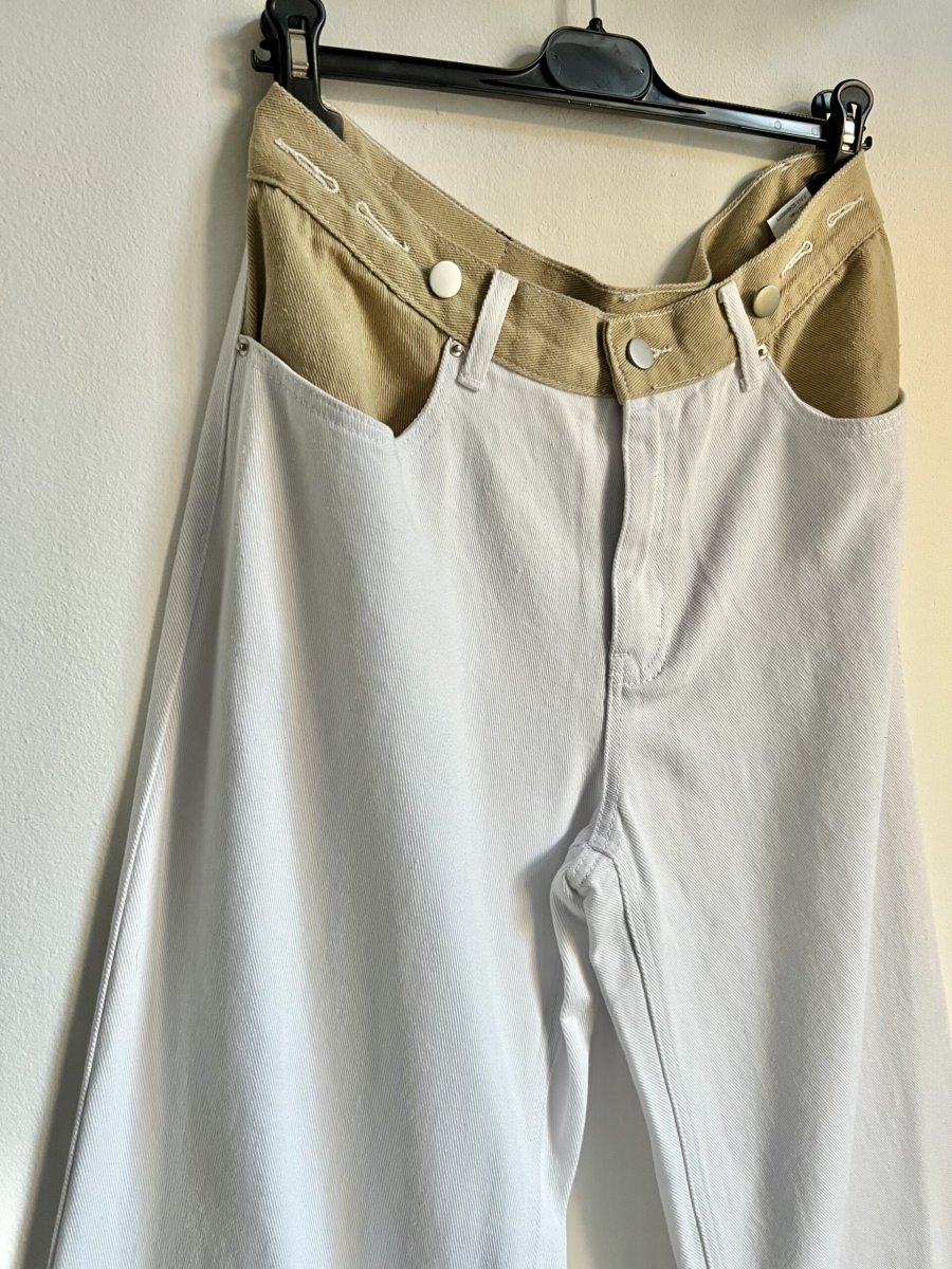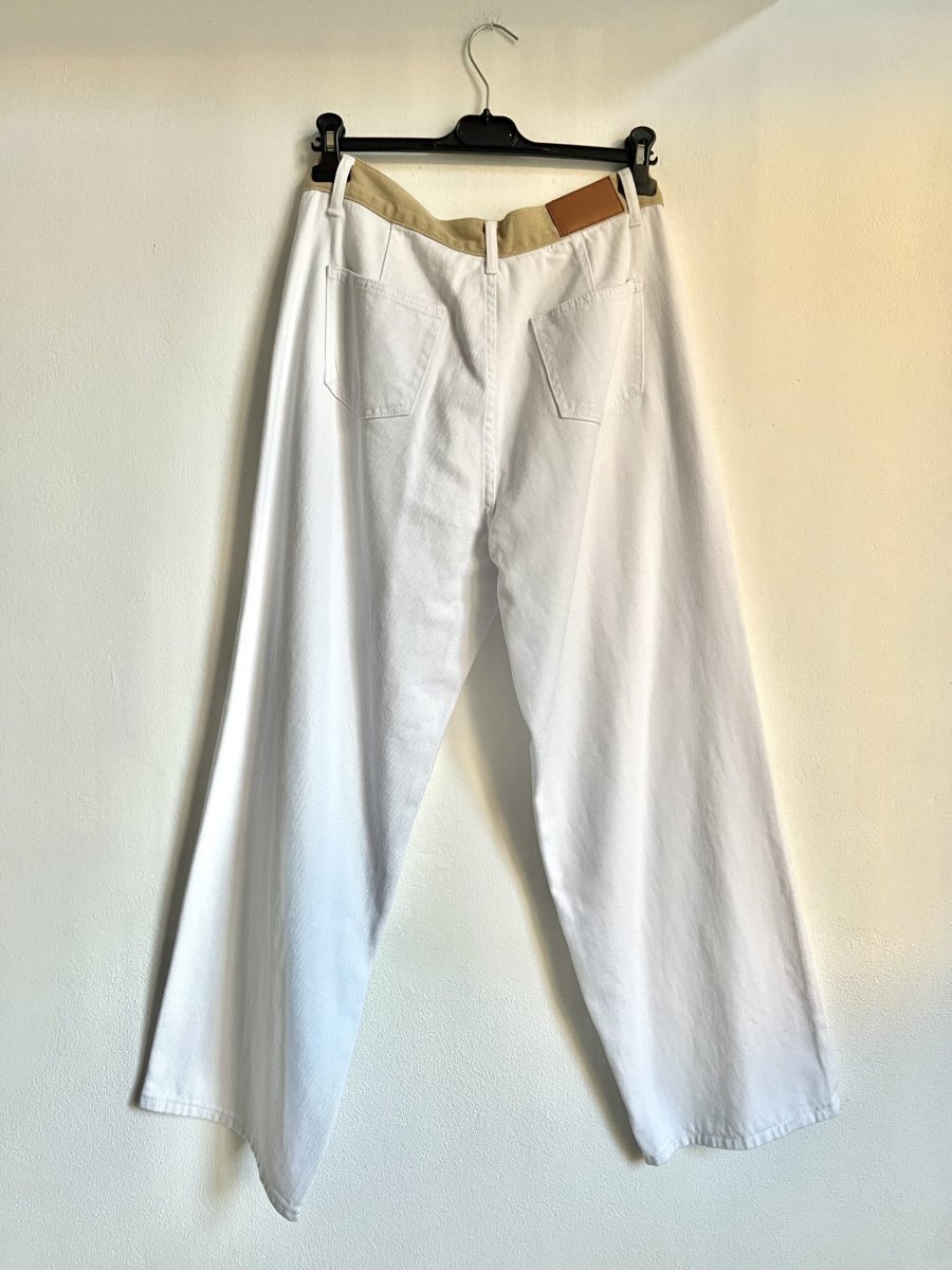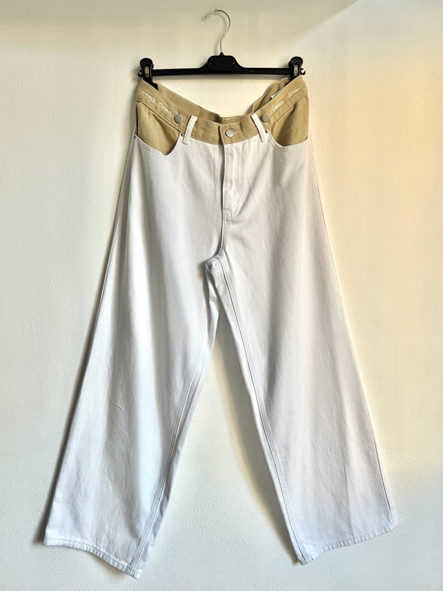 Jeans in denim b-colore con chiusura classica tratte cerniera e bottone. La sua particolarità sono i bottoni e le asole lungo la vita, che permettono di poterlo stringere sulla propria figura. Ha una vestibilità morbida