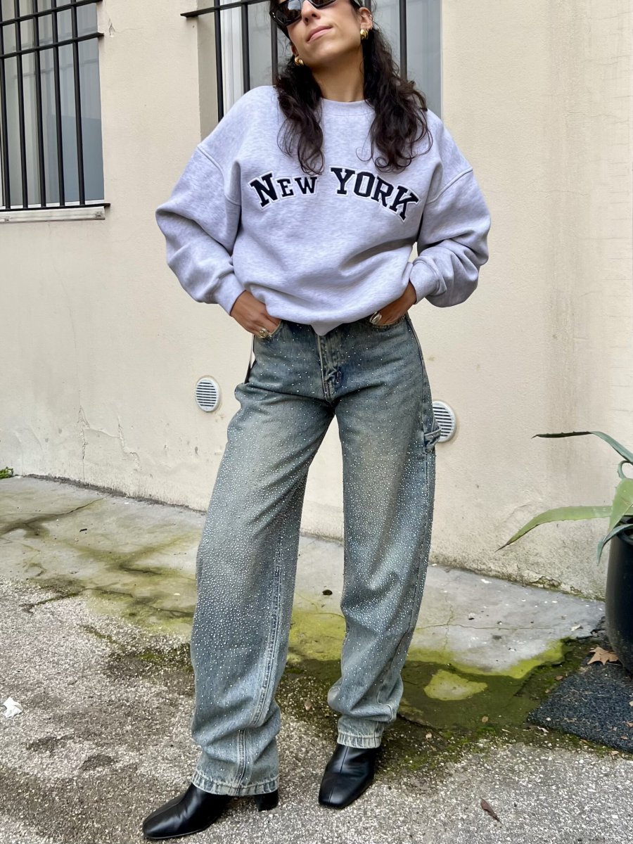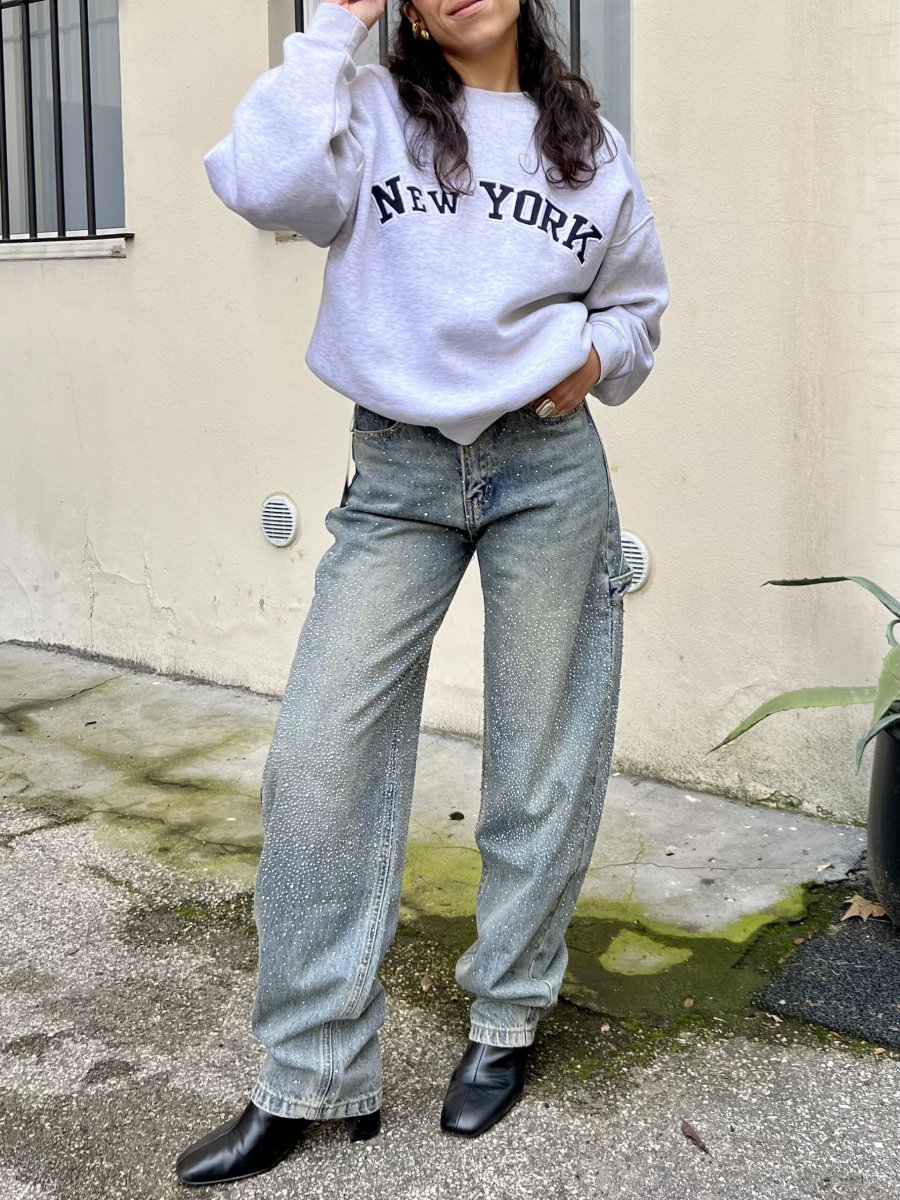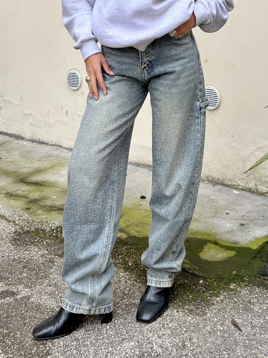 Jeans sabbiato mechanic style con gambe a barile tempestate da strass davanti e dietro. Ha una vestibilità normale.