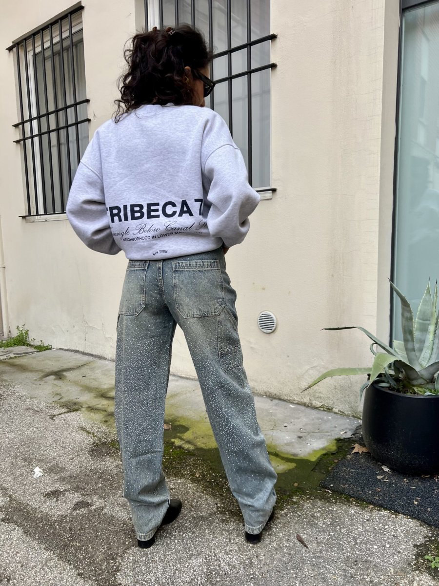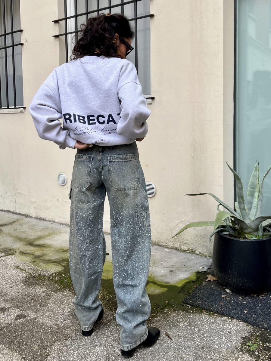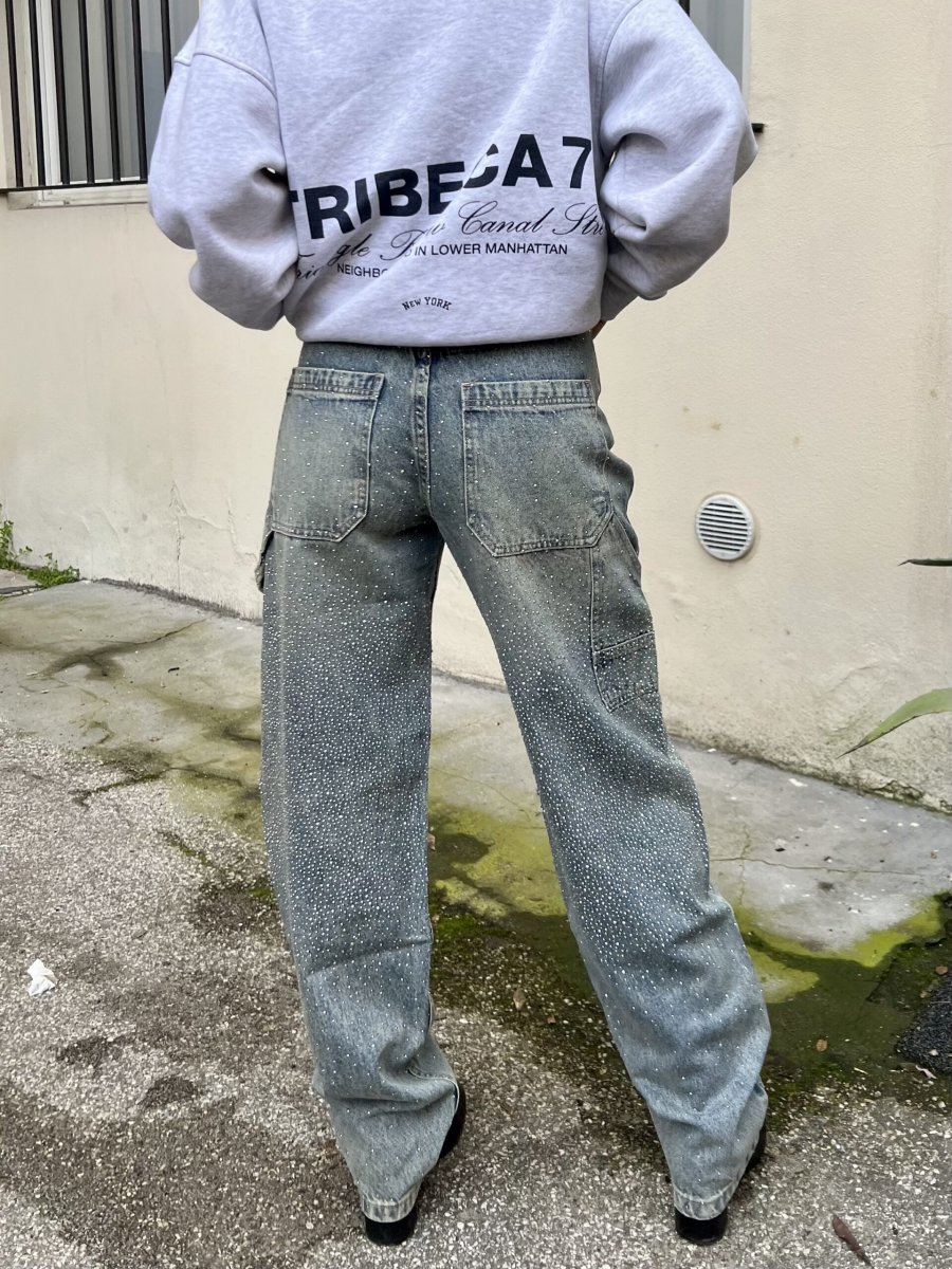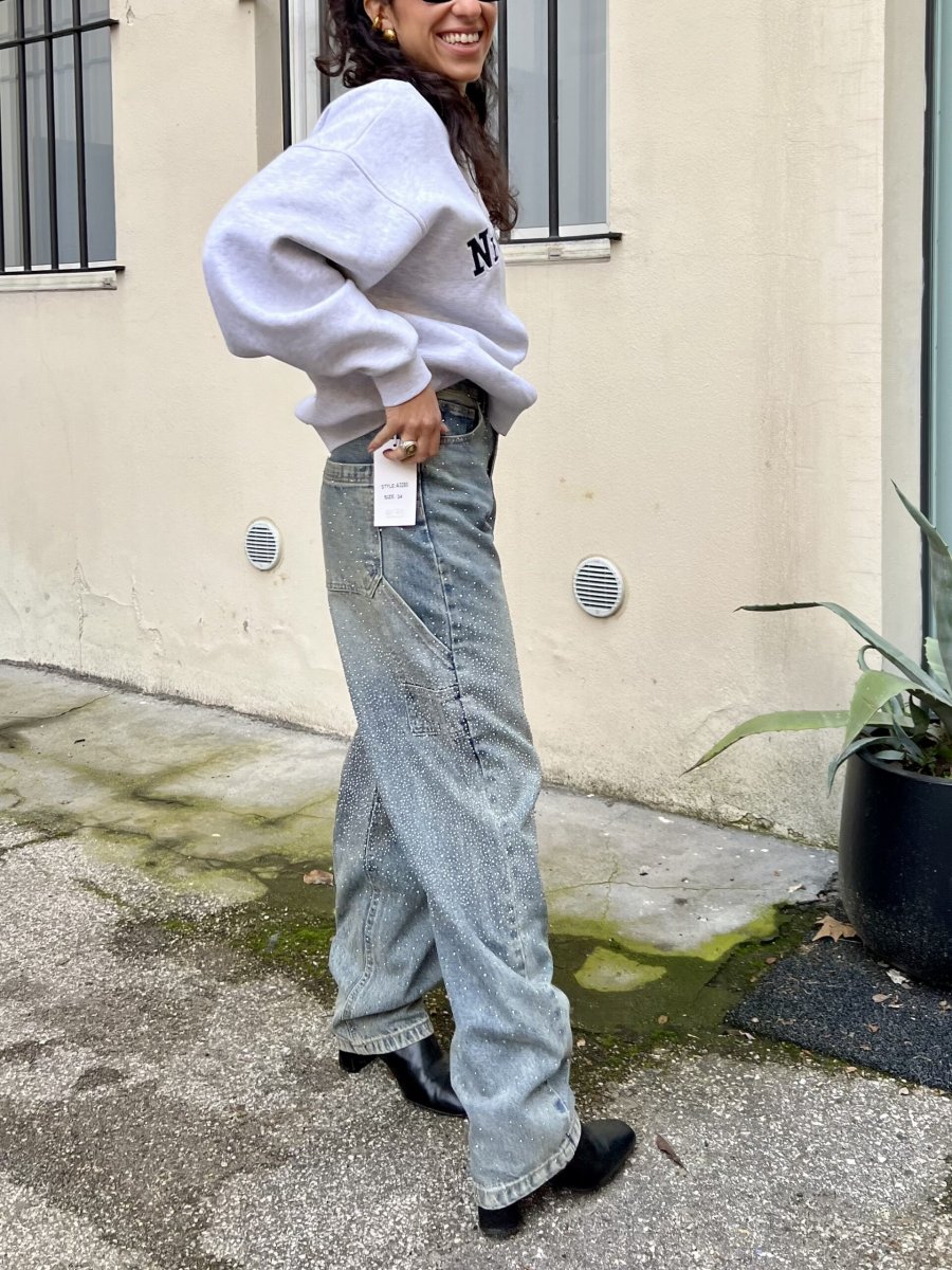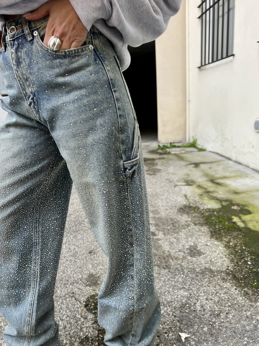 Jeans sabbiato mechanic style con gambe a barile tempestate da strass davanti e dietro.
