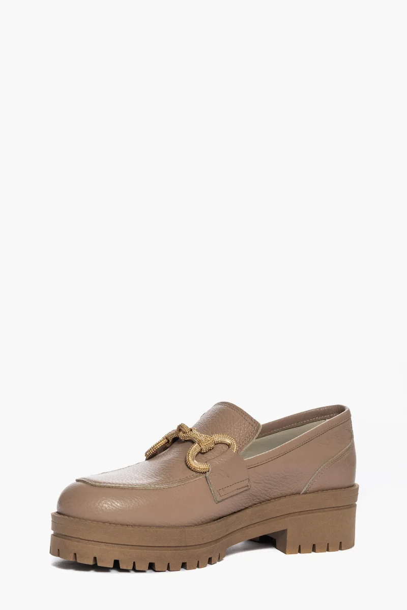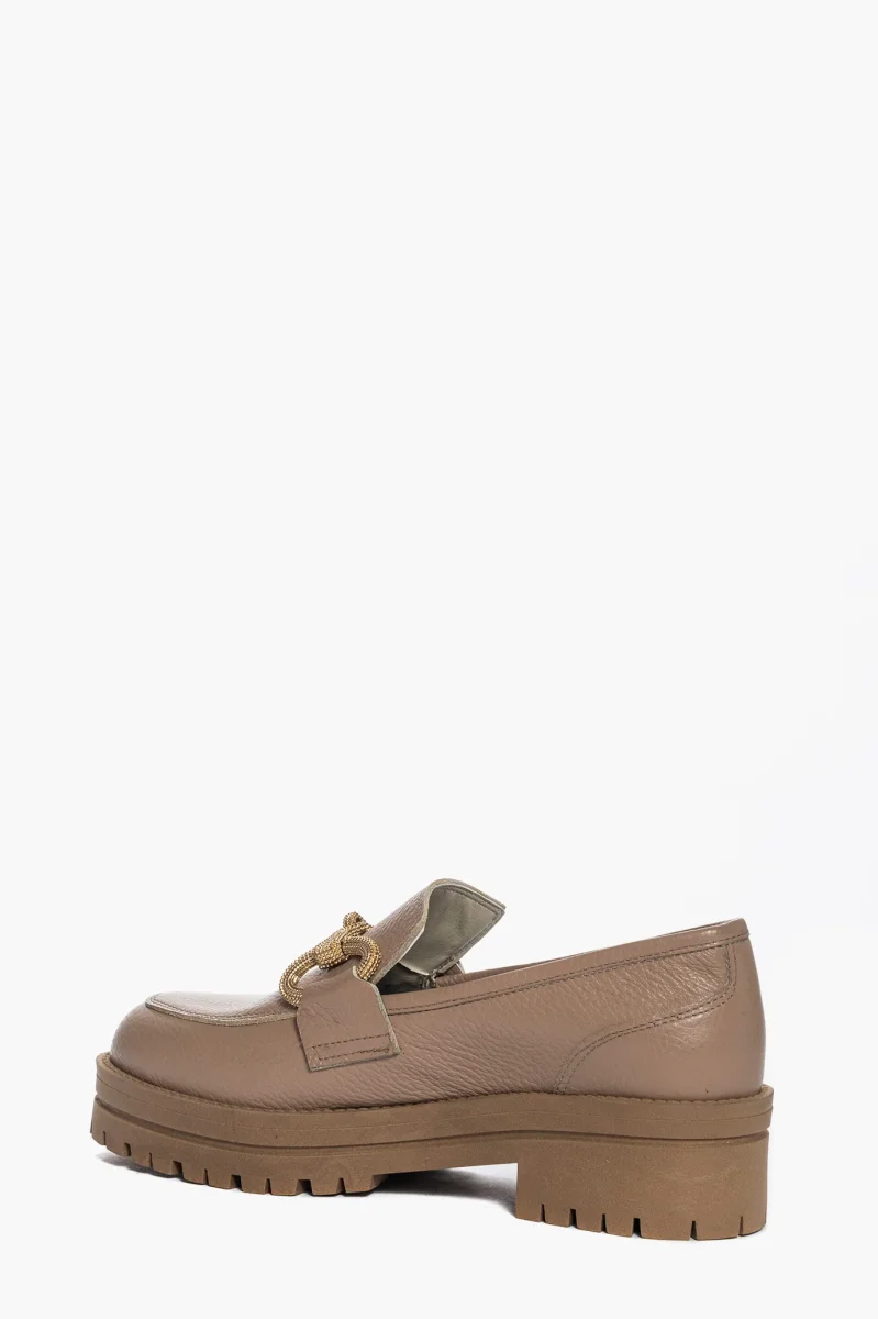 Mocassino in pelle fango, con bocca di leone nella parte superiore, fibbia decorativa, suola in gomma fango, altezza 5 cm, interni e sottopiede in similpelle. Calzano comode, si consiglia per chi avesse la mezza misura di prendere un numero in meno. Calzature realizzate in modo artigianale, rigorosamente Made in Italy.