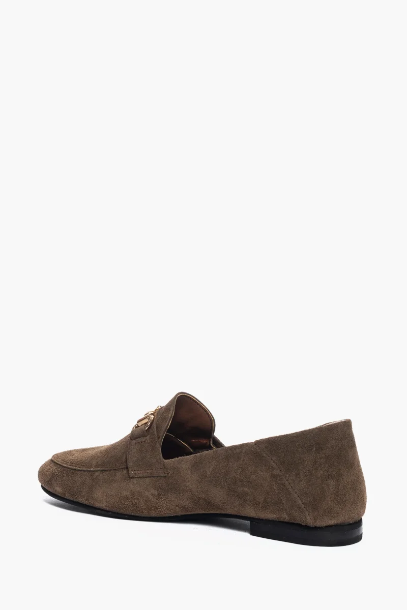Mocassino in camoscio cioccolato, morsetto nel colore oro, interni e sottopiede in similpelle, suola in thunit neutra spazzolata, tacco altezza 3. Calzano regolari, comode e facili da mettere per qualsiasi occasione o outfit. Calzature realizzate in modo artigianale, rigorosamente Made in Italy.