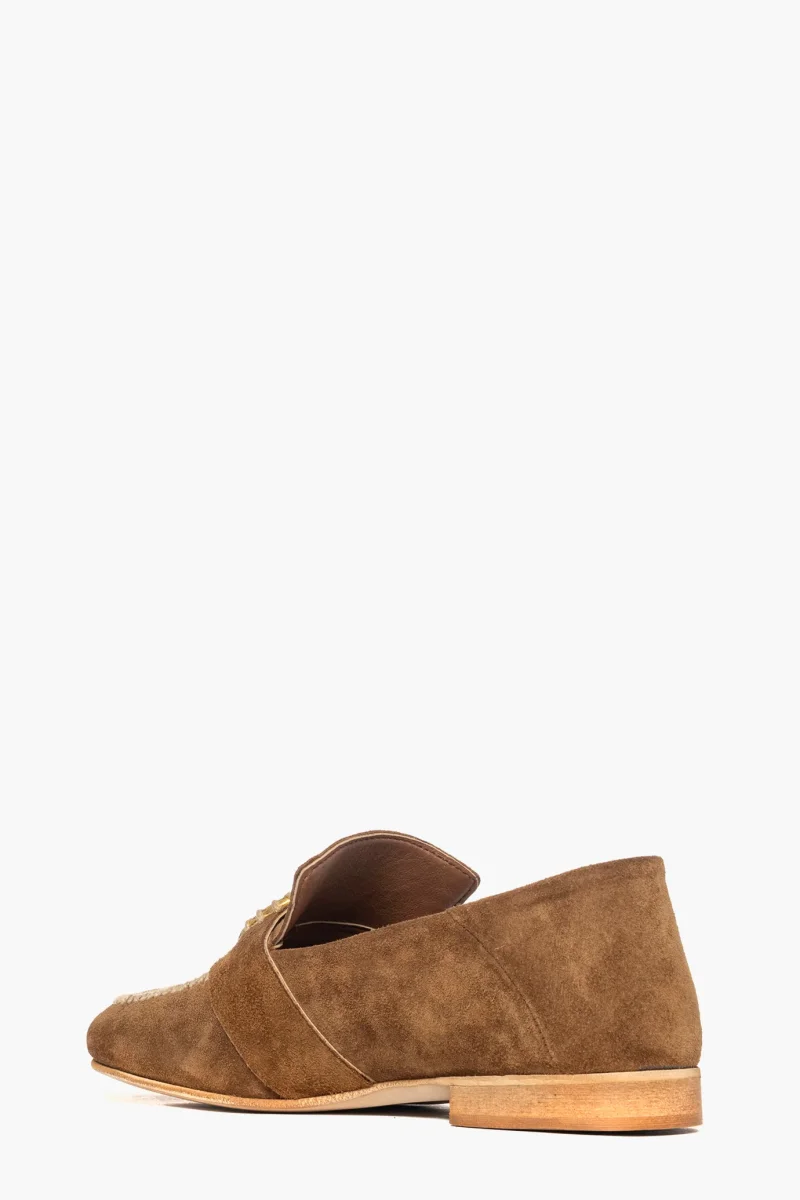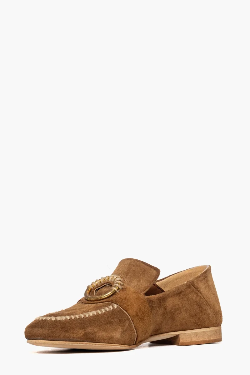 Mocassino in camoscio cuoio, con infilatura a mano e accessorio nel colore oro, interni e sottopiede in similpelle, suola in tunit neutra spazzolata, tacco altezza 3. Calzano regolari, Calzature realizzate in modo artigianale, rigorosamente Made in Italy.