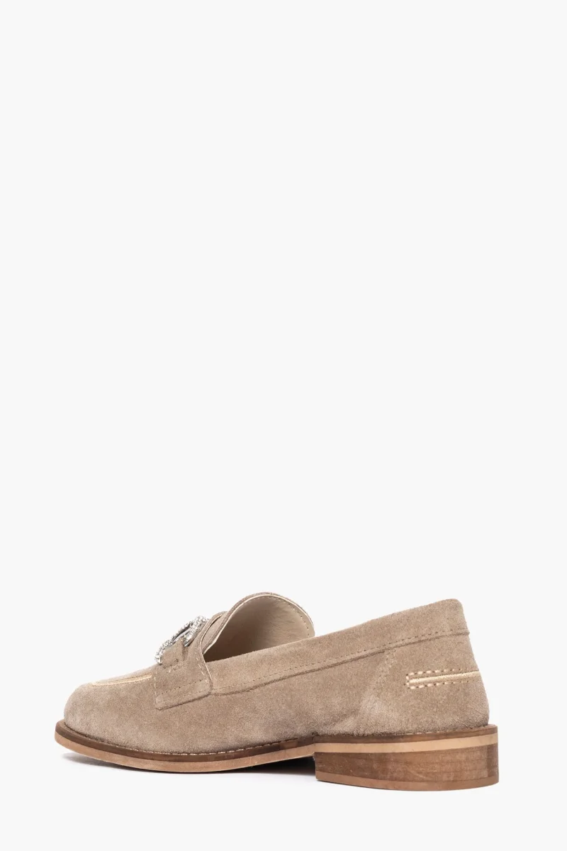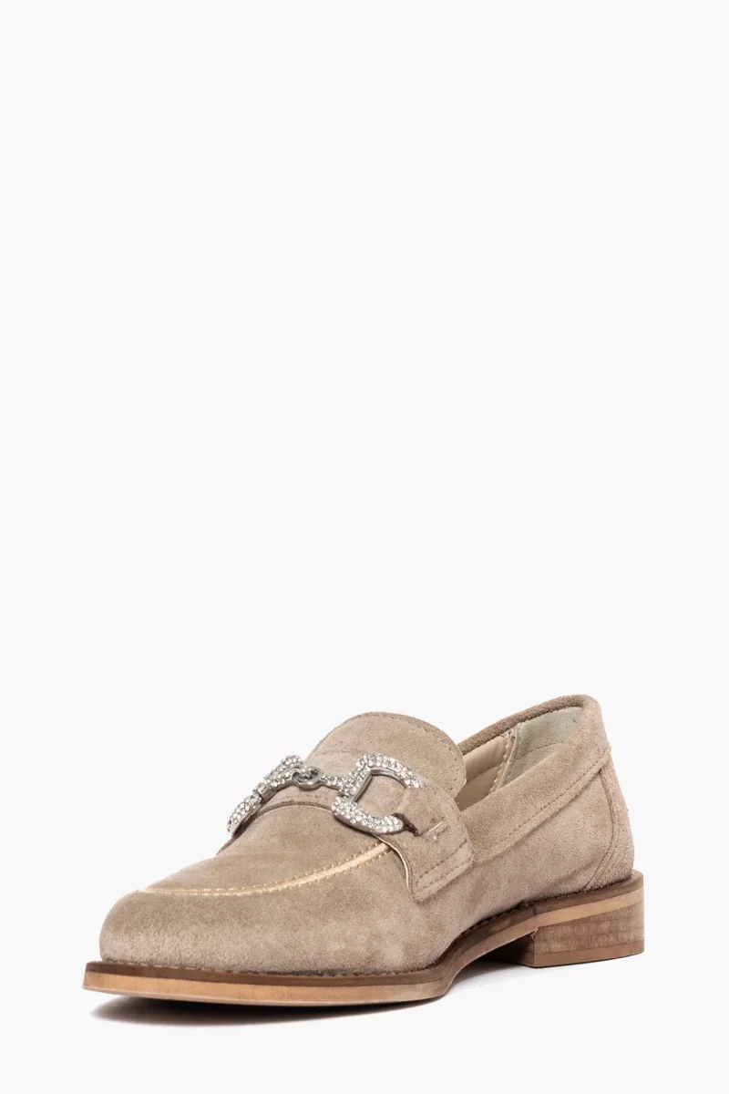 Mocassino in camoscio taupè con ricamo Monique lux, morsetto nel colore argento e strass. Calzano regolari, interni in similpelle, suola spazzolata, altezza 3.5, sottopiede interno con ricamo Lia Diva. Calzature realizzate in modo artigianale, rigorosamente Made in Italy.
