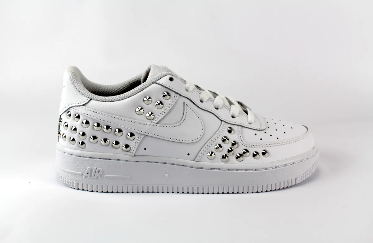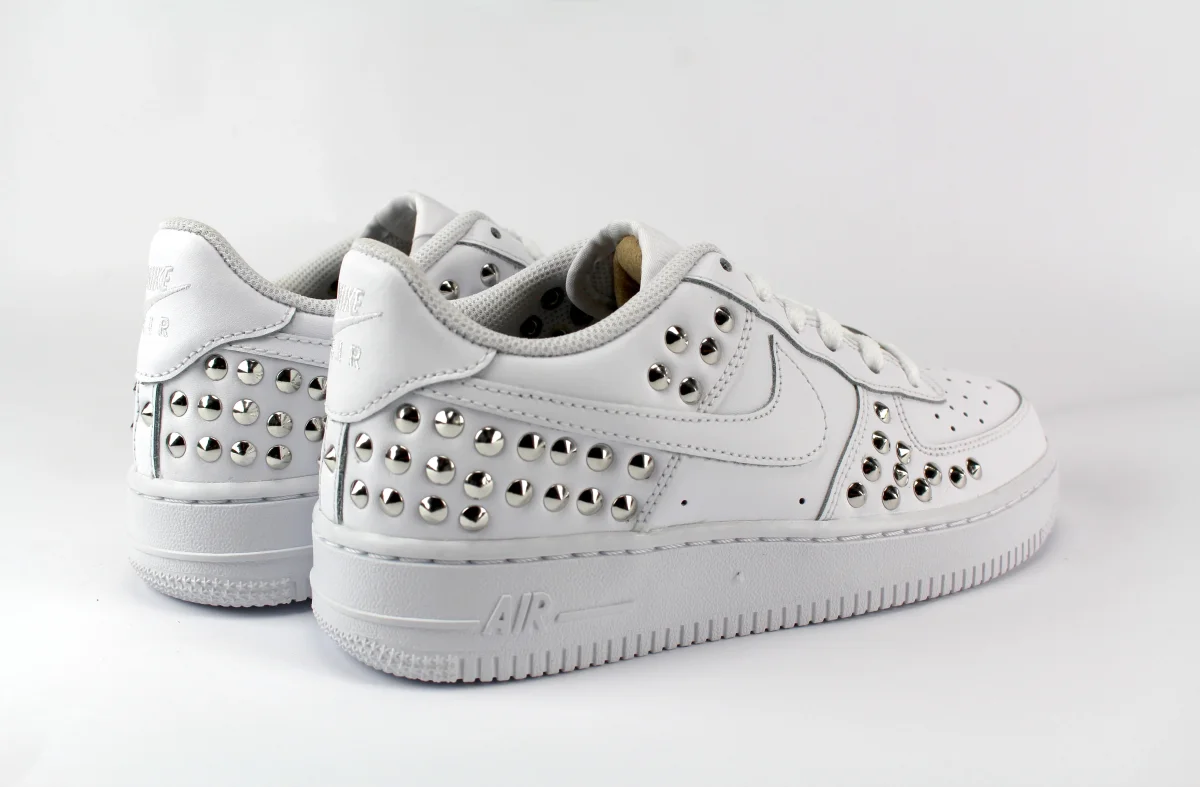 Scarpe originali Nike Air Force 1 personalizzate a mano con applicazione di borchie argento sulle pareti laterali.