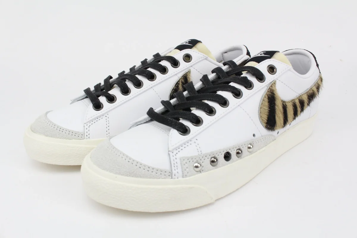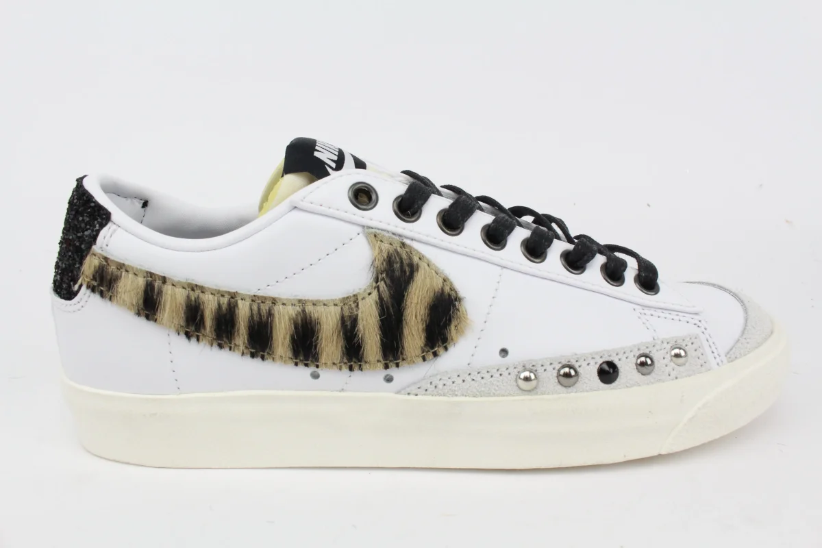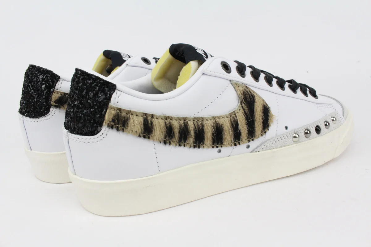Sneakers originali Nike W Blazer LOW ’77 base bianca con il celebre logo Nike in Zebra tonalità Cappuccino , abbinate borchie nere, argento e canna di fucile ed impreziosita da tallone Nero Glitter.