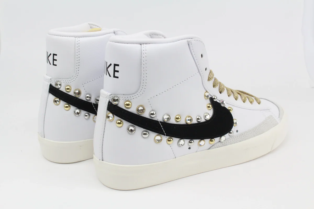 Sneakers originali Nike W Blazer Mid ’77 bianca con il celebre logo Nike nero personalizzate a mano, baffo nero originale borchie e strass intorno.