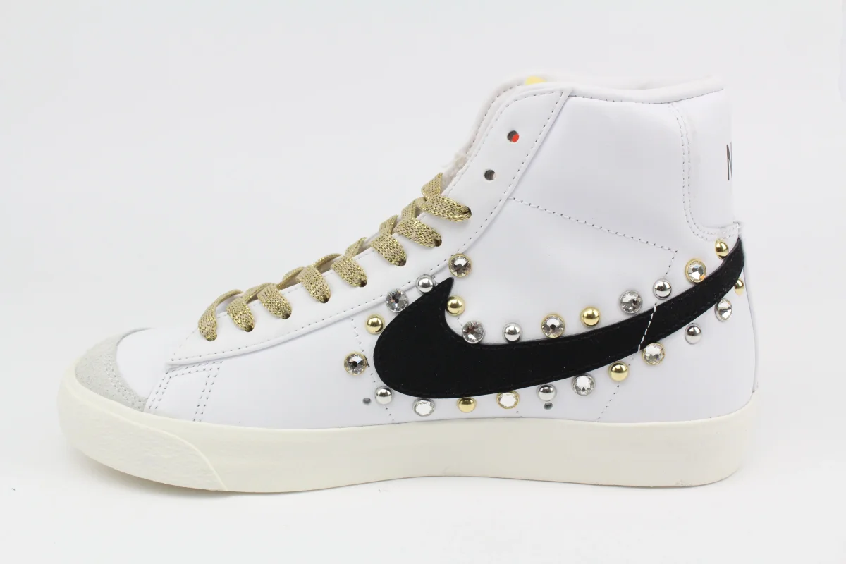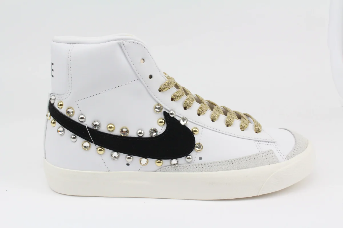 Sneakers originali Nike W Blazer Mid ’77 bianca con il celebre logo Nike nero personalizzate a mano, baffo nero originale borchie e strass intorno. Laccio Oro piatti. Ogni imperfezione è frutto del lavoro svolto artigianalmente.