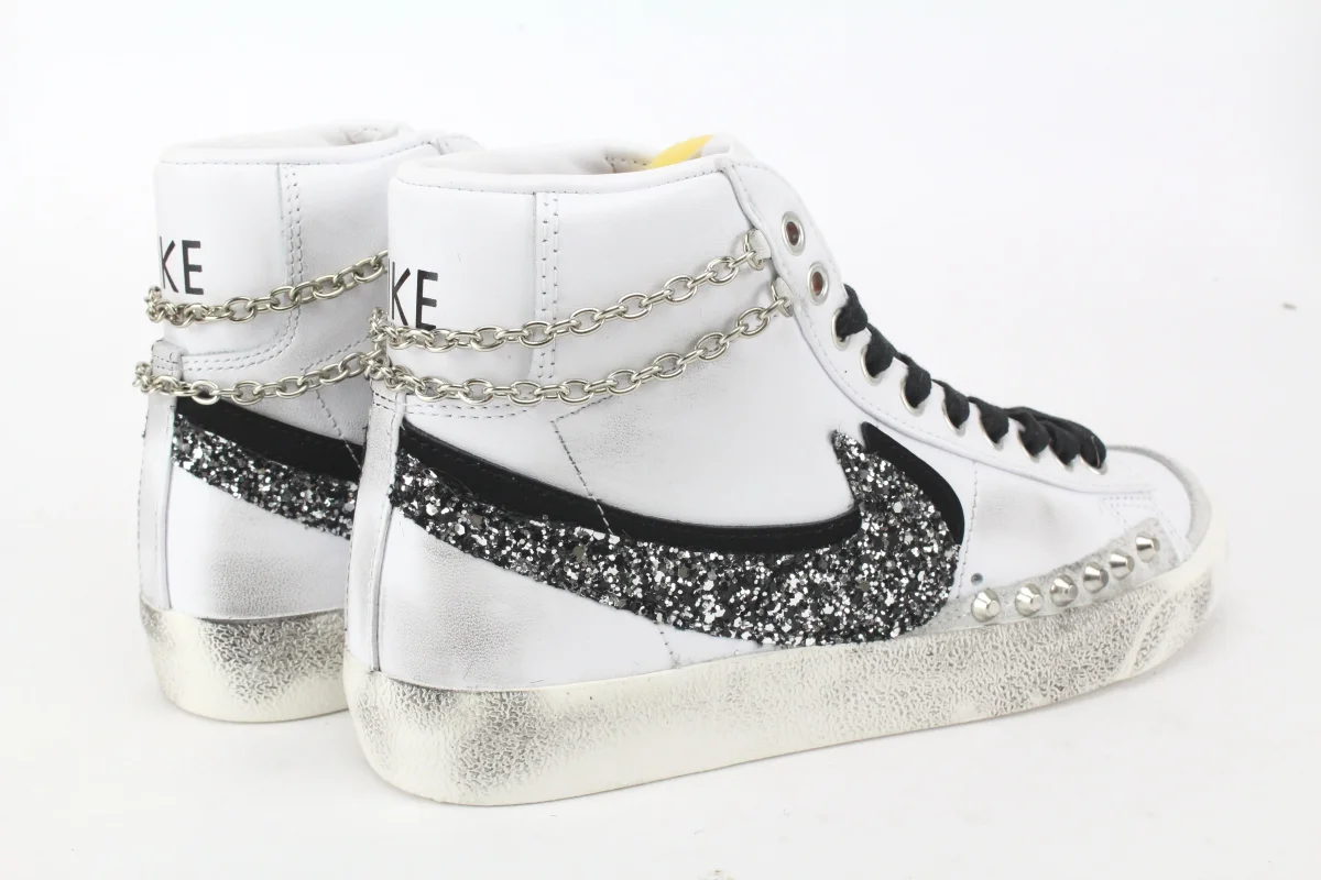 Sneakers originali Nike W Blazer Mid ’77 bianca con il celebre logo Nike nero personalizzate a mano con doppio baffo nero originale e Glitter Argento, borchie e applicazione di catena.