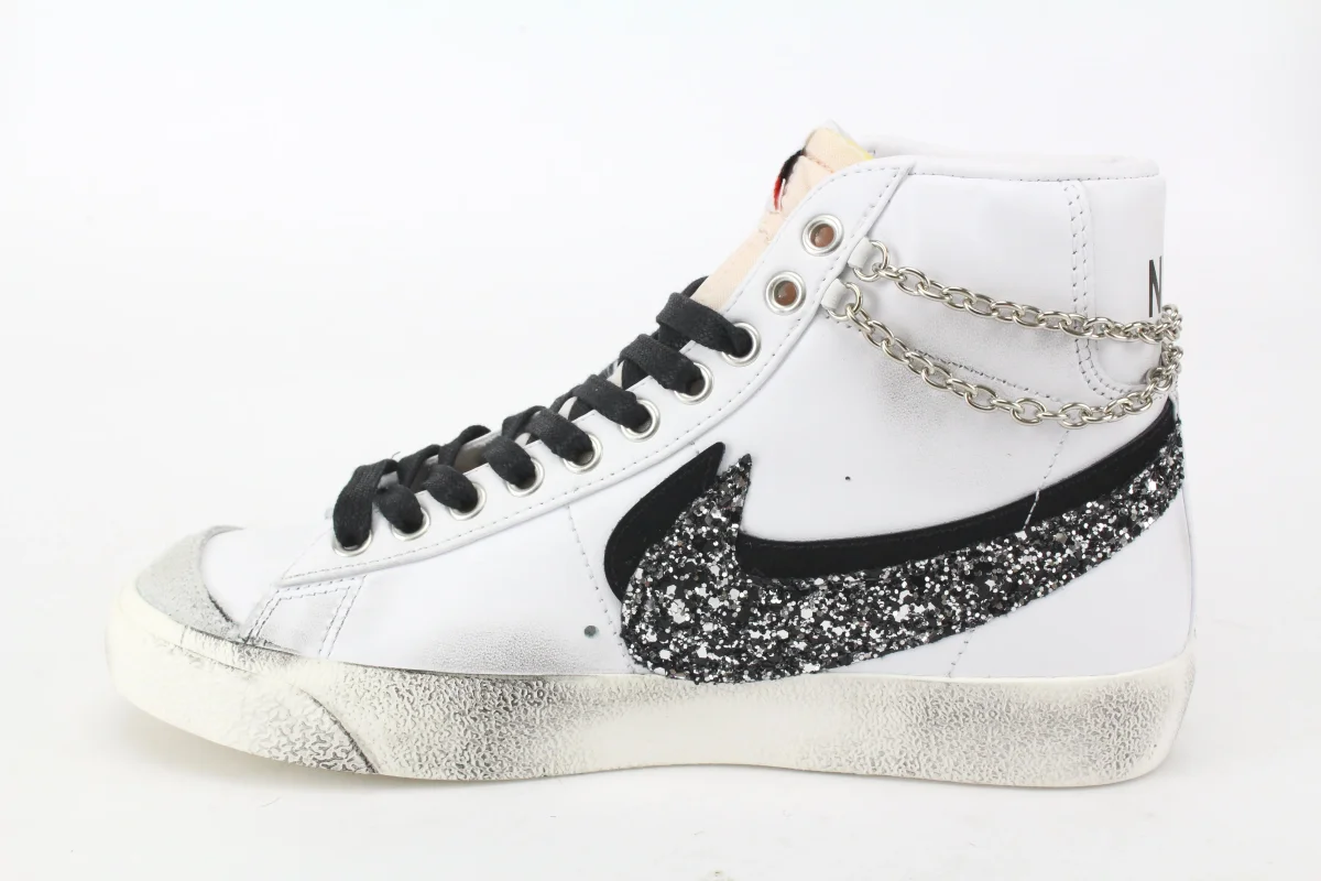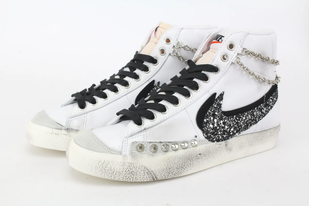 Sneakers originali Nike W Blazer Mid ’77 bianca con il celebre logo Nike nero personalizzate a mano con doppio baffo nero originale e Glitter Argento, borchie e applicazione di catena. Fondo e la tomaia effetto Vintage. Laccio Nero Ogni imperfezione è frutto del lavoro svolto artigianalmente.