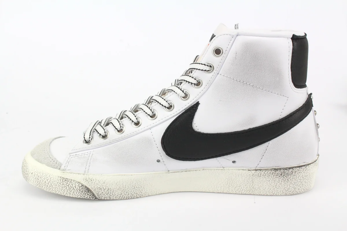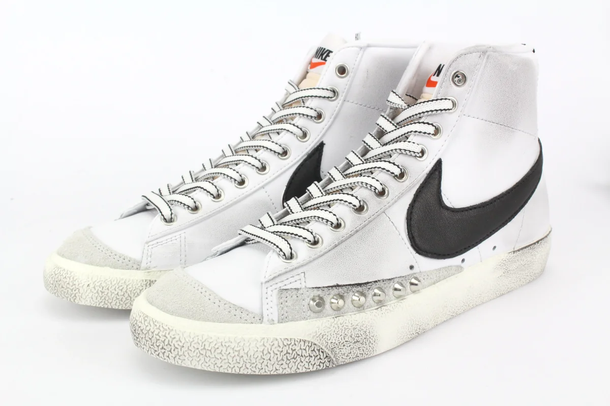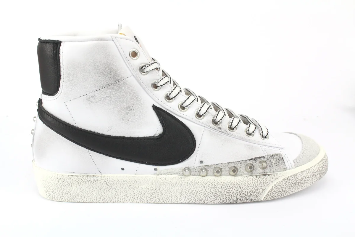 Sneakers originali Nike W Blazer Mid ’77 bianca personalizzate a mano con tallone e baffo di Pelle Nera , borchie applicate sul tallone e nel fianco esterno.