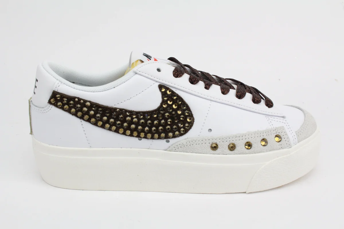 Sneakers originali Nike W Blazer Mid ’77 bianca Platform personalizzate con applicazione esterna di Strass Termosaldati al Baffo Nike , interna Glitter Marrone, impreziosite da applicazione di Strass Grandi esternamente.
